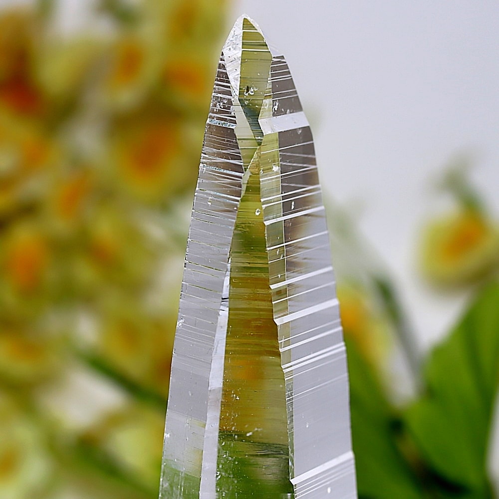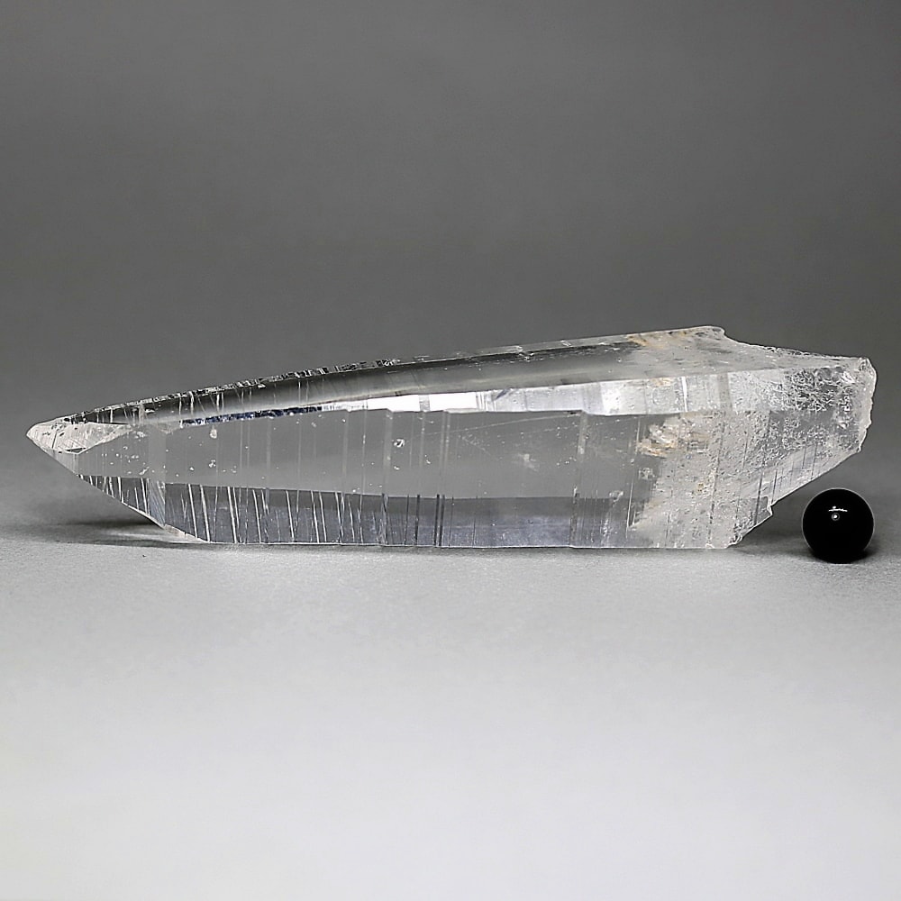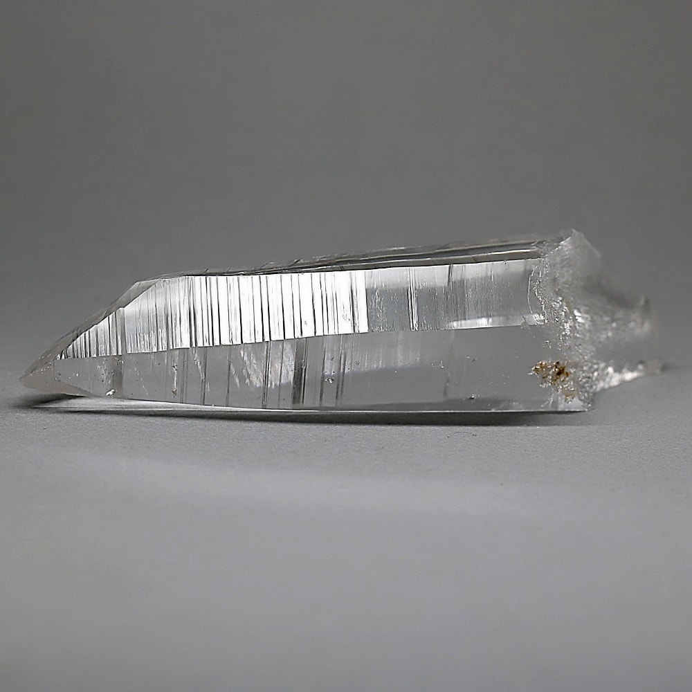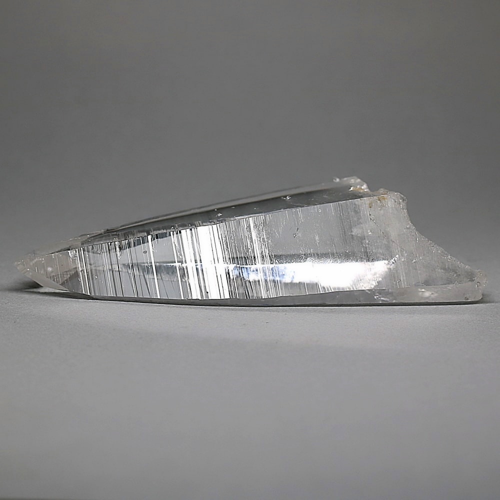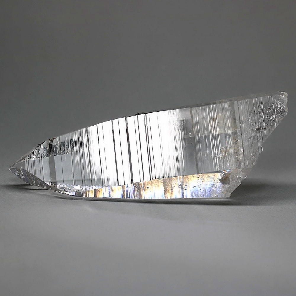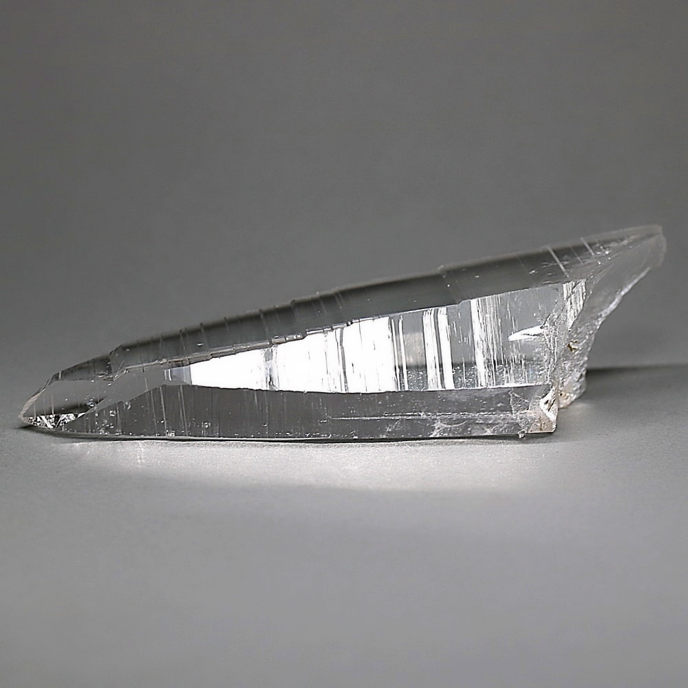氷のように澄みきった透明度を持つ結晶は、まるで人の手で整えられたかのような端正なシルエットを備えており、ファセット欠損も極めて少ない洗練されたディテールが見事です。