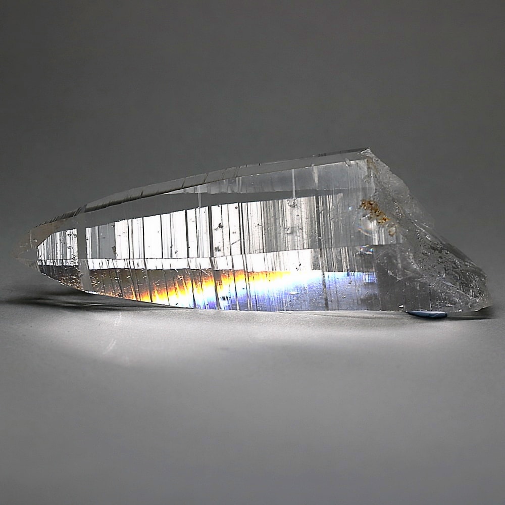 また、透明度抜群の結晶は照りも素晴らしく、角度によって柱面にプリズム効果(レインボー)が現れ、その存在感を一層際立たせております。