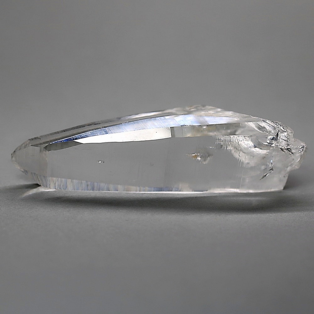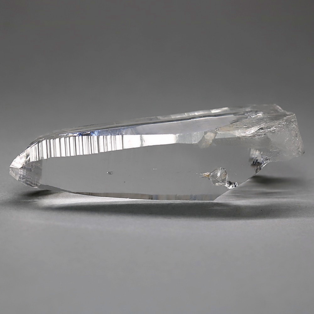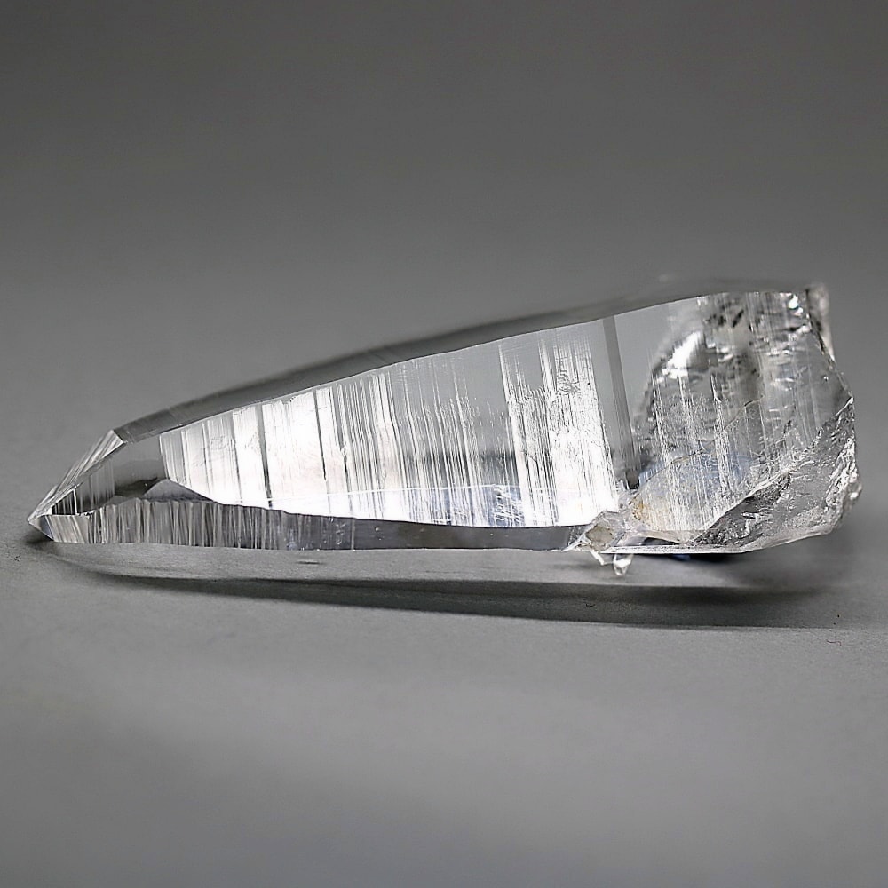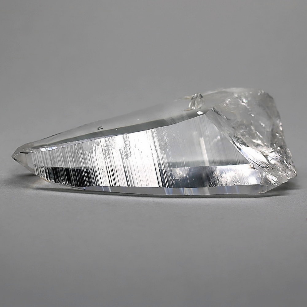氷のように澄みきった透明度を持つ結晶は、まるで人の手で整えられたかのような端正なシルエットを備えており、ファセット欠損も極めて少ない洗練されたディテールが見事です。