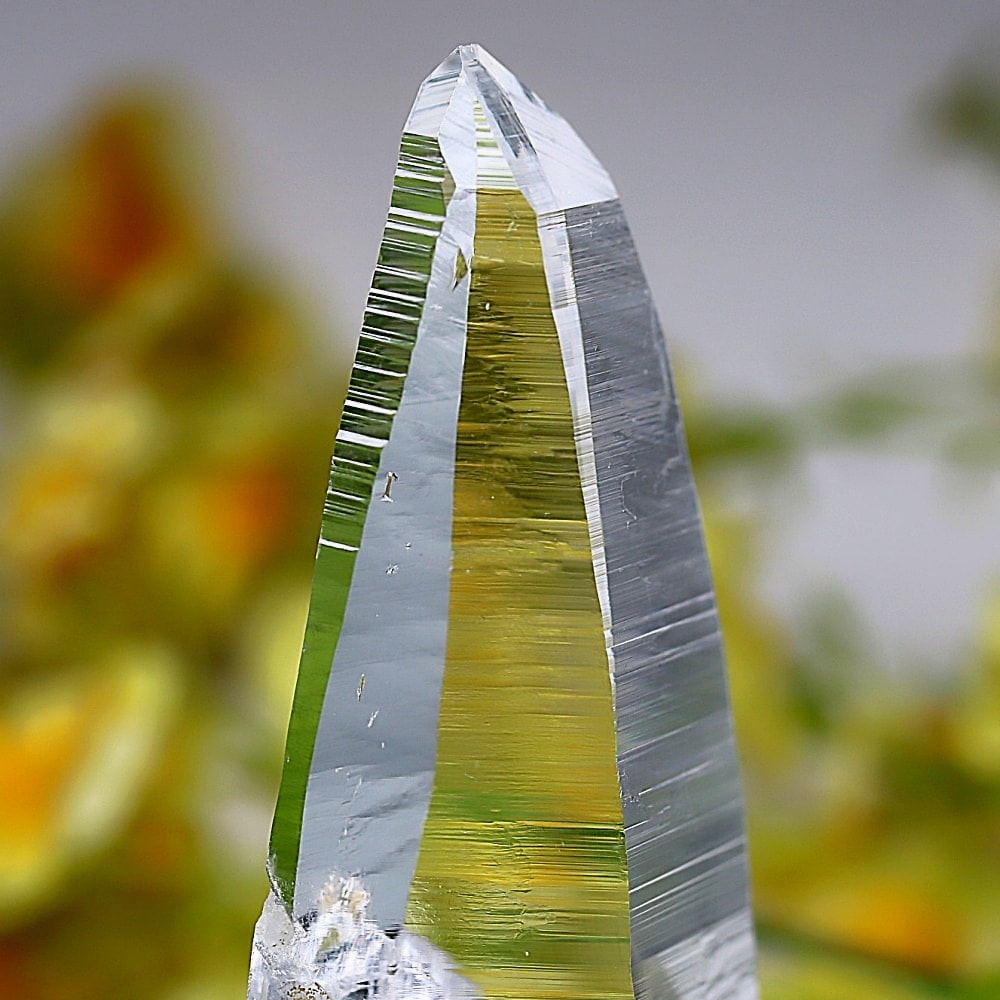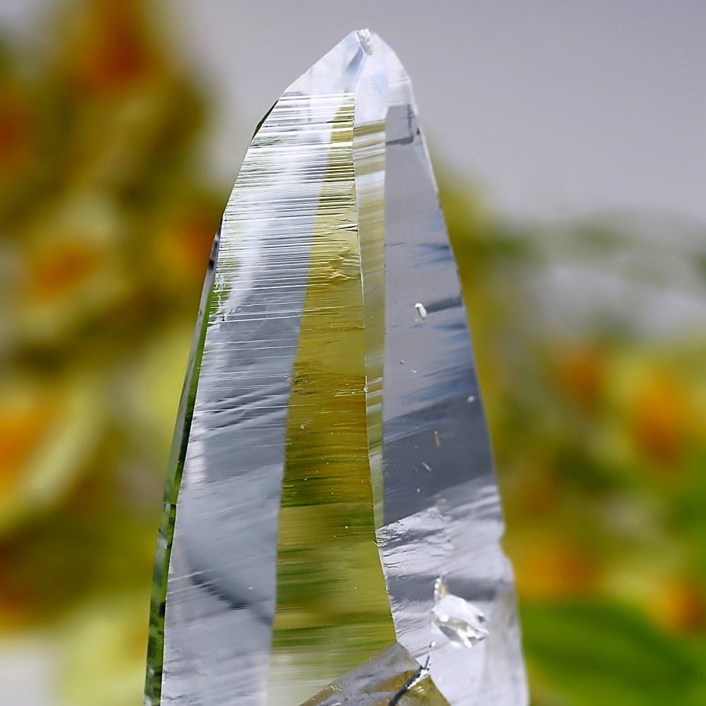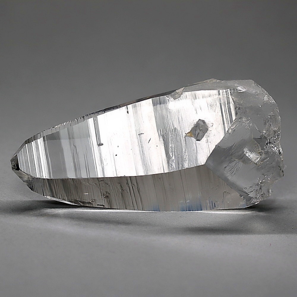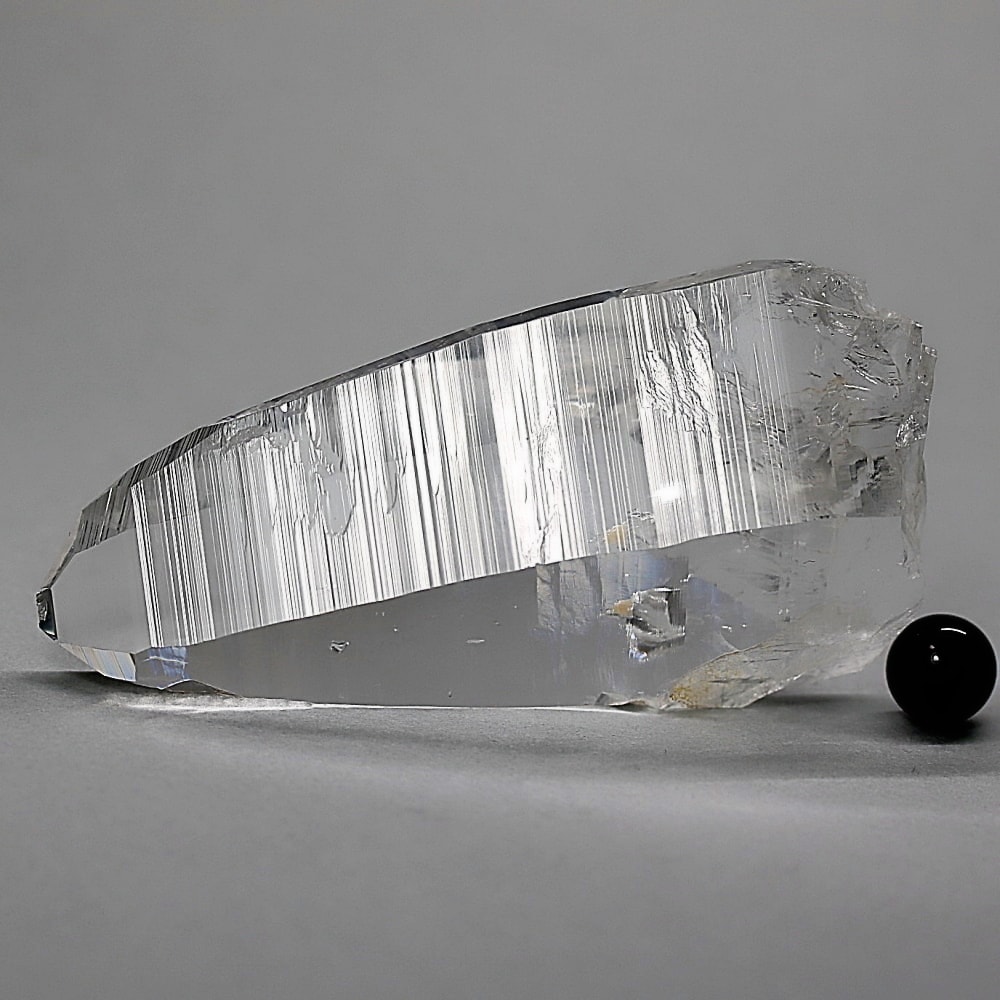 氷のように澄みきった透明度を持つ結晶は、まるで人の手で整えられたかのような端正なシルエットを備えており、ファセット欠損も極めて少ない洗練されたディテールが見事です。