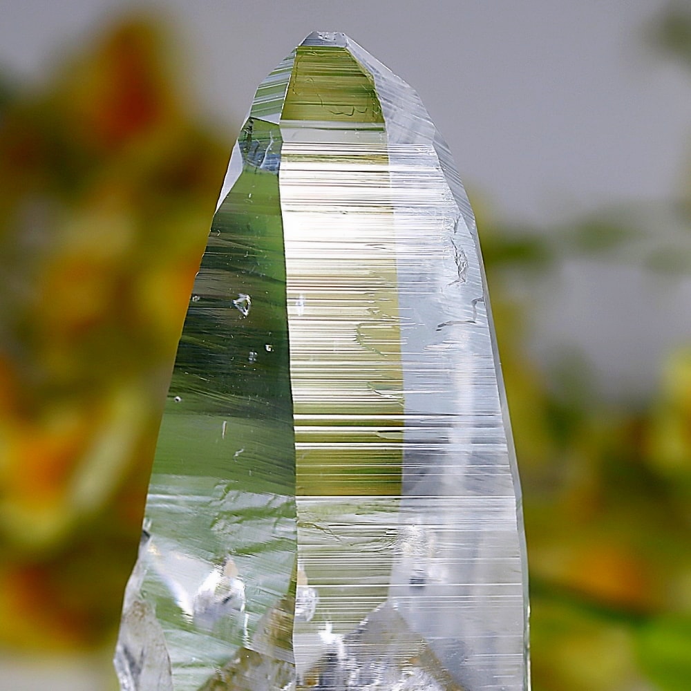 また、透明度抜群の結晶は照りも素晴らしく、角度によって柱面にプリズム効果(レインボー)が現れ、その存在感を一層際立たせております。