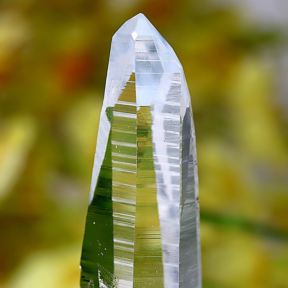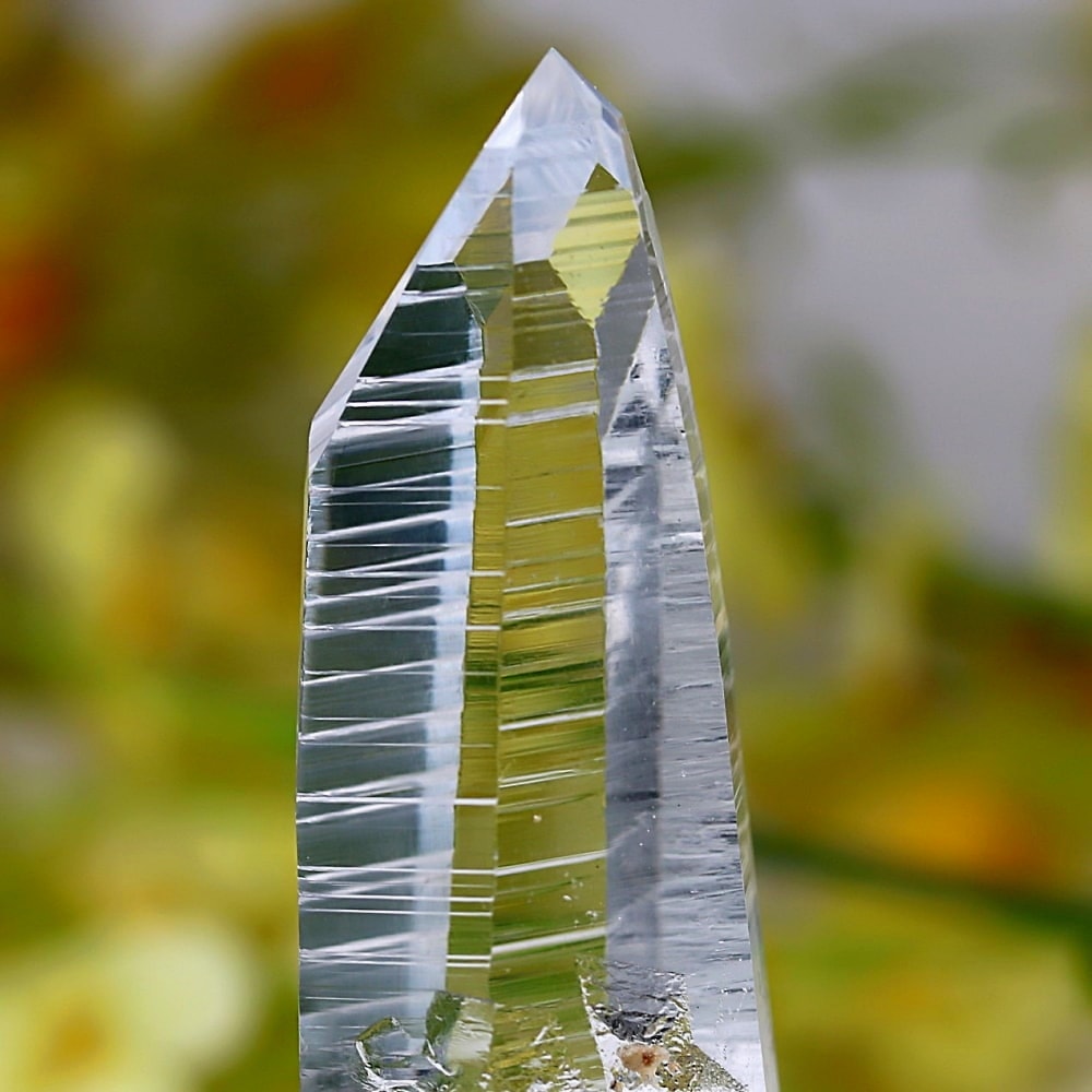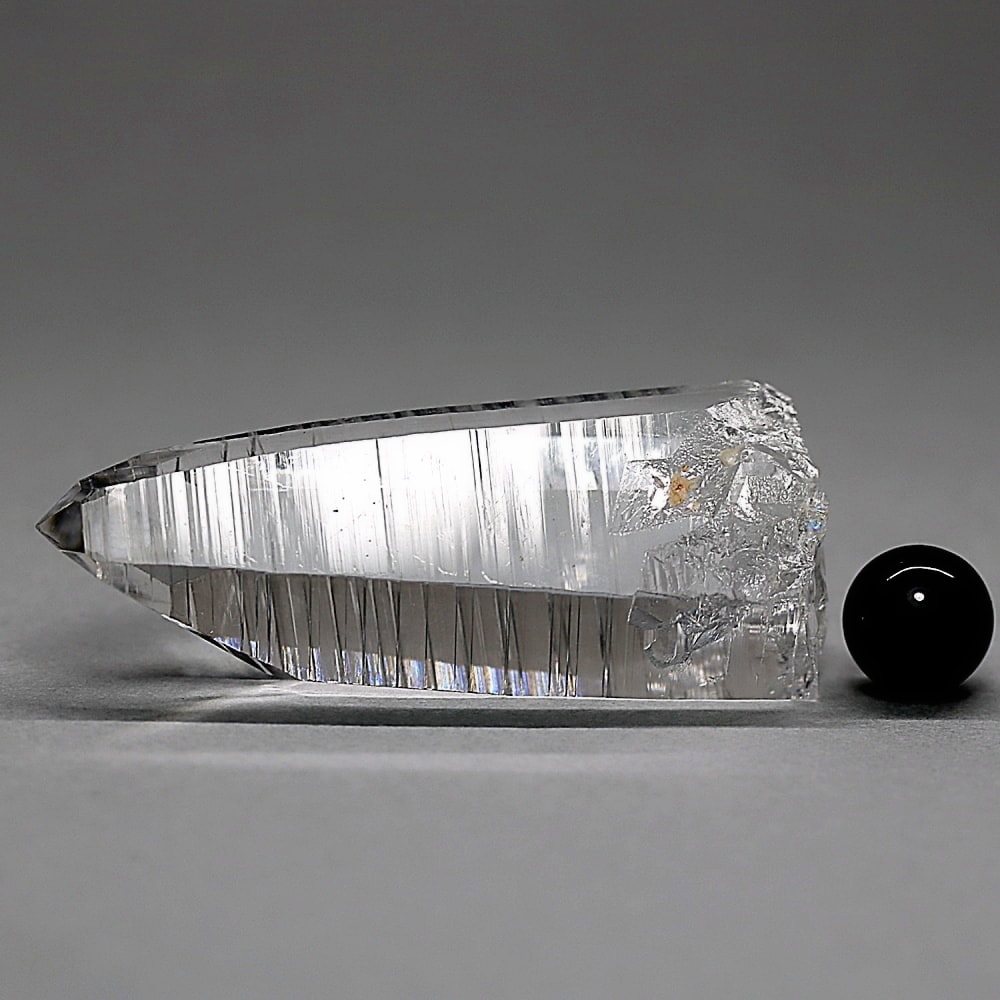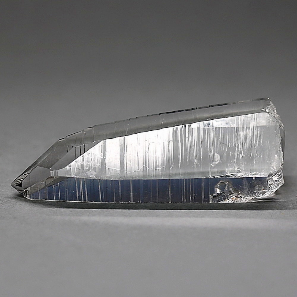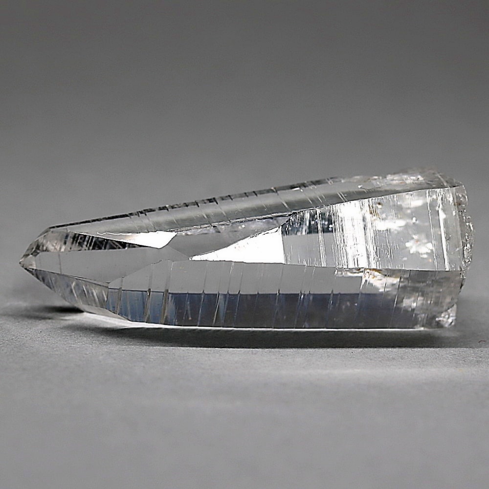 氷のように澄みきった透明度を持つ結晶は、まるで人の手で整えられたかのような端正なシルエットを備えており、ファセット欠損も極めて少ない洗練されたディテールが見事です。