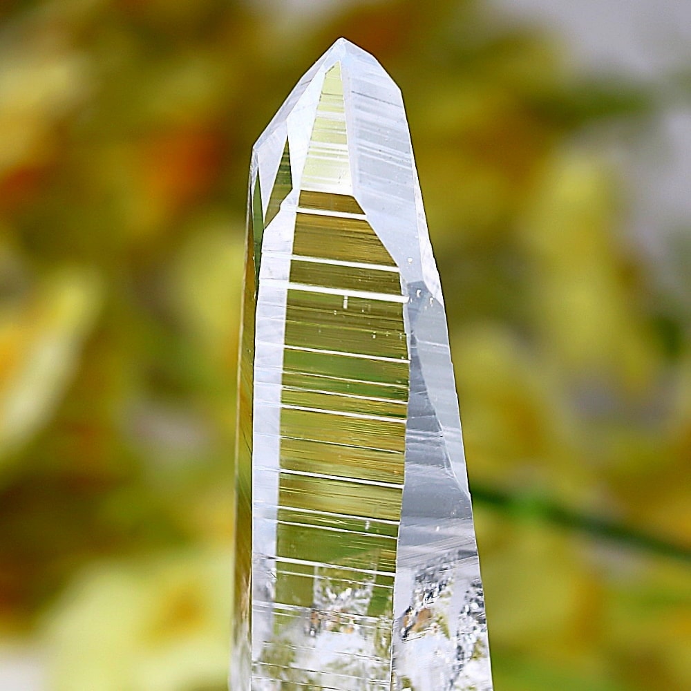 また、透明度抜群の結晶は照りも素晴らしく、角度によって柱面にプリズム効果(レインボー)が現れ、その存在感を一層際立たせております。