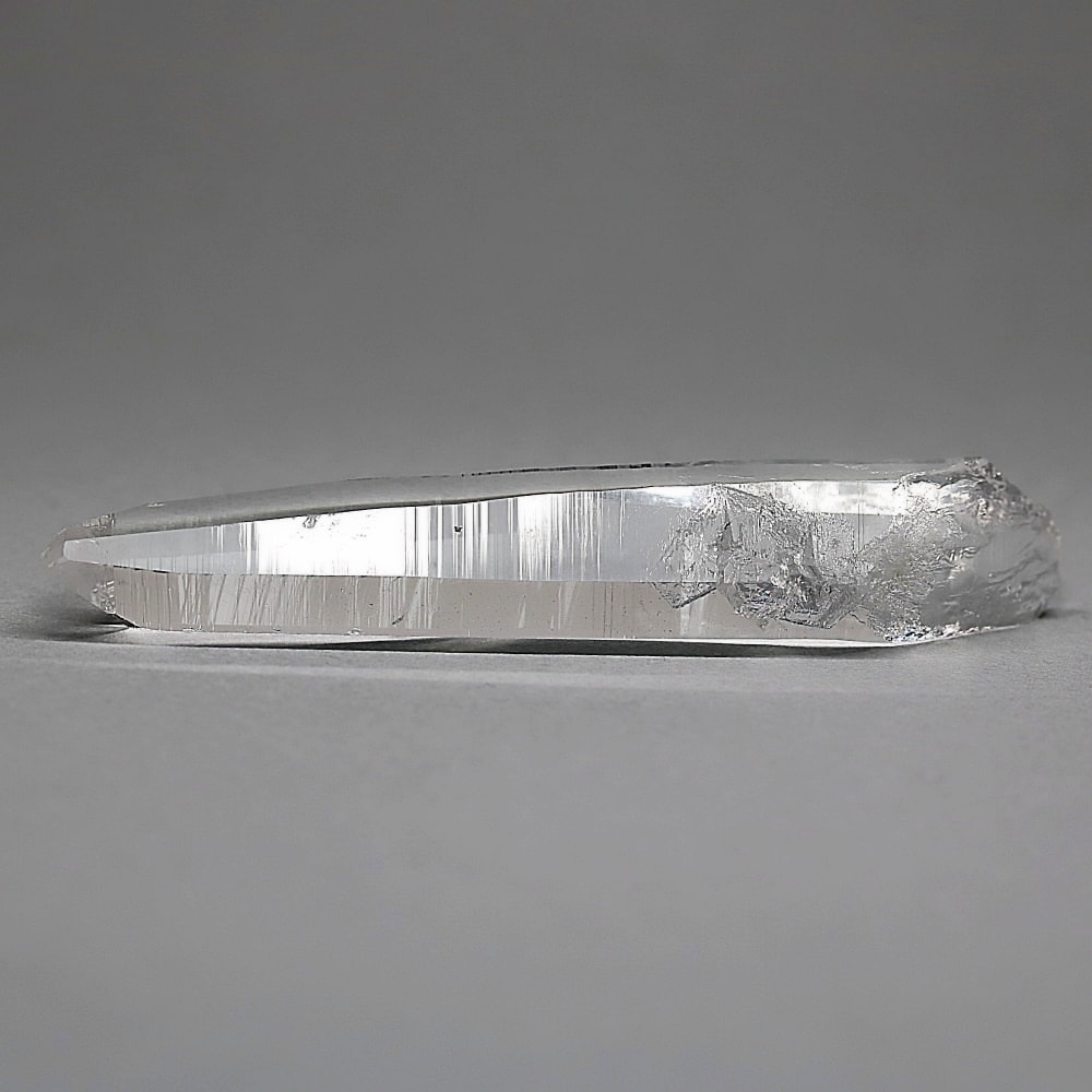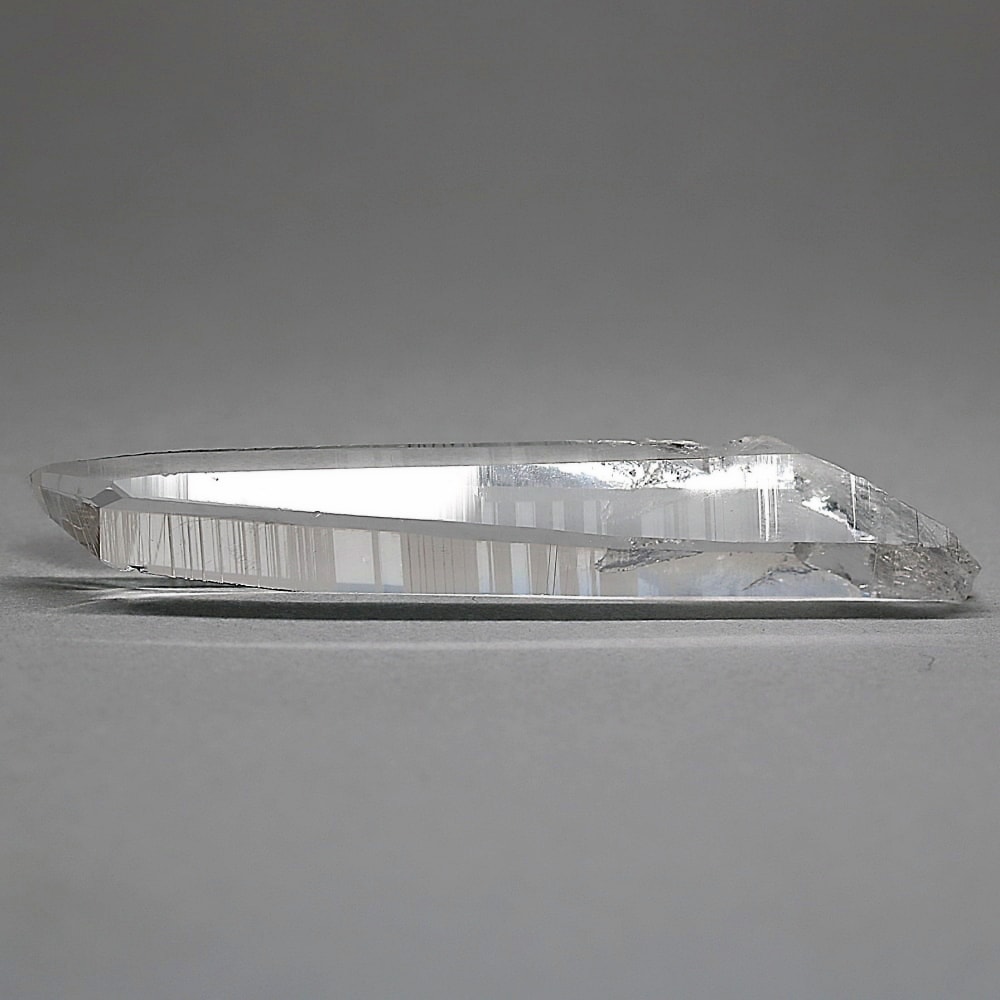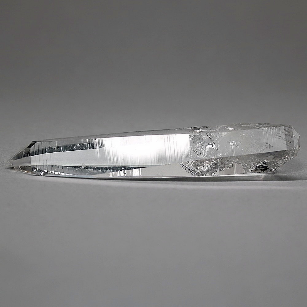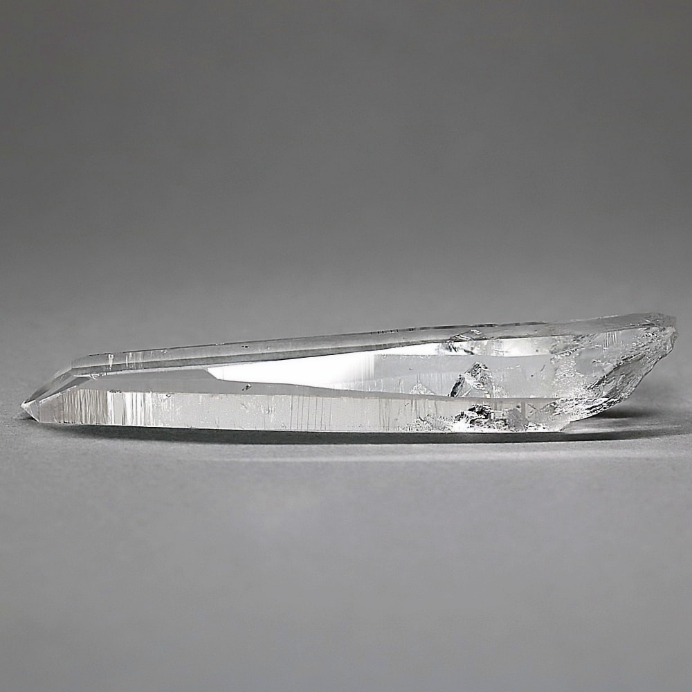 氷のように澄みきった透明度を持つ結晶は、まるで人の手で整えられたかのような端正なシルエットを備えており、ファセット欠損も極めて少ない洗練されたディテールが見事です。