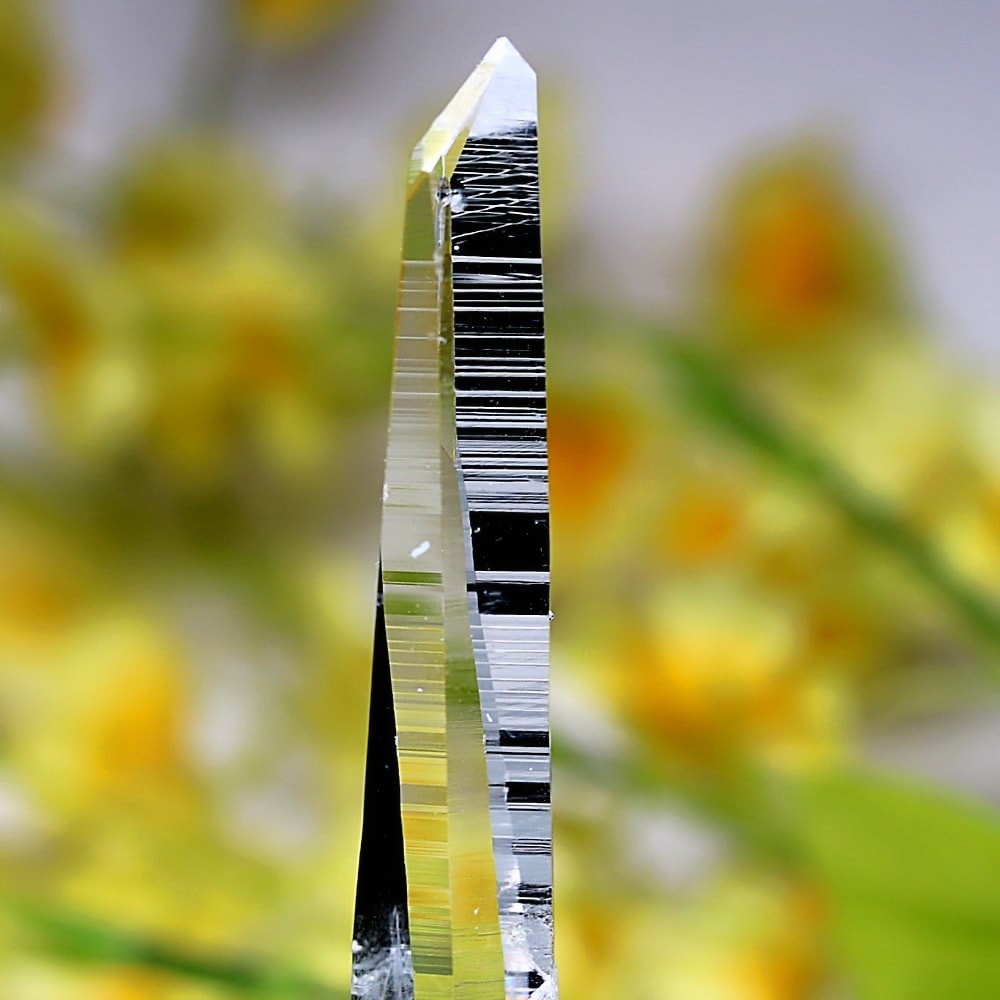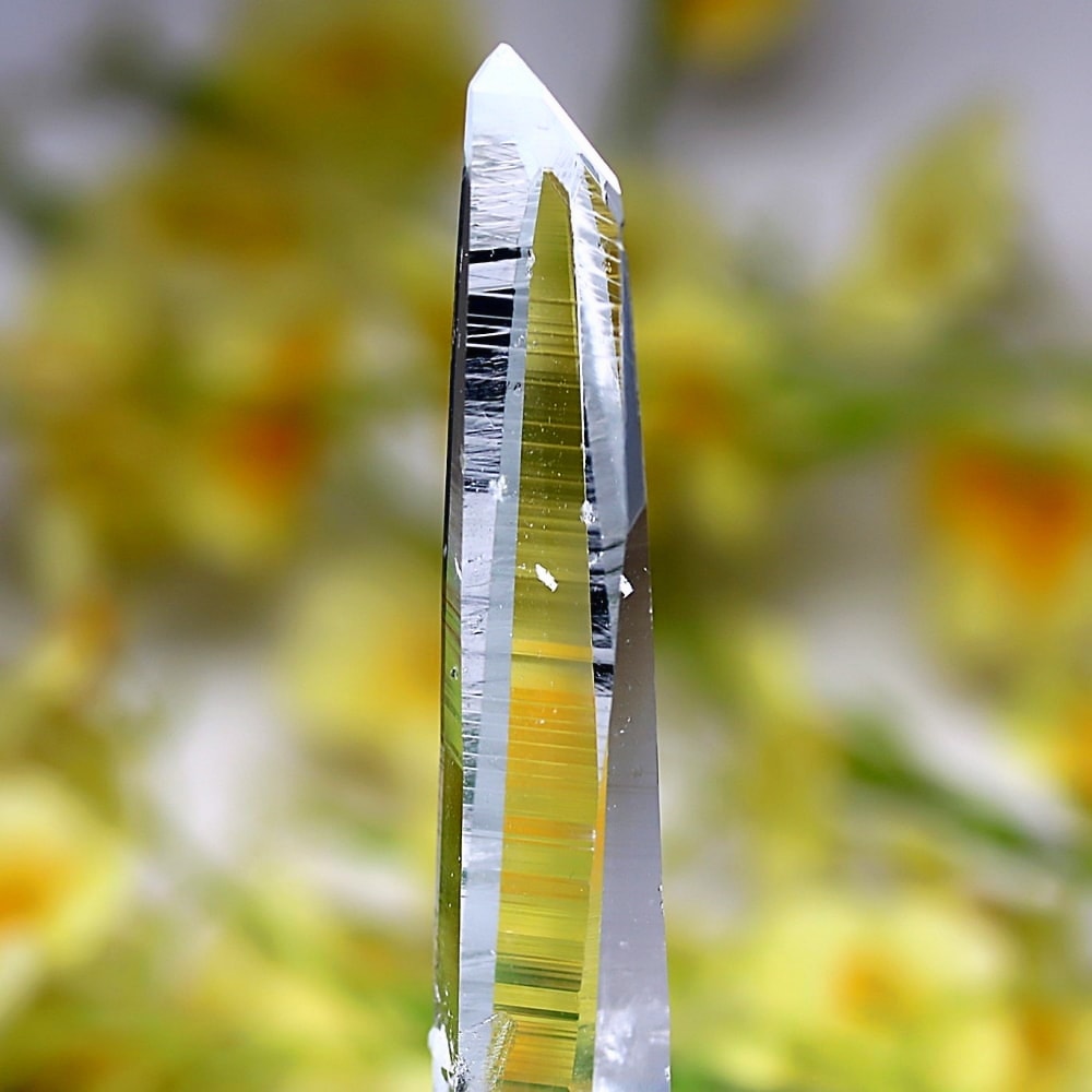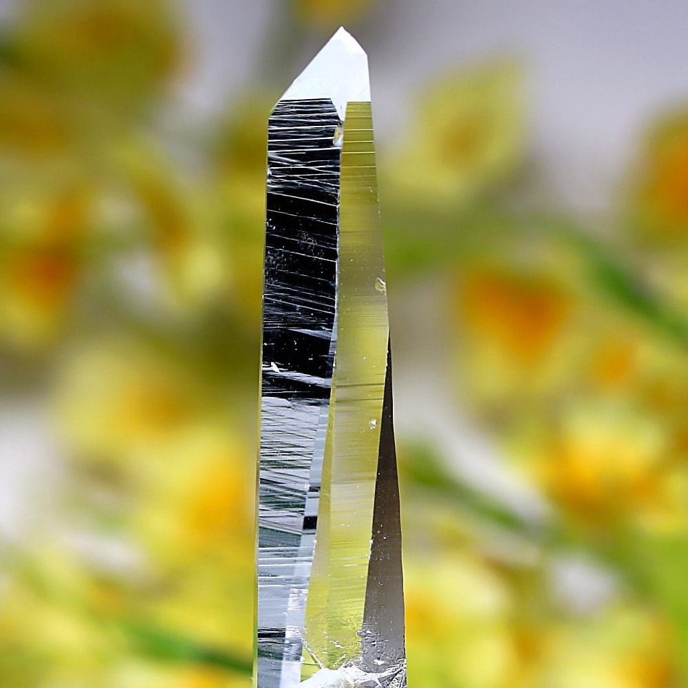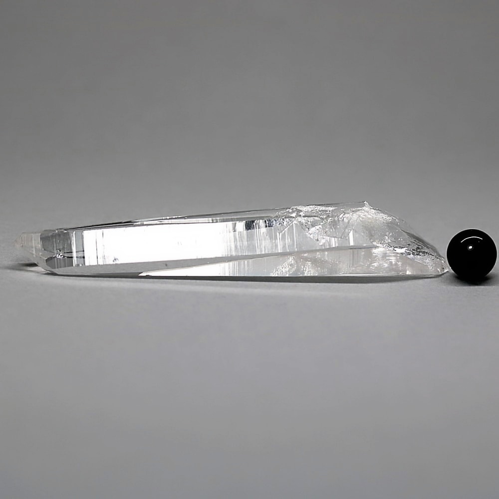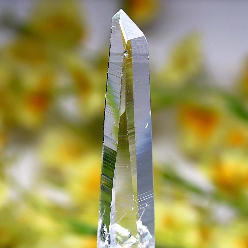 氷のように澄みきった透明度を持つ結晶は、まるで人の手で整えられたかのような端正なシルエットを備えており、ファセット欠損も極めて少ない洗練されたディテールが見事です。