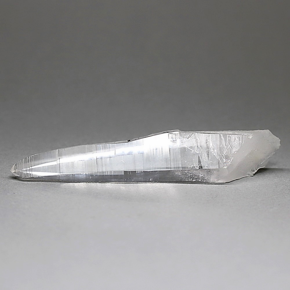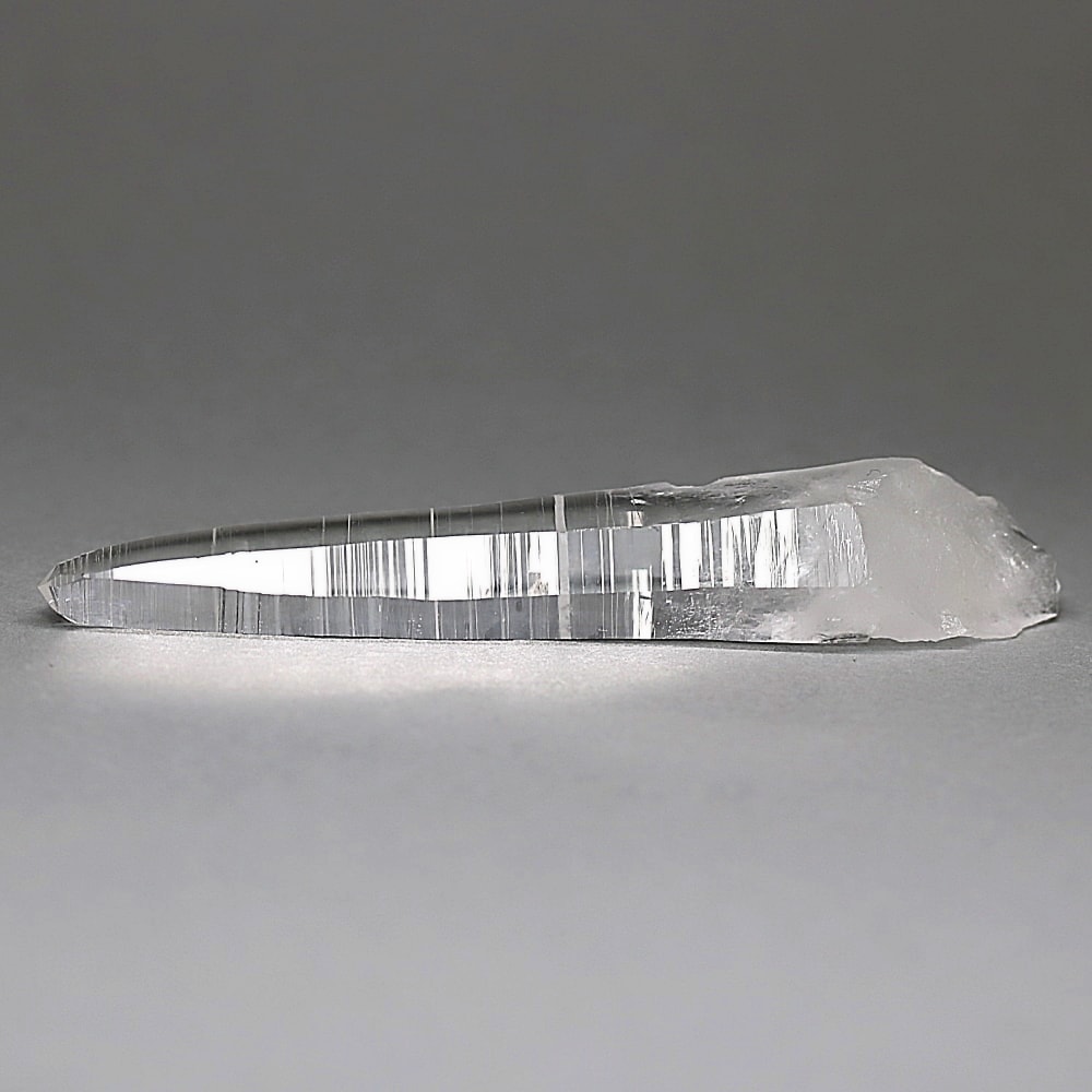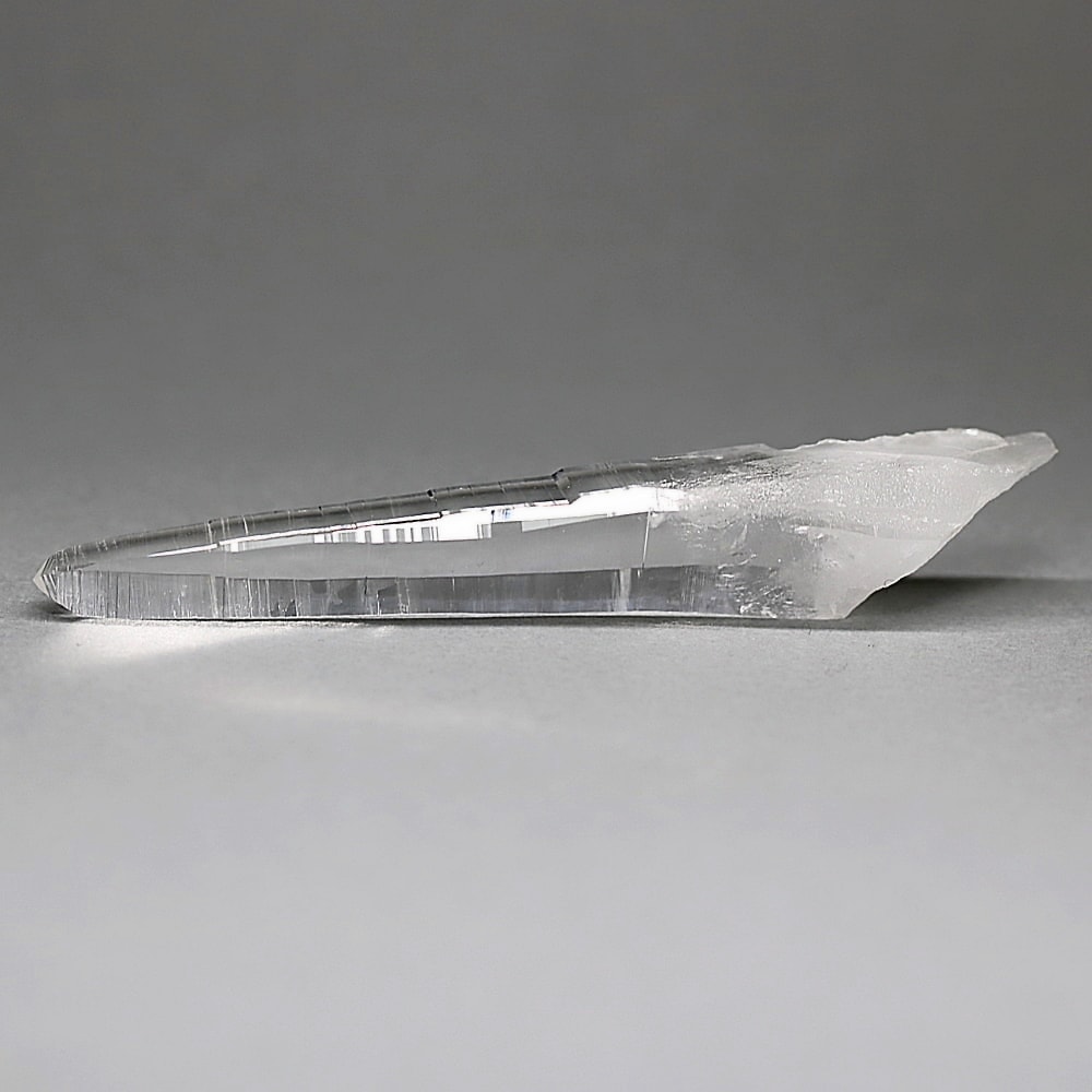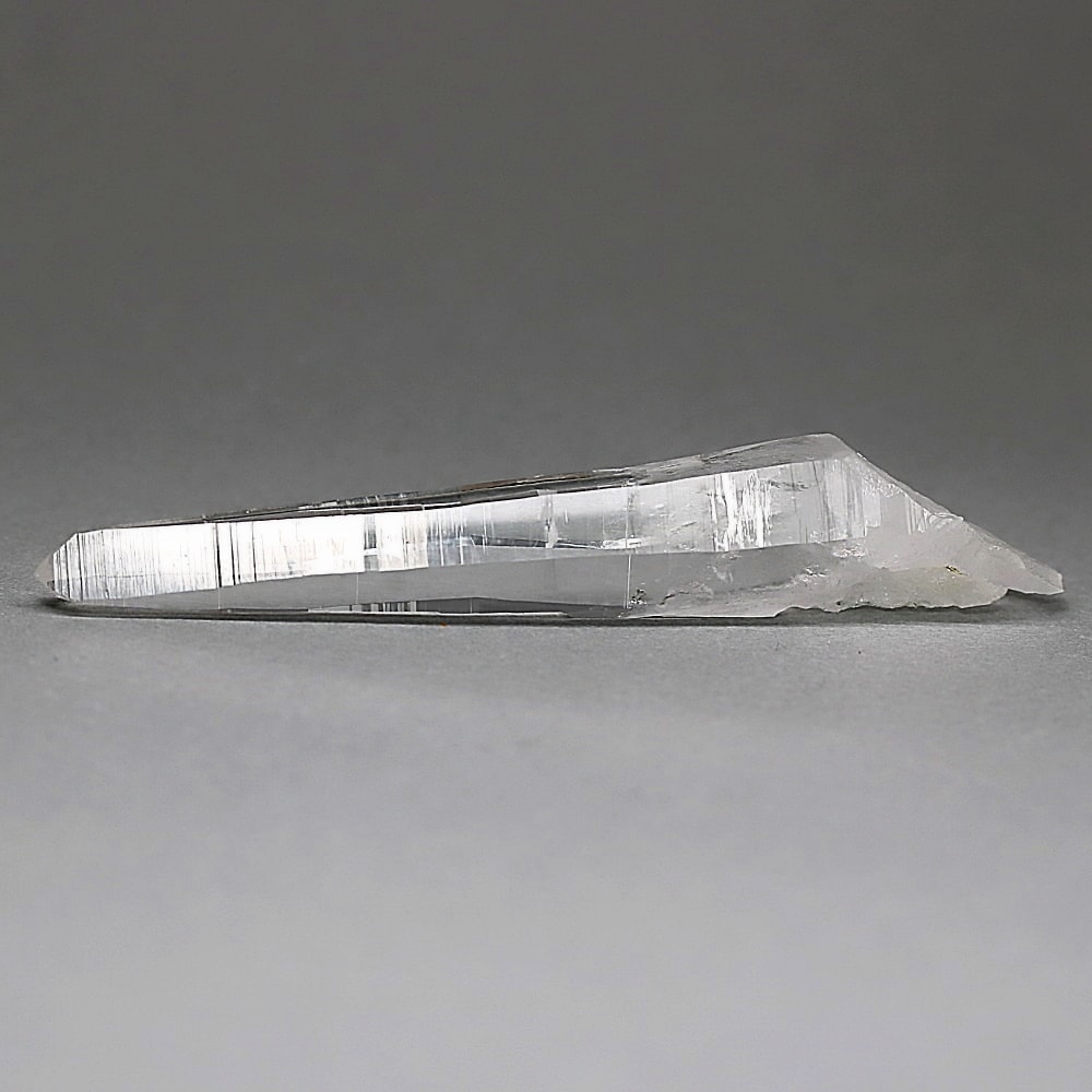 氷のように澄みきった透明度を持つ結晶は、まるで人の手で整えられたかのような端正なシルエットを備えており、ファセット欠損も極めて少ない洗練されたディテールが見事です。