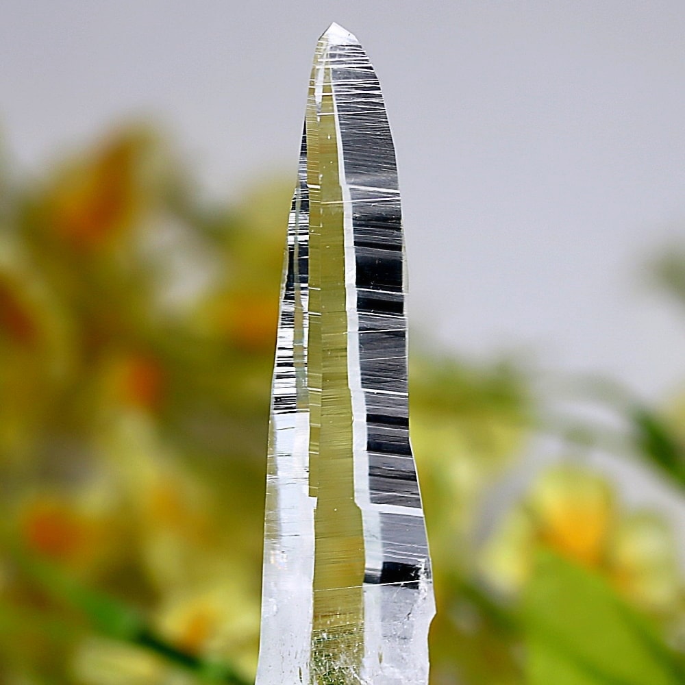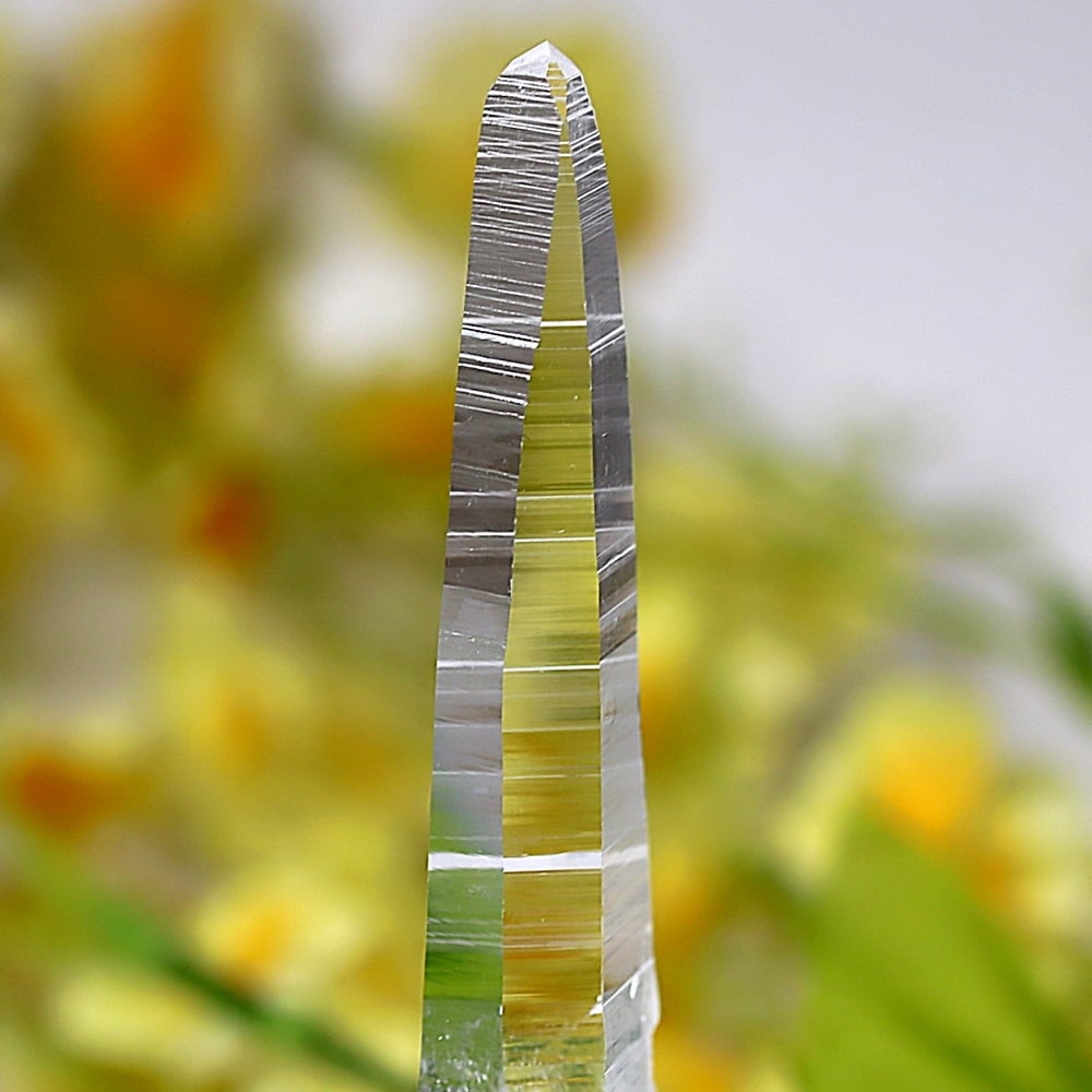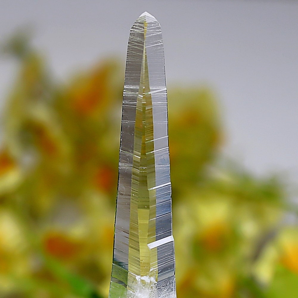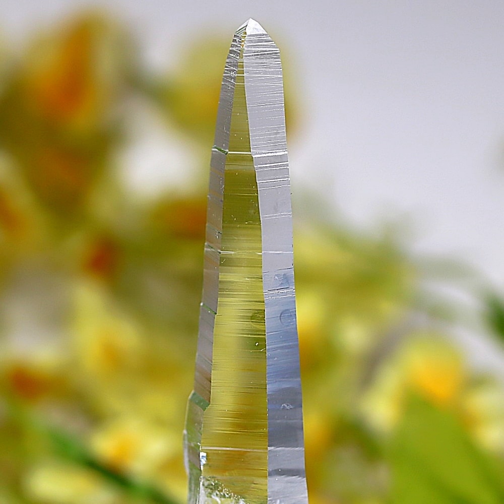 氷のように澄みきった透明度を持つ結晶は、まるで人の手で整えられたかのような端正なシルエットを備えており、ファセット欠損も極めて少ない洗練されたディテールが見事です。