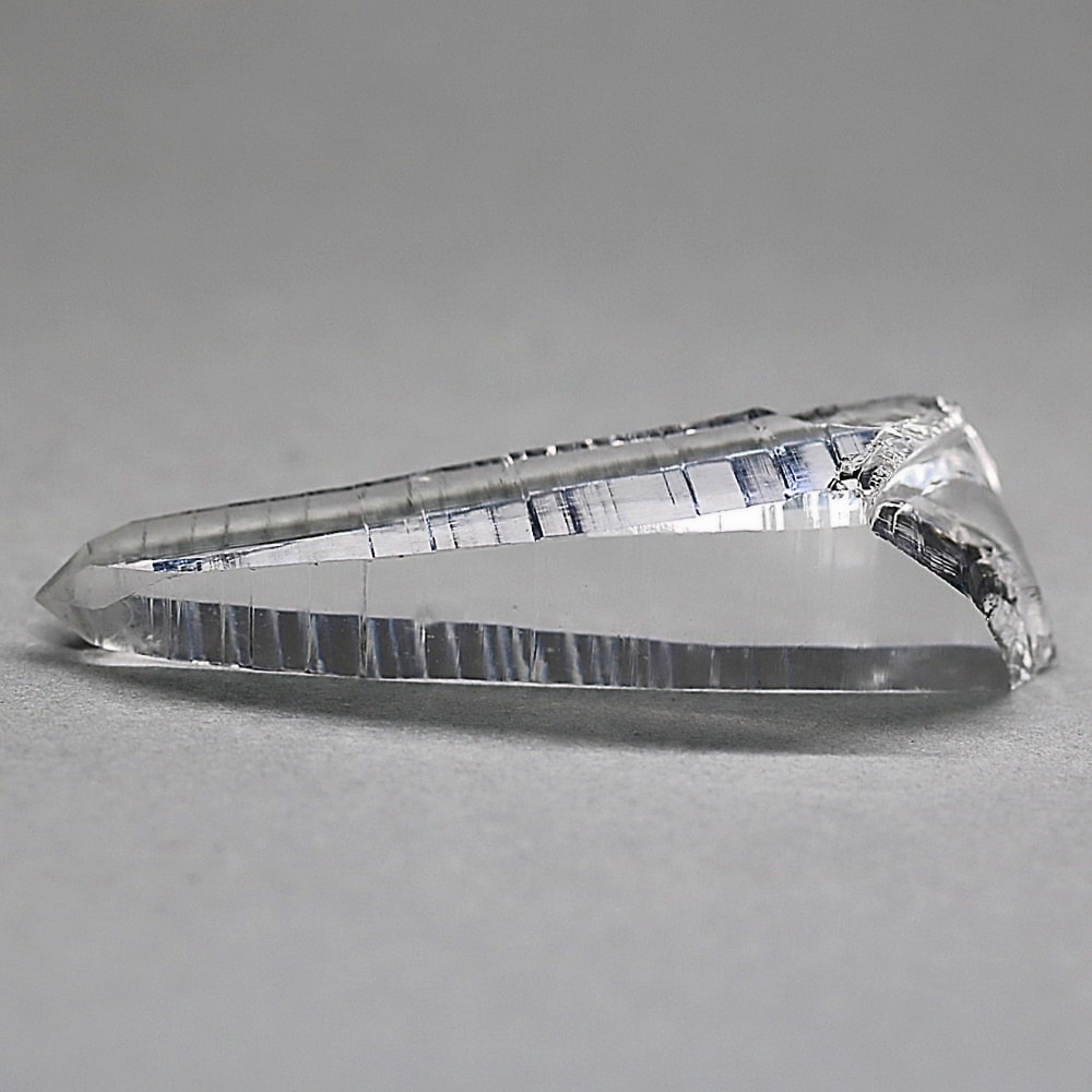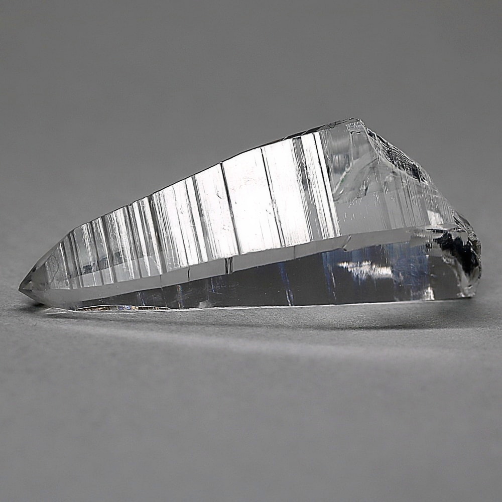 氷のように澄みきった透明度を持つ結晶は、まるで人の手で整えられたかのような端正なシルエットを備えており、ファセット欠損も極めて少ない洗練されたディテールが見事です。