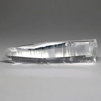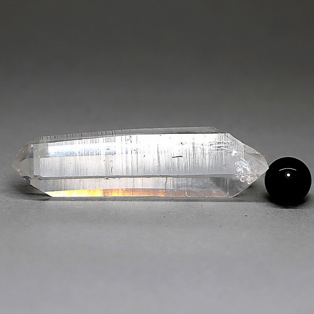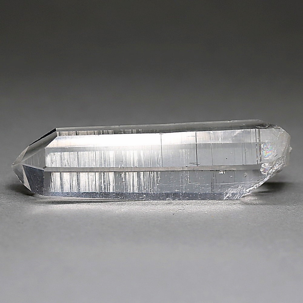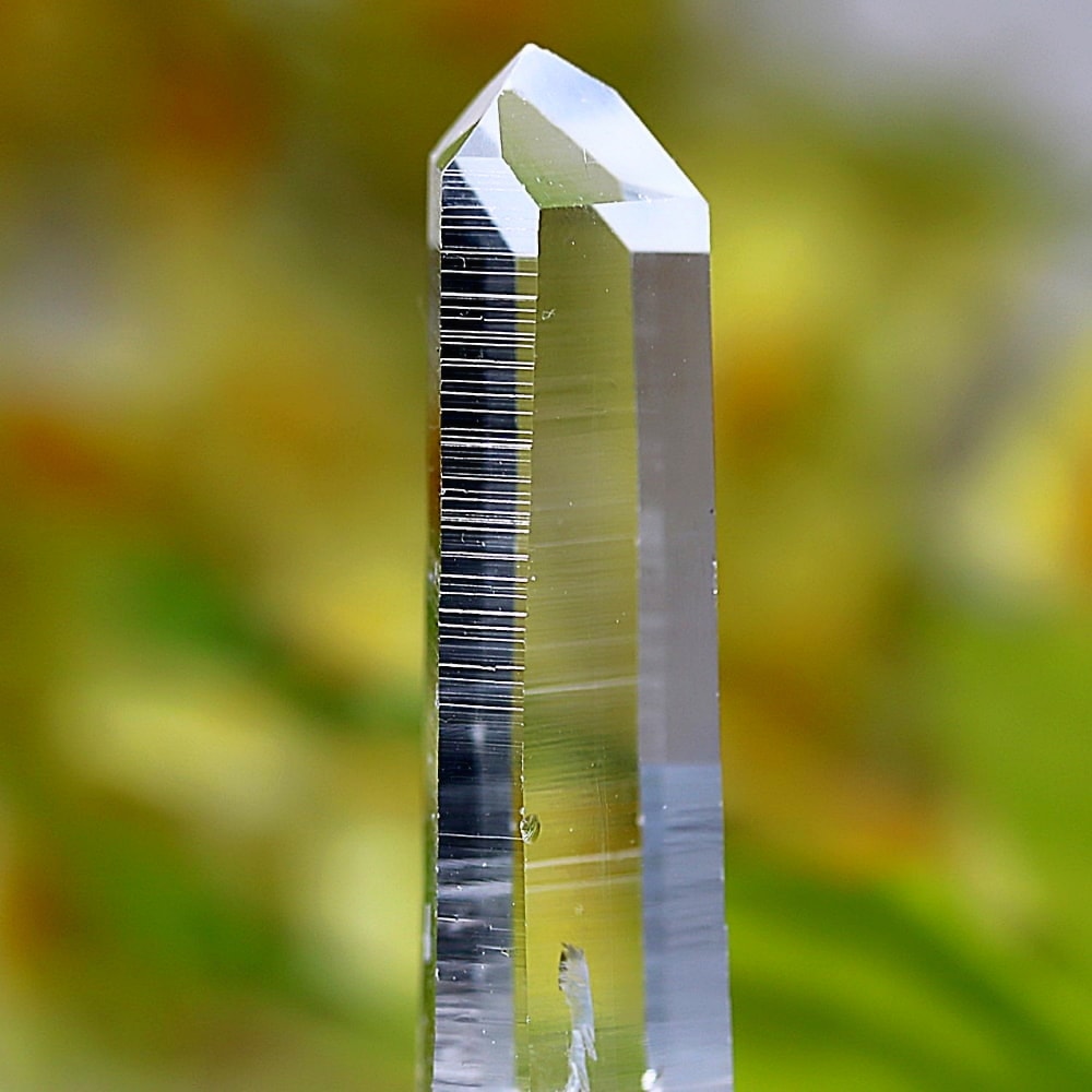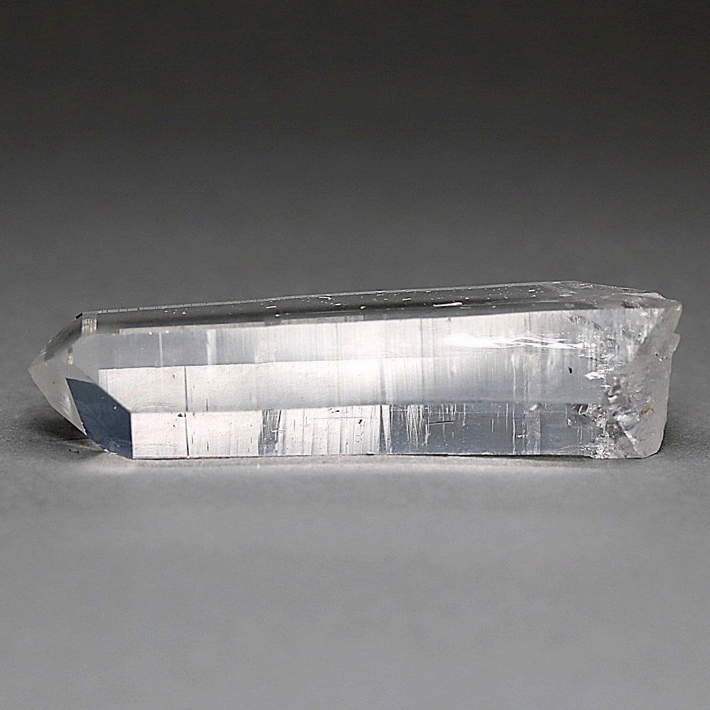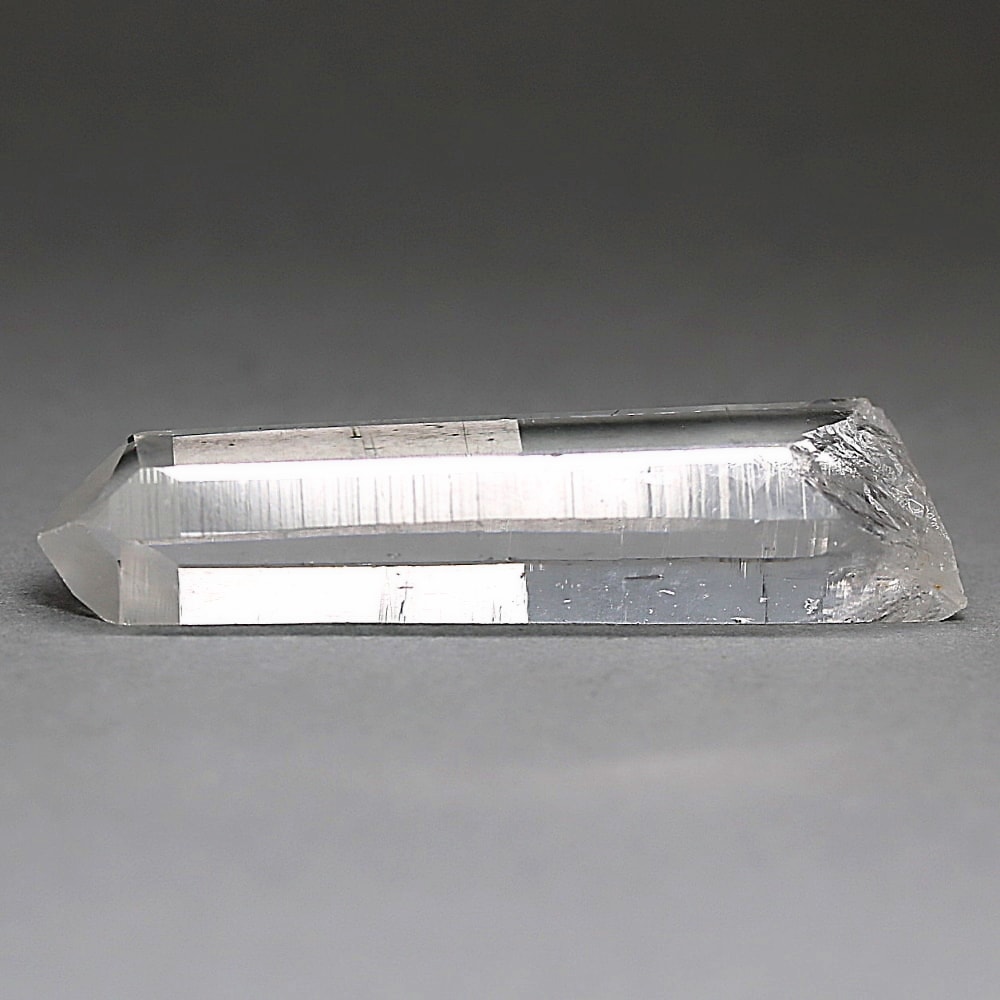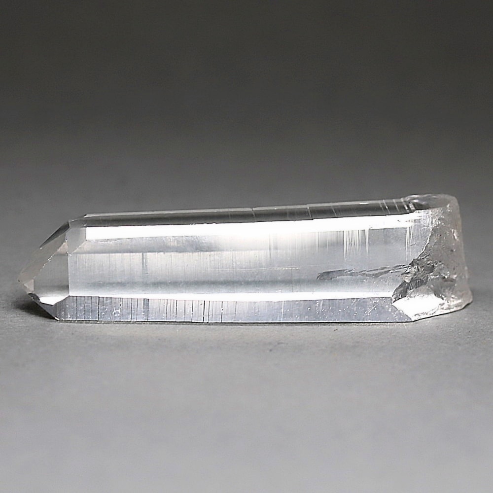 氷のように澄みきった透明度を持つ結晶は、まるで人の手で整えられたかのような端正なシルエットを備えており、ファセット欠損も極めて少ない洗練されたディテールが見事です。