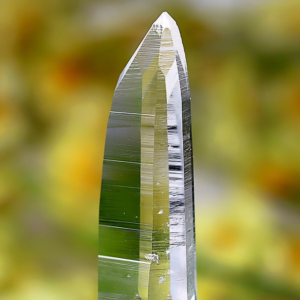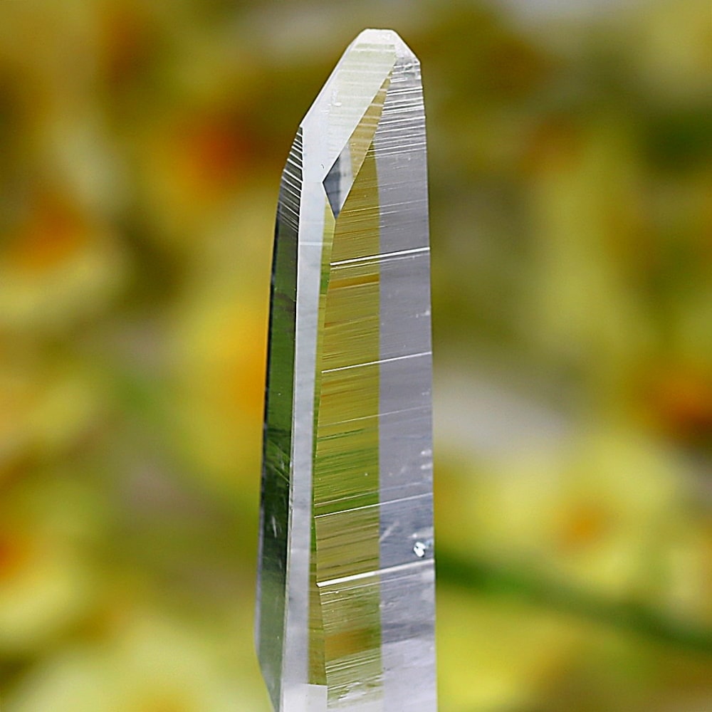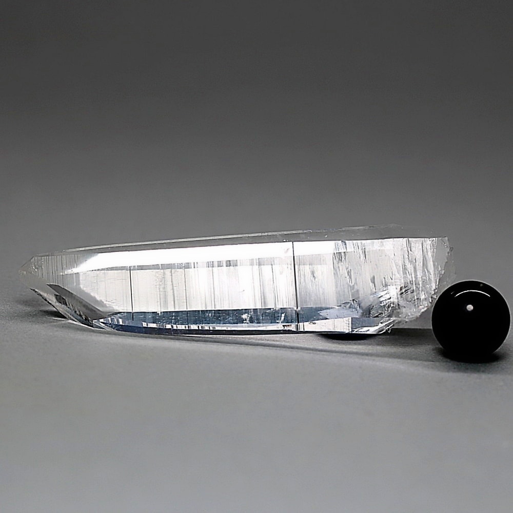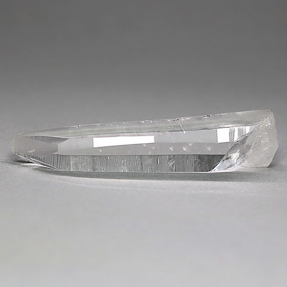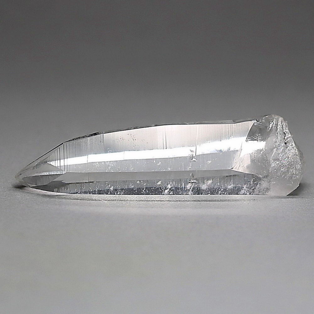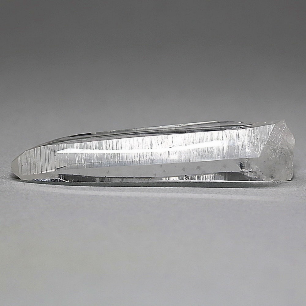 氷のように澄みきった透明度を持つ結晶は、まるで人の手で整えられたかのような端正なシルエットを備えており、ファセット欠損も極めて少ない洗練されたディテールが見事です。