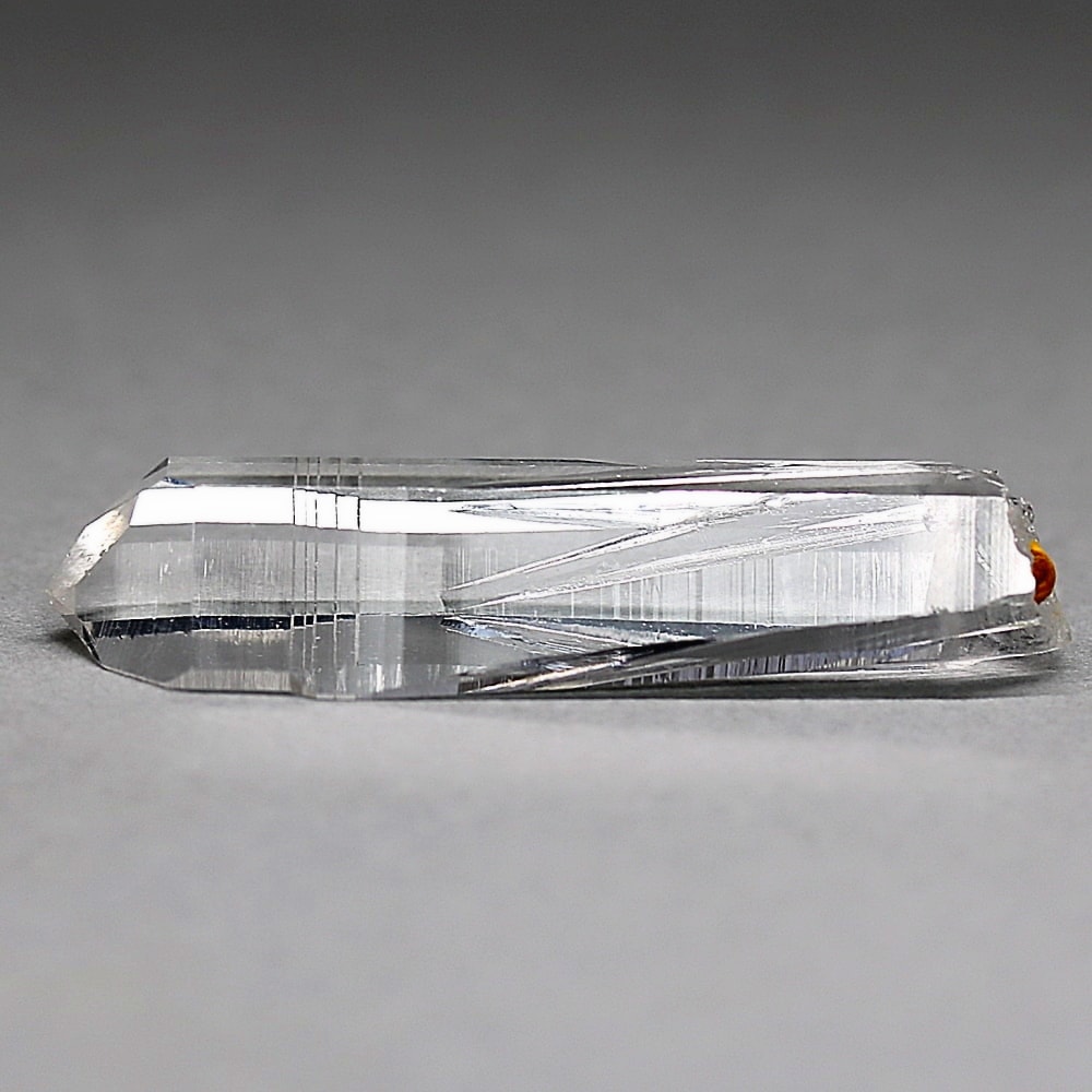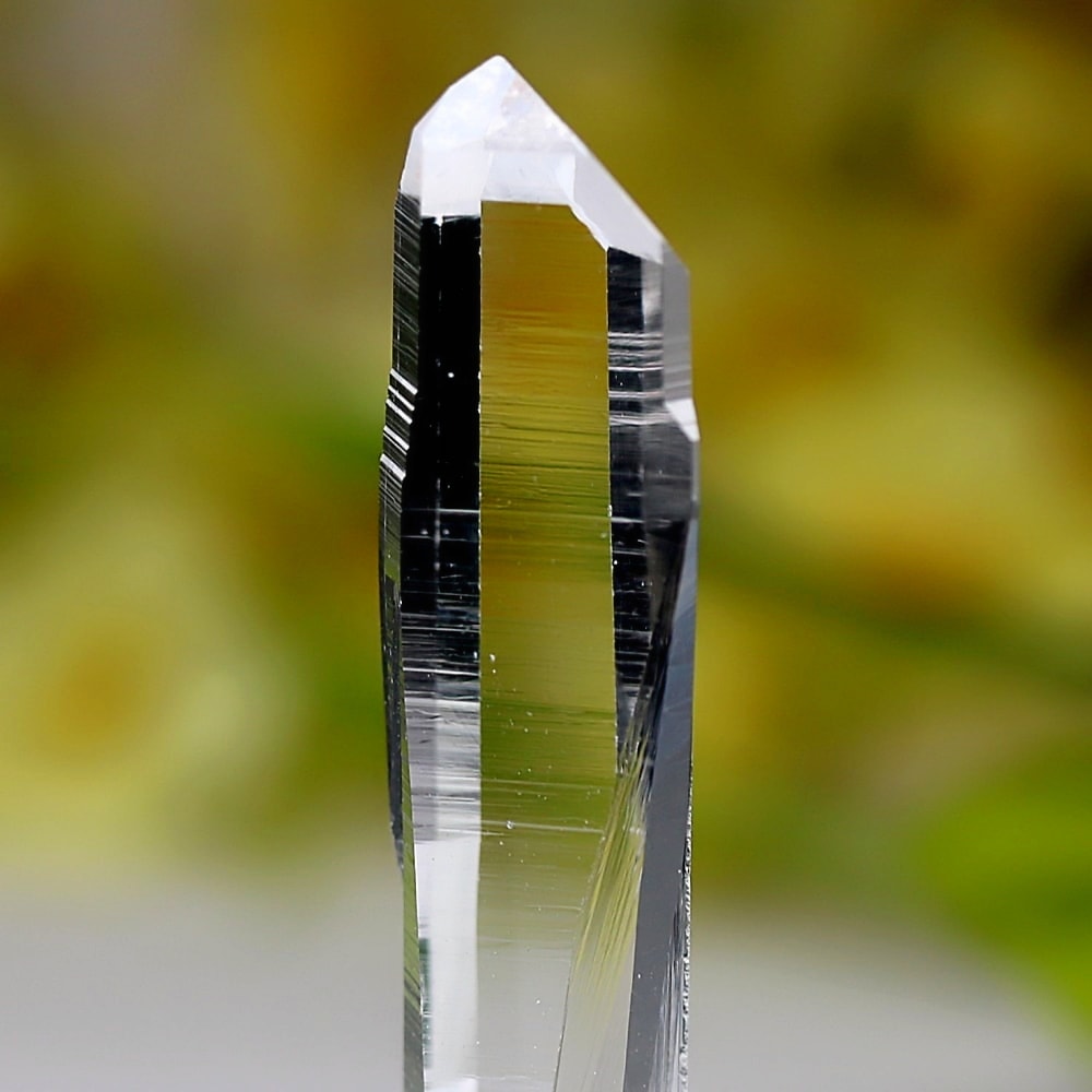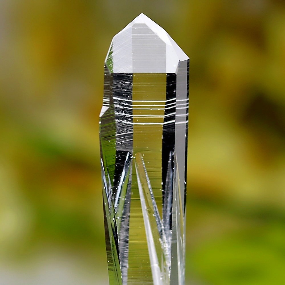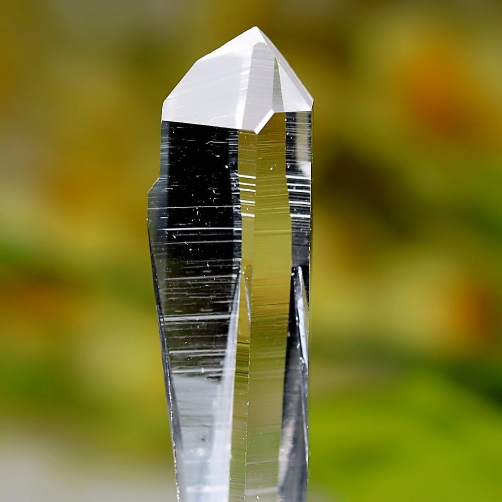 氷のように澄みきった透明度を持つ結晶は、まるで人の手で整えられたかのような端正なシルエットを備えており、ファセット欠損も極めて少ない洗練されたディテールが見事です。