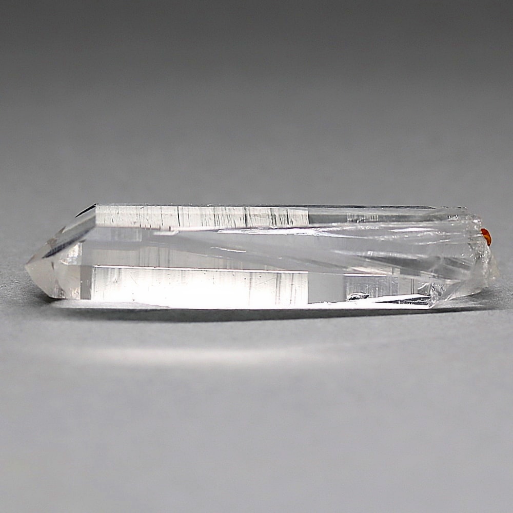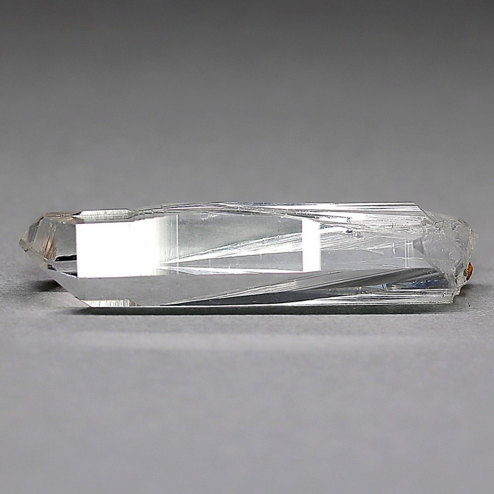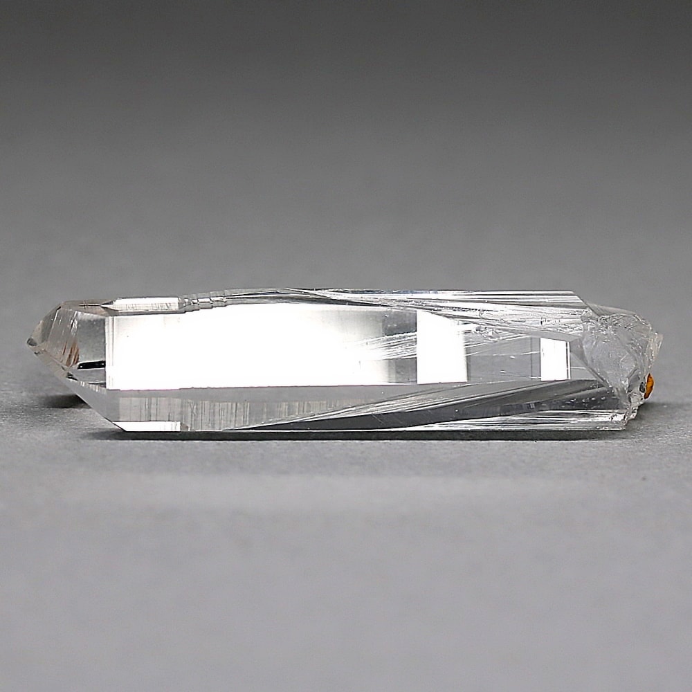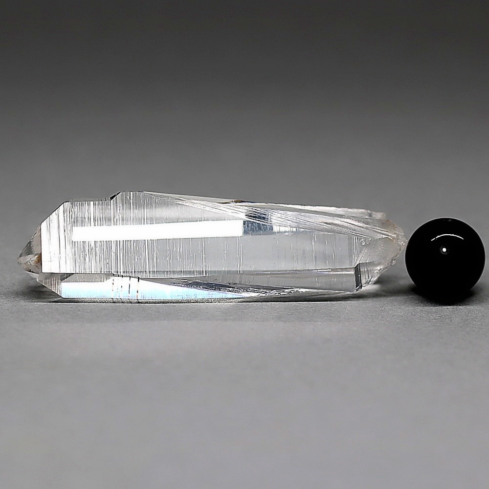 氷のように澄みきった透明度を持つ結晶は、まるで人の手で整えられたかのような端正なシルエットを備えており、ファセット欠損も極めて少ない洗練されたディテールが見事です。