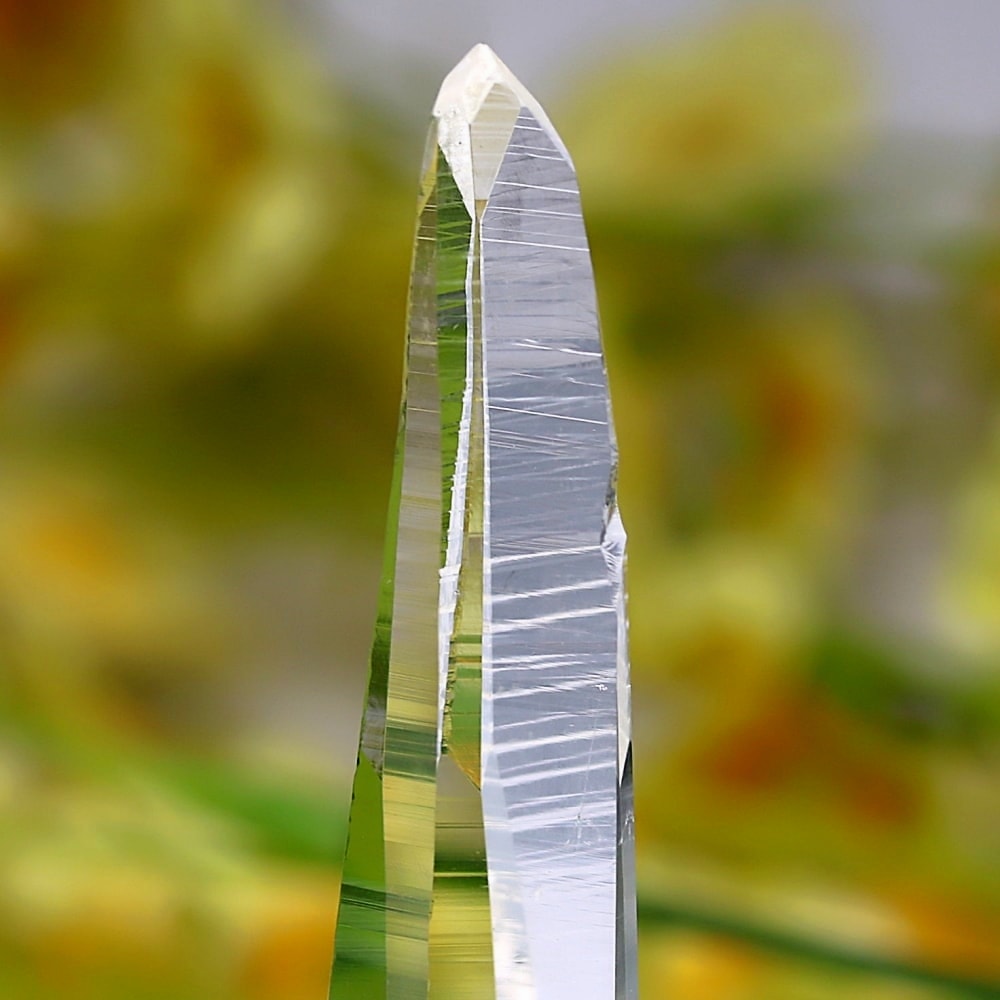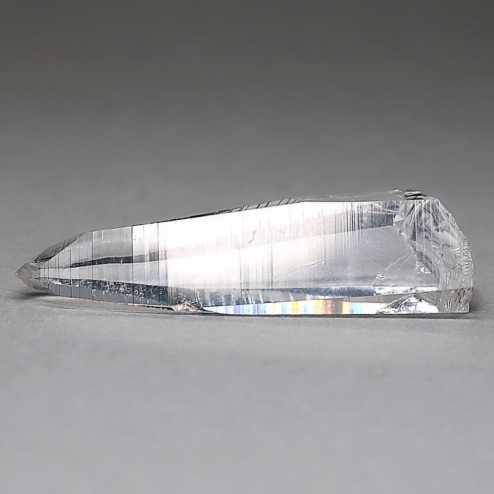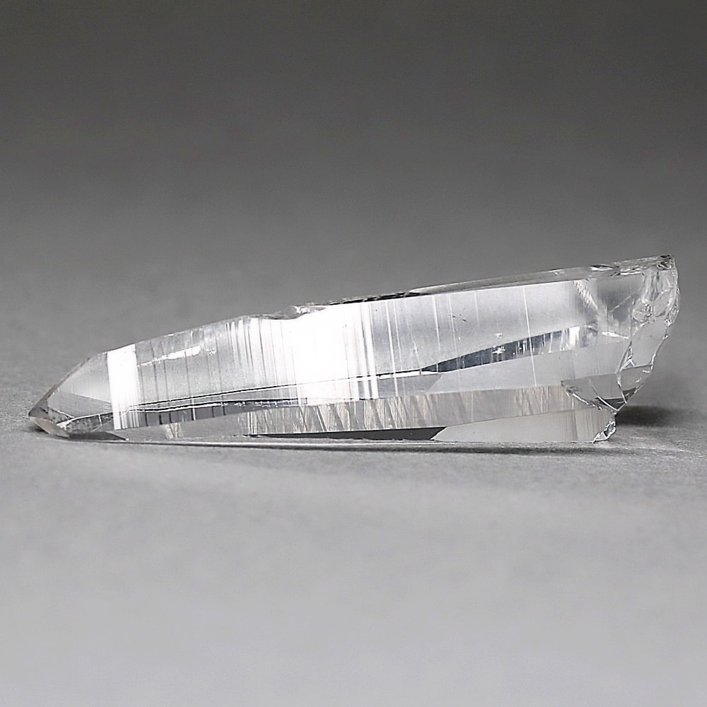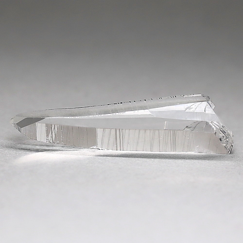 氷のように澄みきった透明度を持つ結晶は、まるで人の手で整えられたかのような端正なシルエットを備えており、ファセット欠損も極めて少ない洗練されたディテールが見事です。