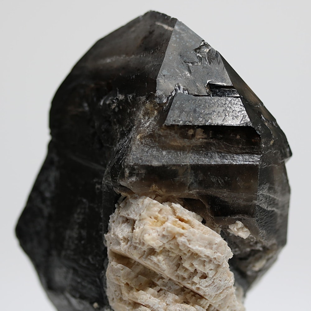 これは恐らく、元々モリオンができあがった鉱床が地殻変動などにより環境変化し放射線の影響を受け難くなったことで、「後期はスモーキークォーツとして結晶化」されたことにより生まれたと思われます。