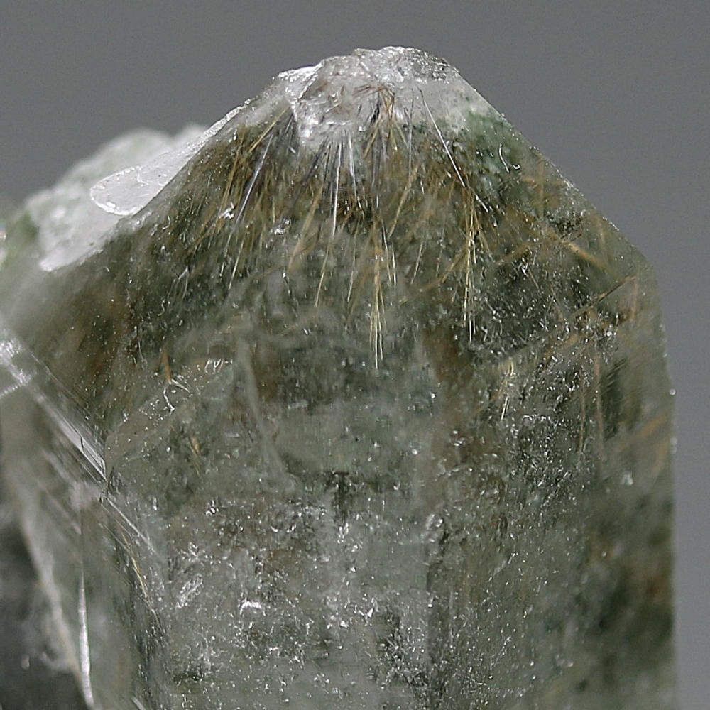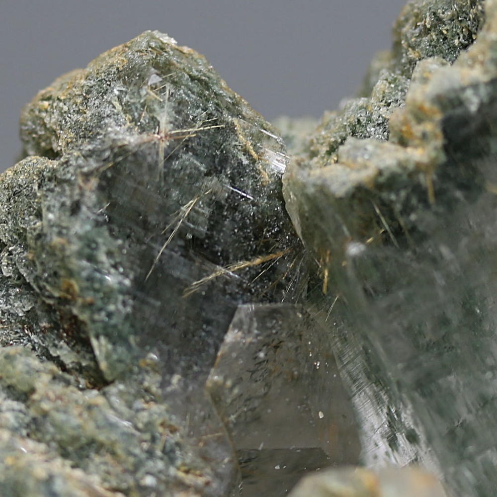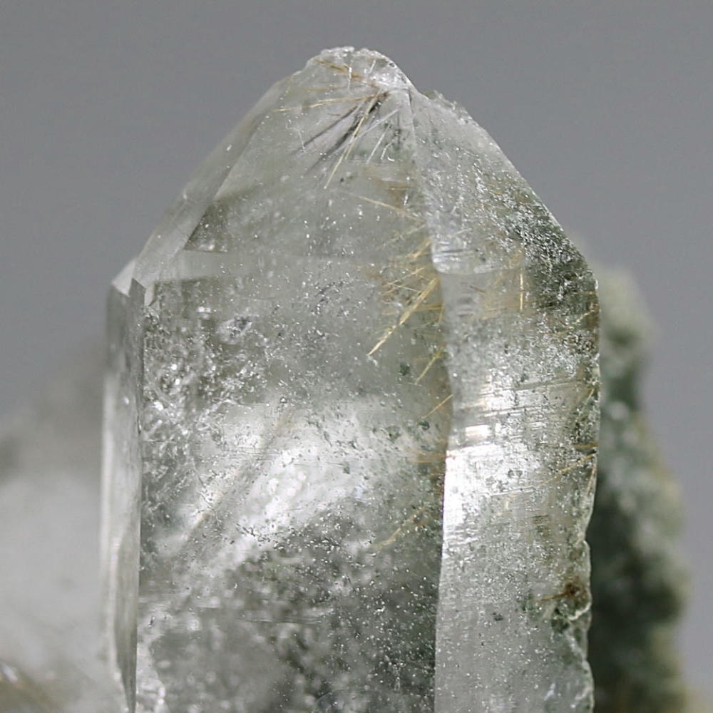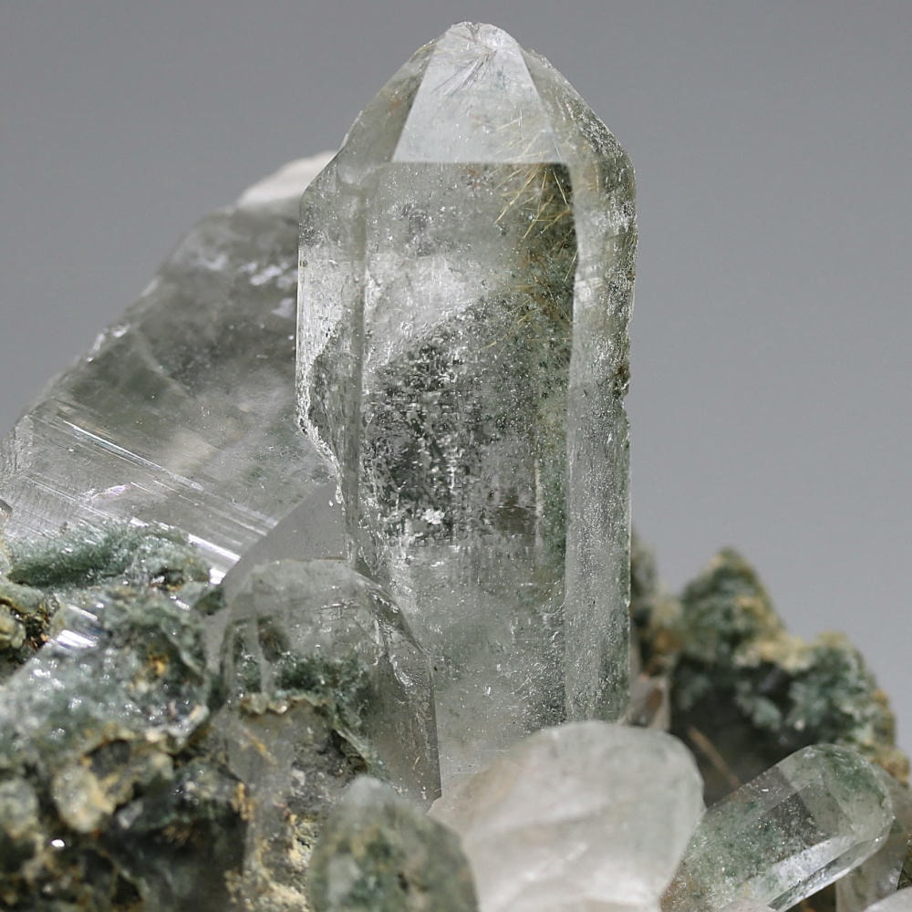 インクルージョンされたクローライト(緑泥石)を起点に、放射状に広がる繊細なルチルが、自然が生み出した造形美をそのまま感じさせてくれる逸品です。