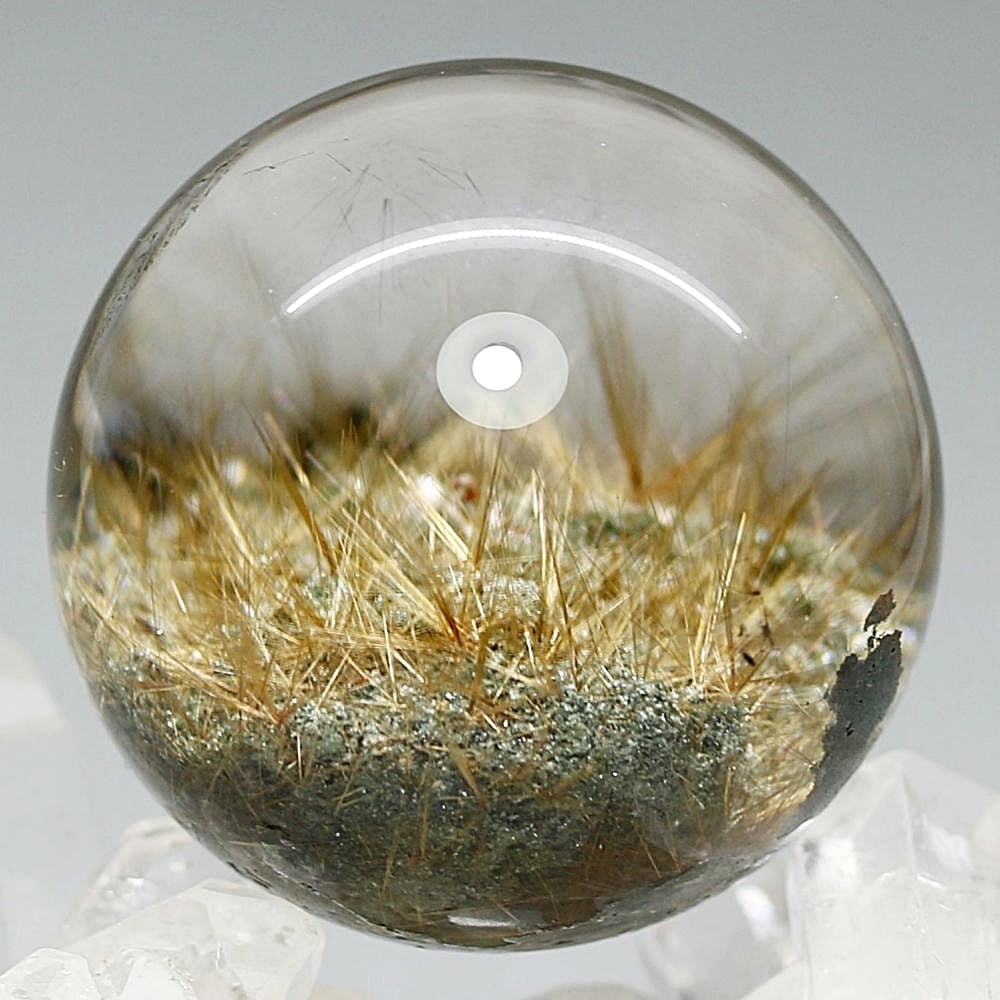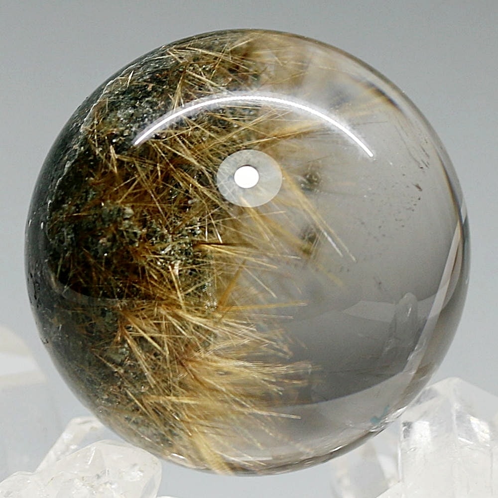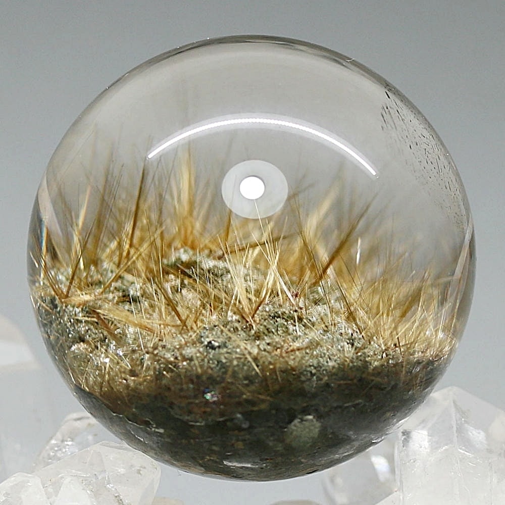そんなマニハール産ヒマラヤ水晶の中で、非常に透明度の高い水晶にルチルクォーツ針状結晶がインクルージョンされた希少なスフィアをご用意しました。