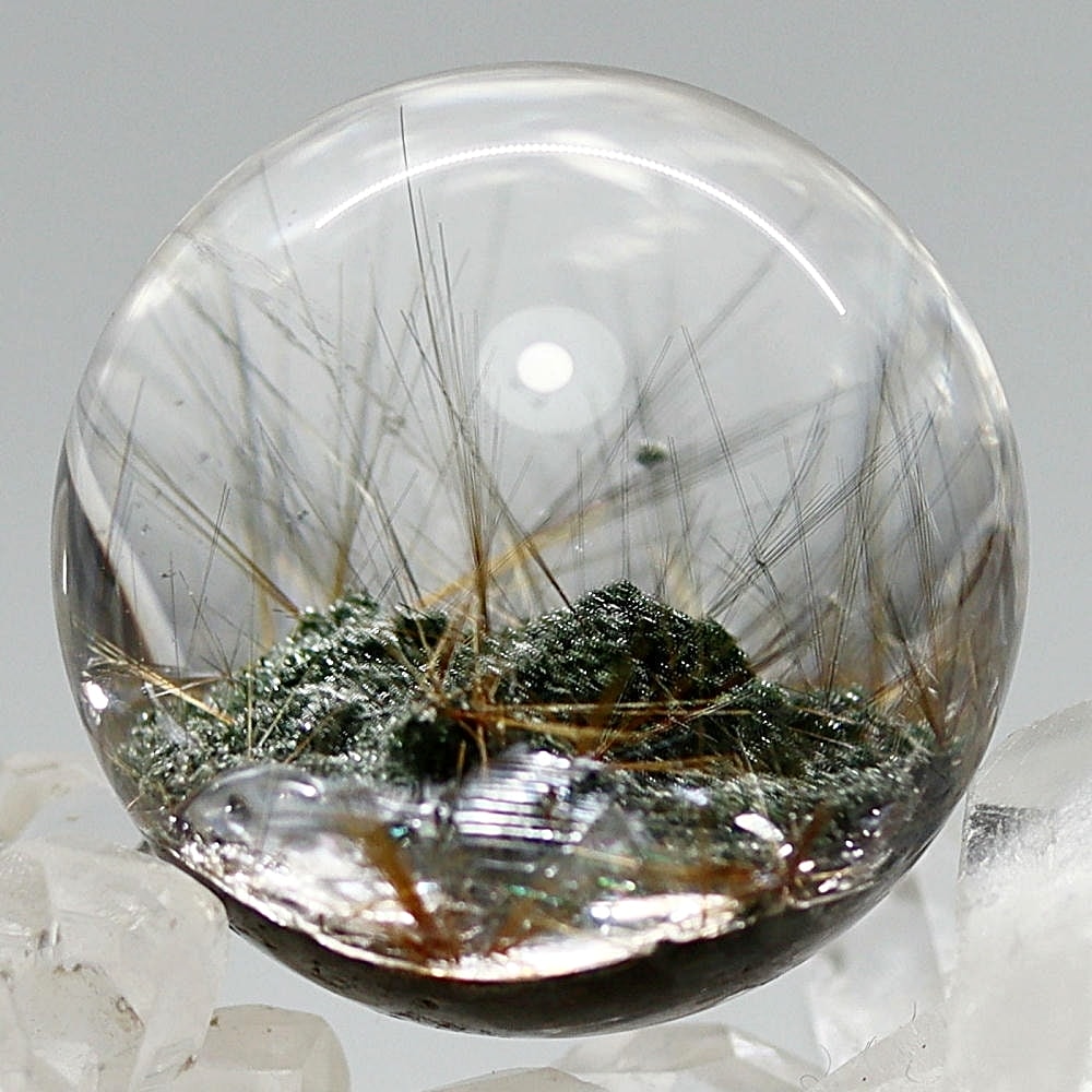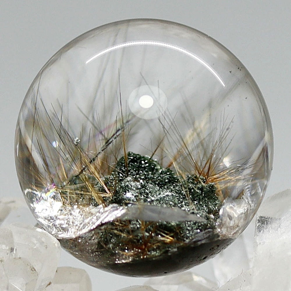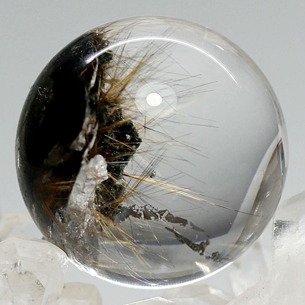 そんなマニハール産ヒマラヤ水晶の中で、非常に透明度の高い水晶にルチルクォーツ針状結晶がインクルージョンされた希少なスフィアをご用意しました。