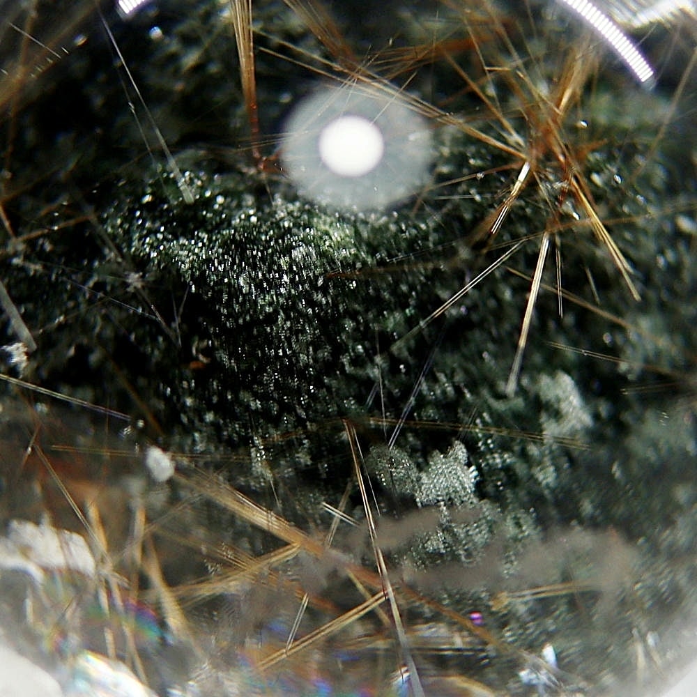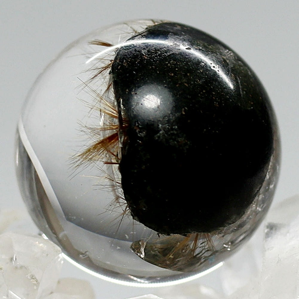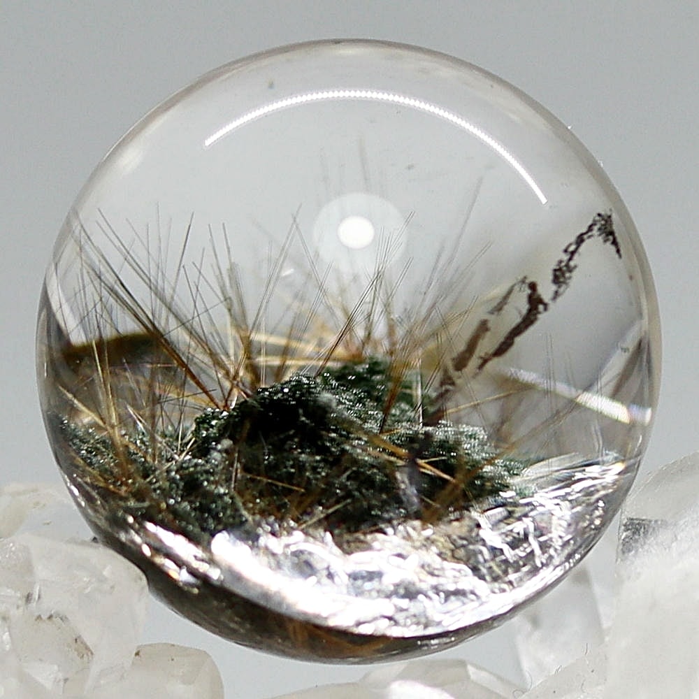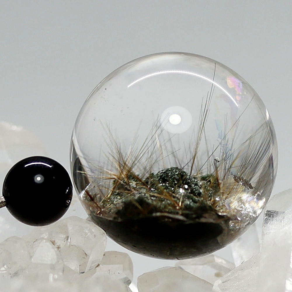 そんなマニハール産ヒマラヤ水晶の中で、非常に透明度の高い水晶にルチルクォーツ針状結晶がインクルージョンされた希少なスフィアをご用意しました。