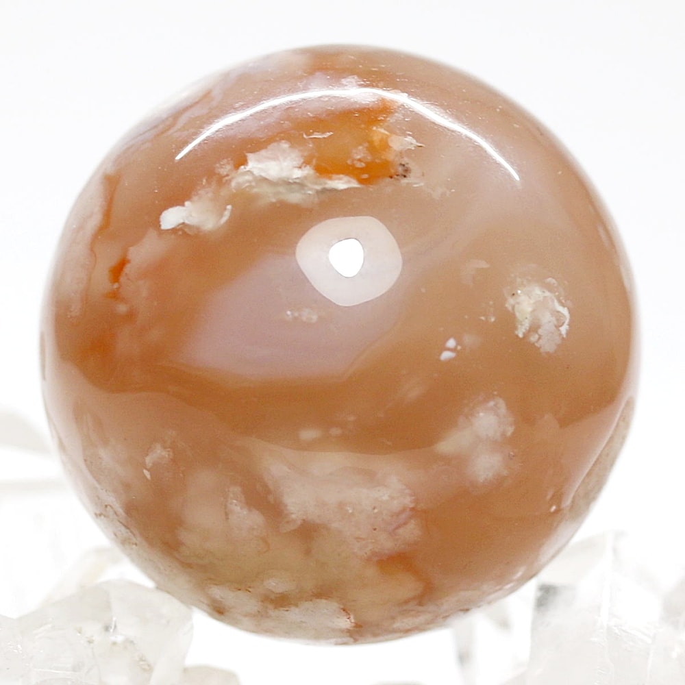 密度の高い球体石でありながら所々に透け感もあり、淡いピンクや優しいオレンジベージュの色合いにパッと開いた桜花が咲いている丸玉を眺めていると、なんだか心を癒してくれ明るい気分にさせてくれそうです☆