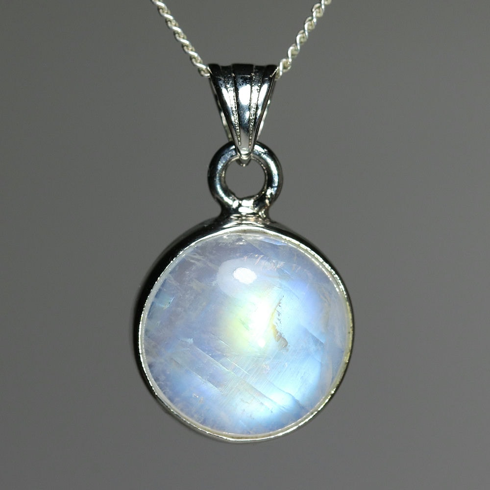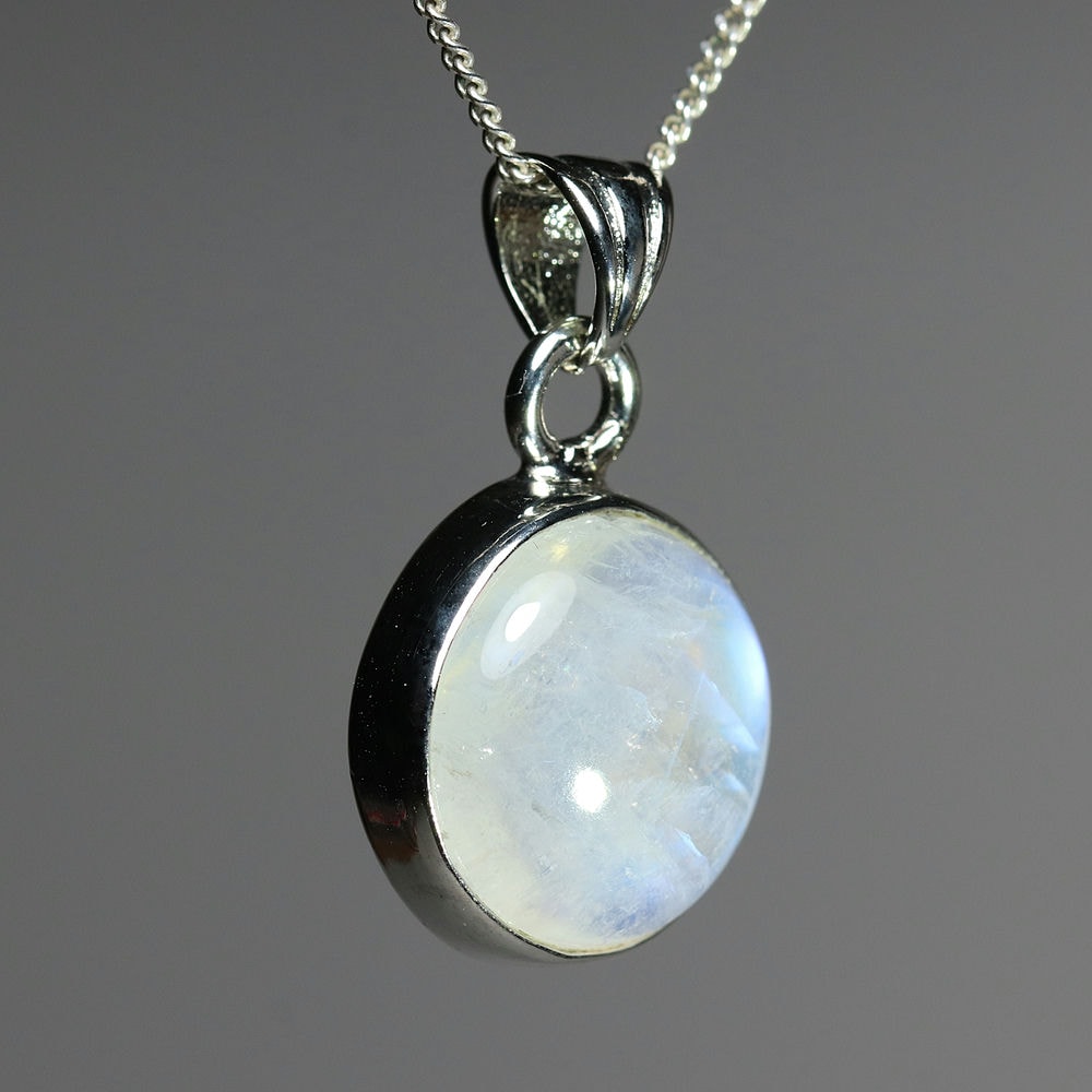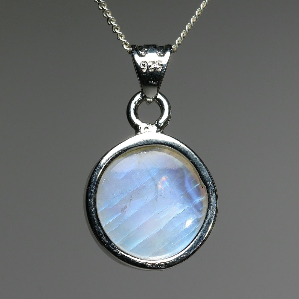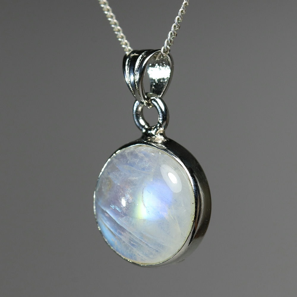 白い長石(ホワイトラブラドライト)に綺麗なシラーが現れる、通称レインボームーンストーンのルースを、シンプルなペンダントトップに仕上げました。