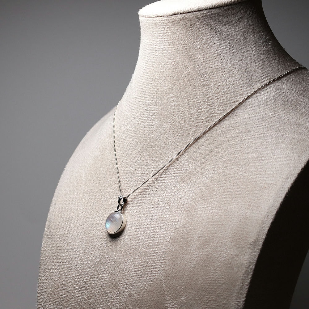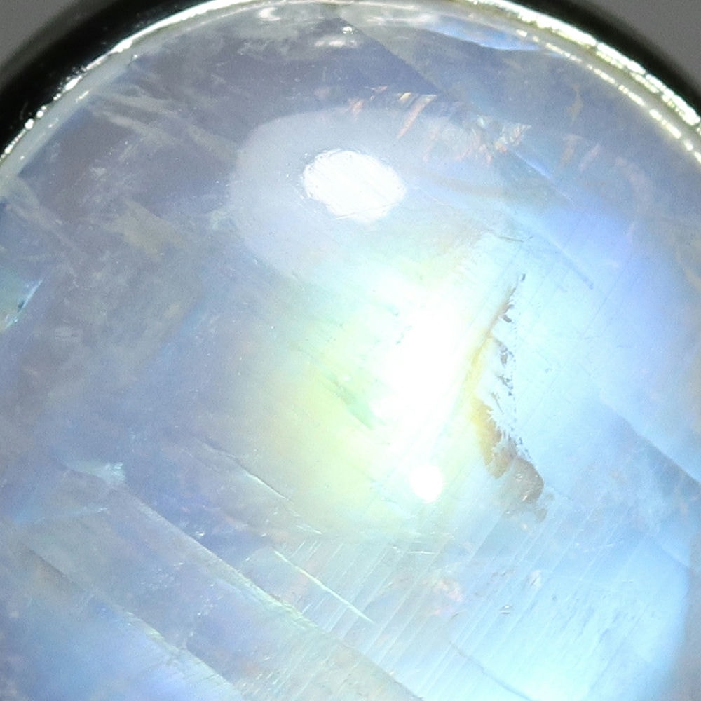 透明感のある白石に浮かび上がる光(ラブラドレッセンス)は、角度によって表情を変え、まるで月の光を閉じ込めたかのような幻想的な美しさをお楽しみいただけます。