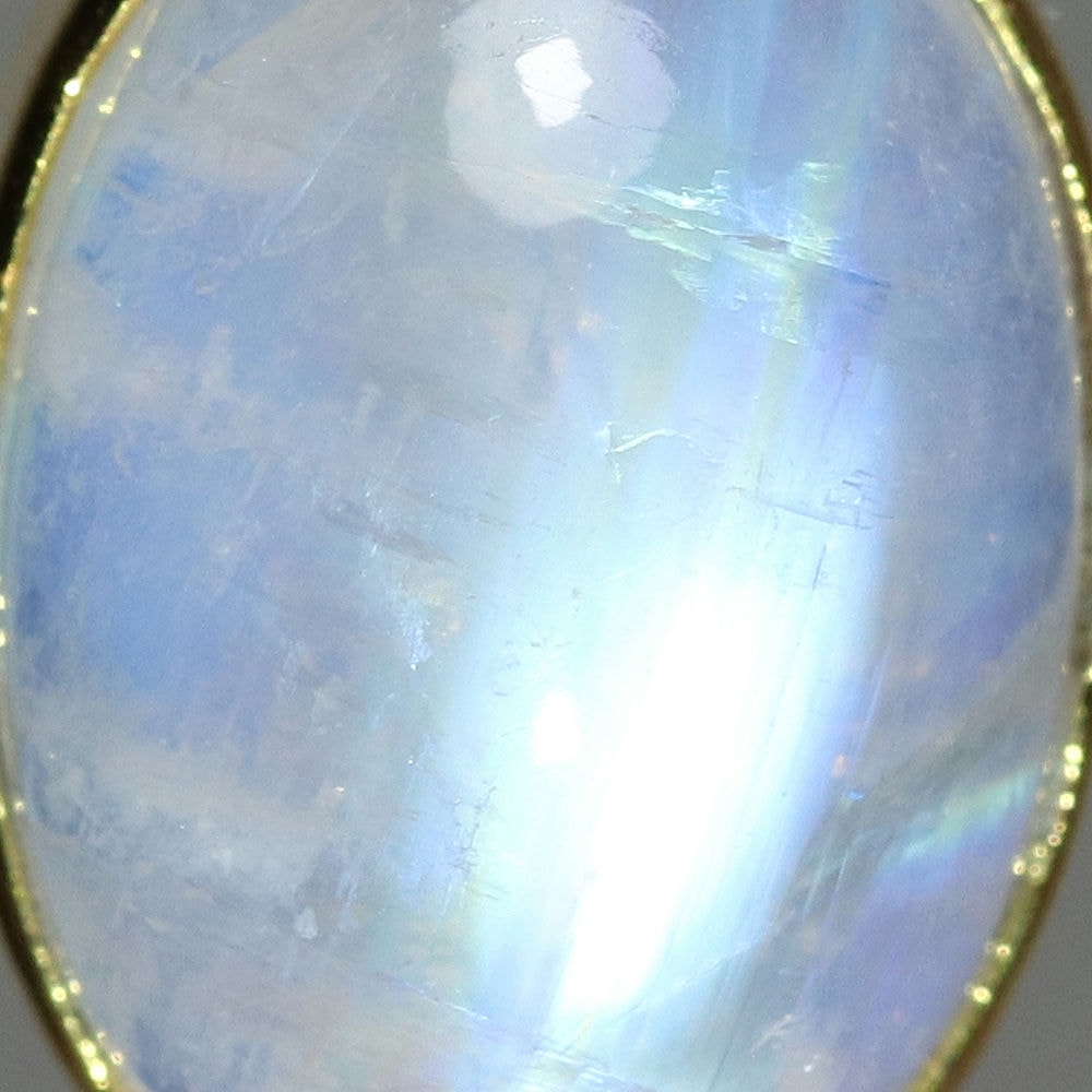 透明感のある白石に浮かび上がる光(ラブラドレッセンス)は、角度によって表情を変え、まるで月の光を閉じ込めたかのような幻想的な美しさをお楽しみいただけます。