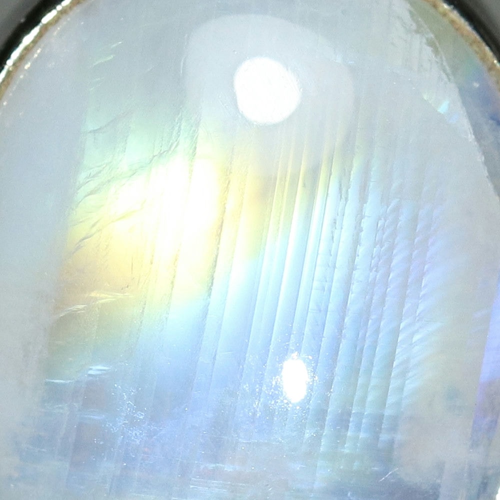 透明感のある白石に浮かび上がる光(ラブラドレッセンス)は、角度によって表情を変え、まるで月の光を閉じ込めたかのような幻想的な美しさをお楽しみいただけます。