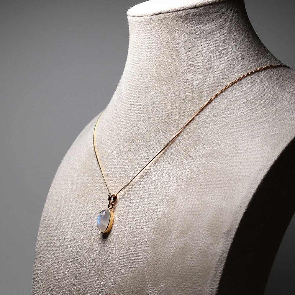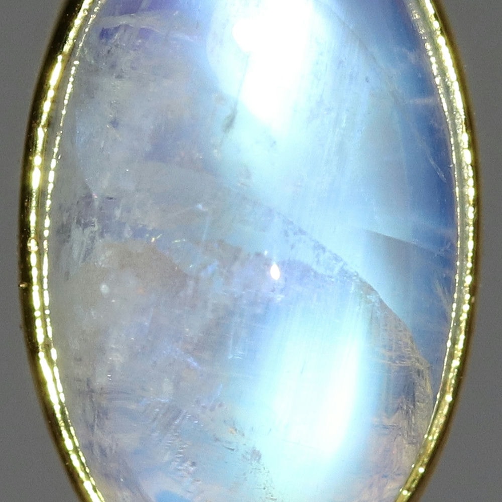 透明感のある白石に浮かび上がる光(ラブラドレッセンス)は、角度によって表情を変え、まるで月の光を閉じ込めたかのような幻想的な美しさをお楽しみいただけます。