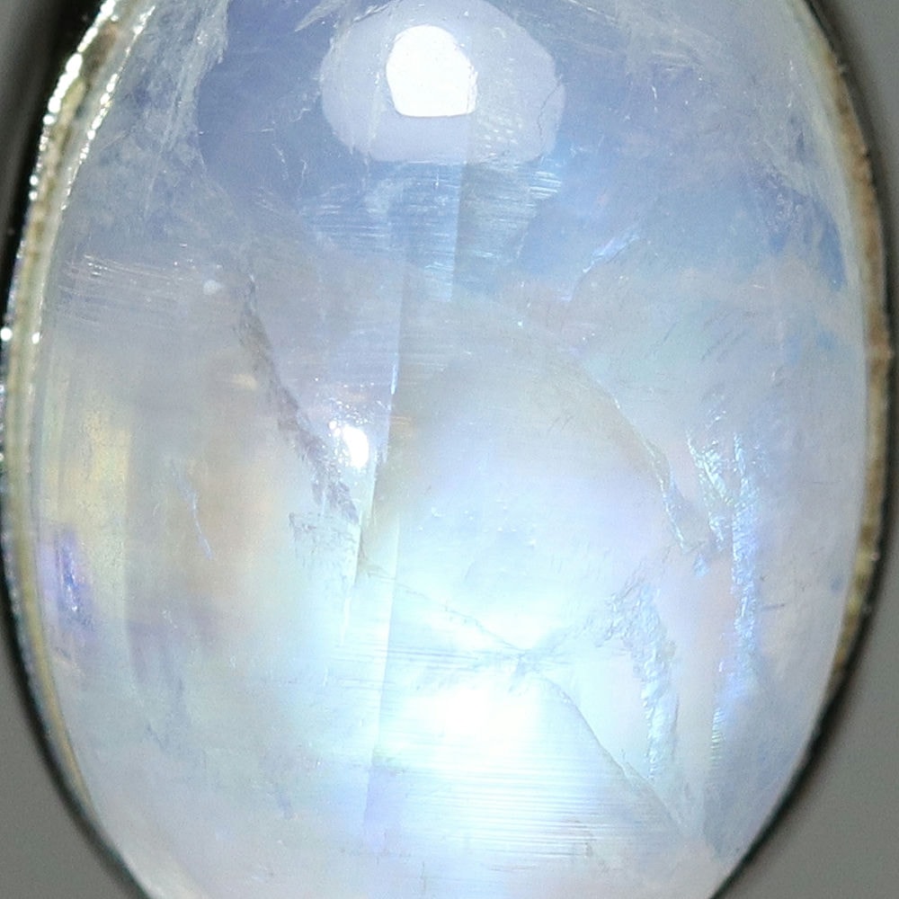 透明感のある白石に浮かび上がる光(ラブラドレッセンス)は、角度によって表情を変え、まるで月の光を閉じ込めたかのような幻想的な美しさをお楽しみいただけます。