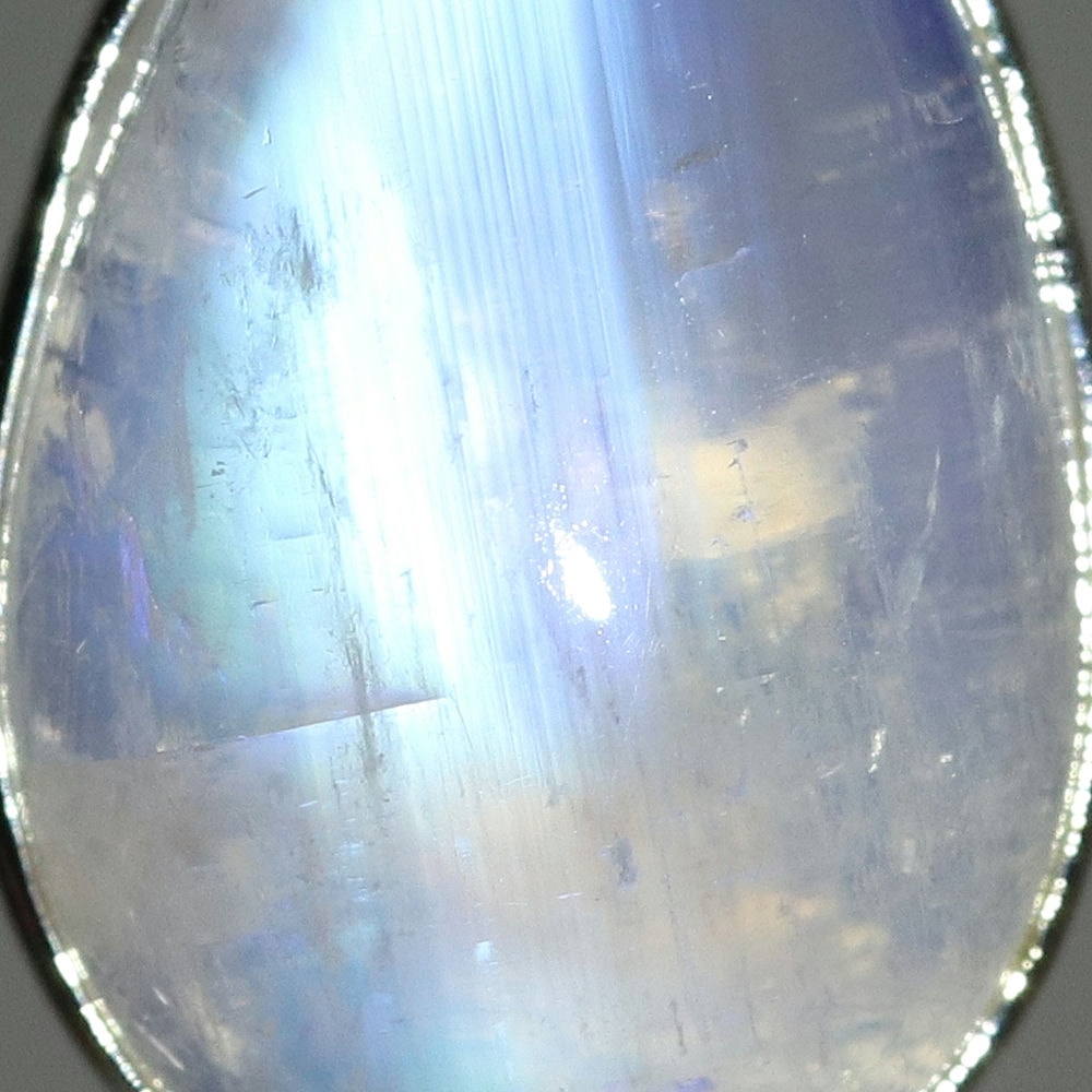 透明感のある白石に浮かび上がる光(ラブラドレッセンス)は、角度によって表情を変え、まるで月の光を閉じ込めたかのような幻想的な美しさをお楽しみいただけます。
