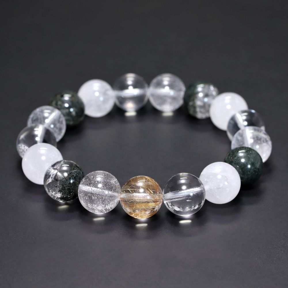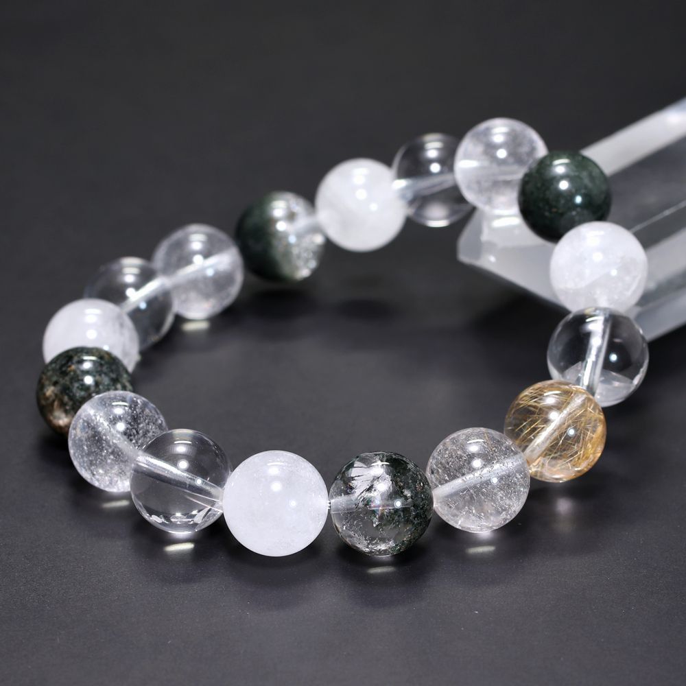 ご覧のお品は、緑色のクローライト、黄金色に輝くルチルクォーツ、そして澄み渡る透明感と柔らかな白を帯びたヒマラヤ水晶を、一連のブレスレットとして贅沢に組み上げた特選ミックスタイプでございます。