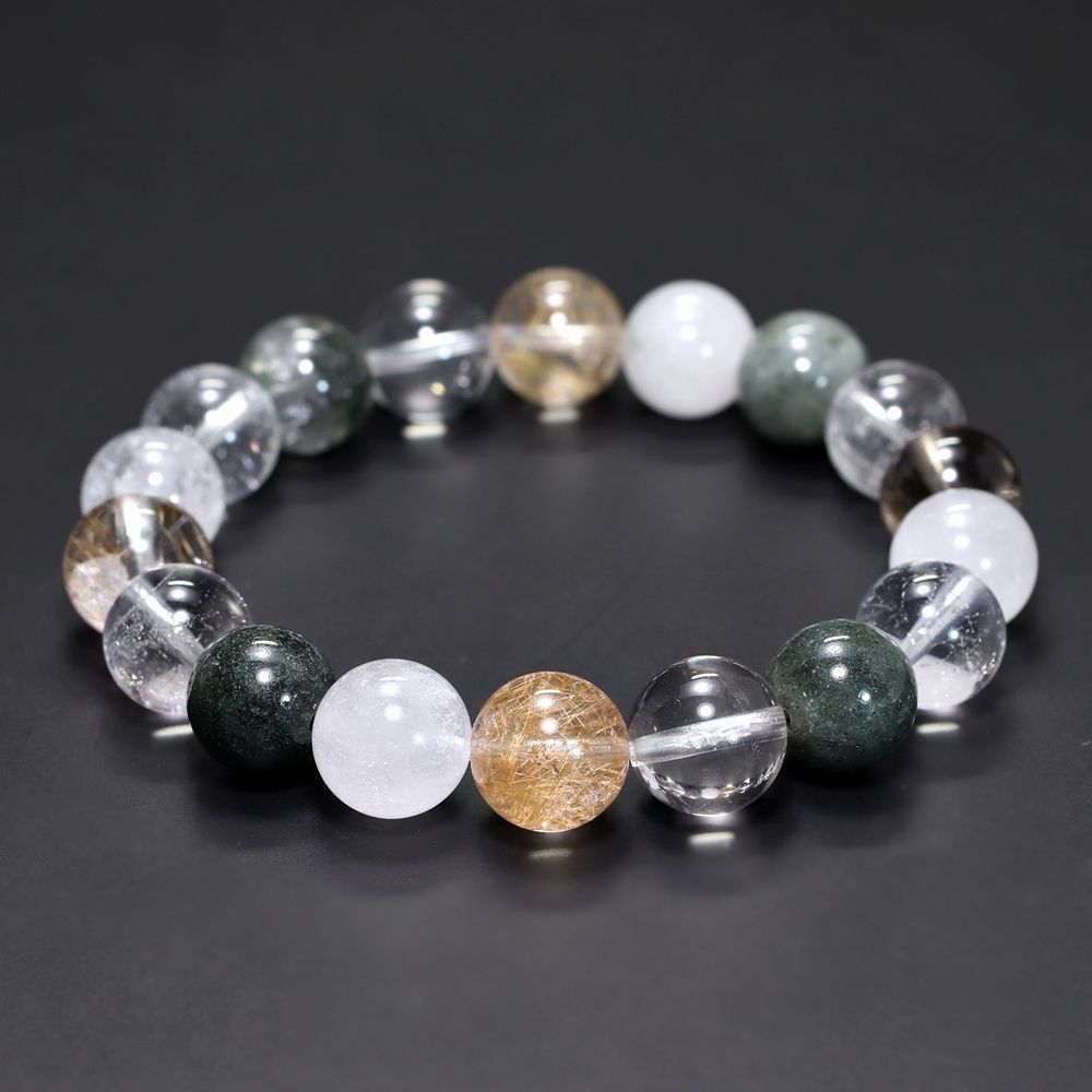 ご覧のお品は、緑色のクローライト、黄金色に輝くルチルクォーツ、そして澄み渡る透明感と柔らかな白を帯びたヒマラヤ水晶を、一連のブレスレットとして贅沢に組み上げた特選ミックスタイプでございます。
