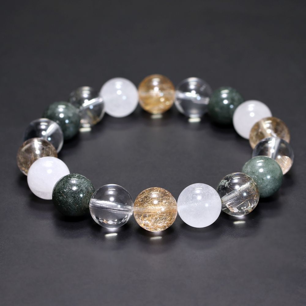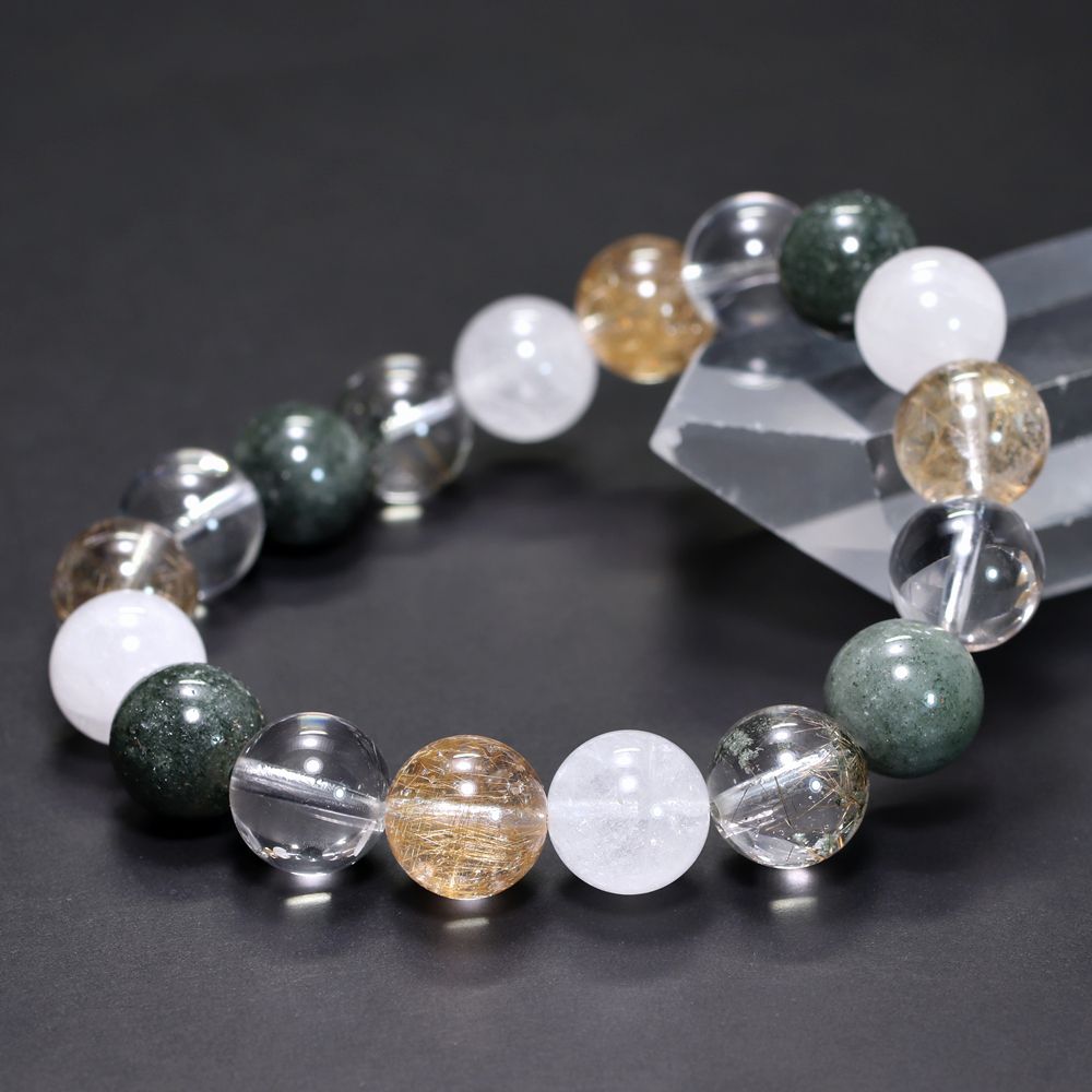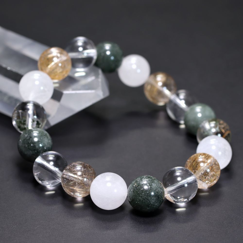 ご覧のお品は、緑色のクローライト、黄金色に輝くルチルクォーツ、そして澄み渡る透明感と柔らかな白を帯びたヒマラヤ水晶を、一連のブレスレットとして贅沢に組み上げた特選ミックスタイプでございます。