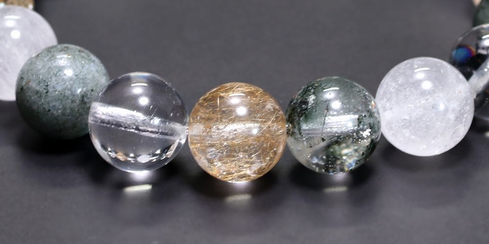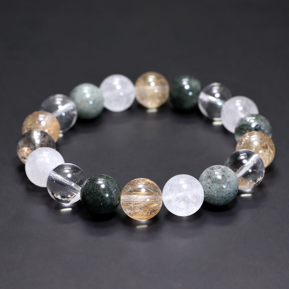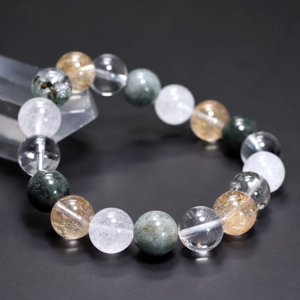ご覧のお品は、緑色のクローライト、黄金色に輝くルチルクォーツ、そして澄み渡る透明感と柔らかな白を帯びたヒマラヤ水晶を、一連のブレスレットとして贅沢に組み上げた特選ミックスタイプでございます。
