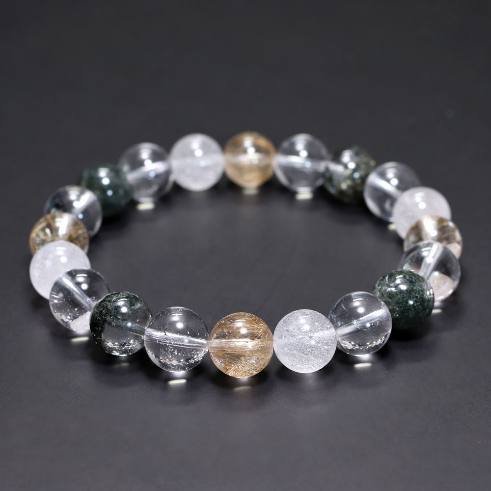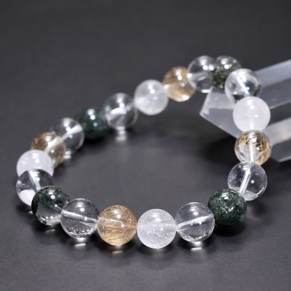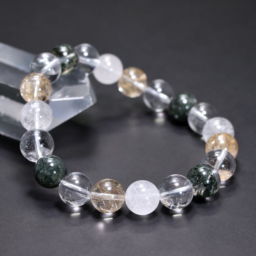 ご覧のお品は、緑色のクローライト、黄金色に輝くルチルクォーツ、そして澄み渡る透明感と柔らかな白を帯びたヒマラヤ水晶を、一連のブレスレットとして贅沢に組み上げた特選ミックスタイプでございます。