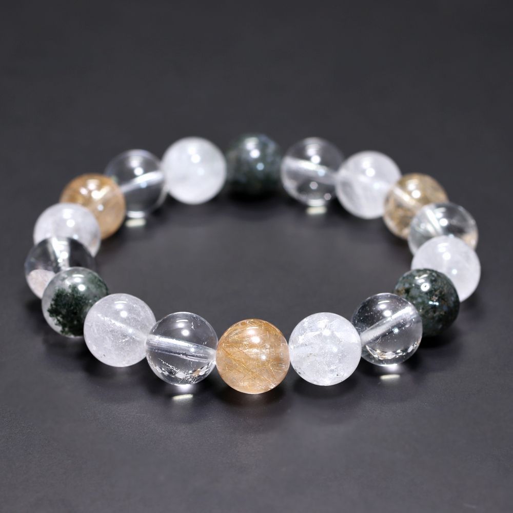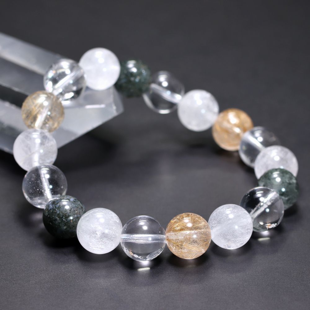 ご覧のお品は、緑色のクローライト、黄金色に輝くルチルクォーツ、そして澄み渡る透明感と柔らかな白を帯びたヒマラヤ水晶を、一連のブレスレットとして贅沢に組み上げた特選ミックスタイプでございます。