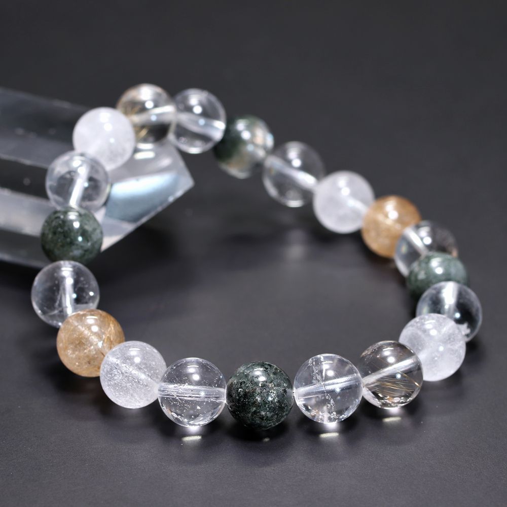 ご覧のお品は、緑色のクローライト、黄金色に輝くルチルクォーツ、そして澄み渡る透明感と柔らかな白を帯びたヒマラヤ水晶を、一連のブレスレットとして贅沢に組み上げた特選ミックスタイプでございます。