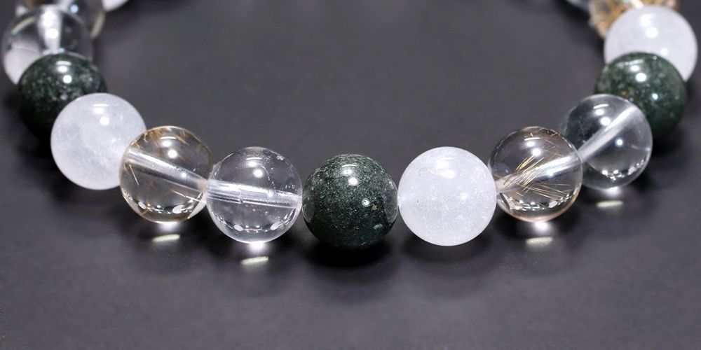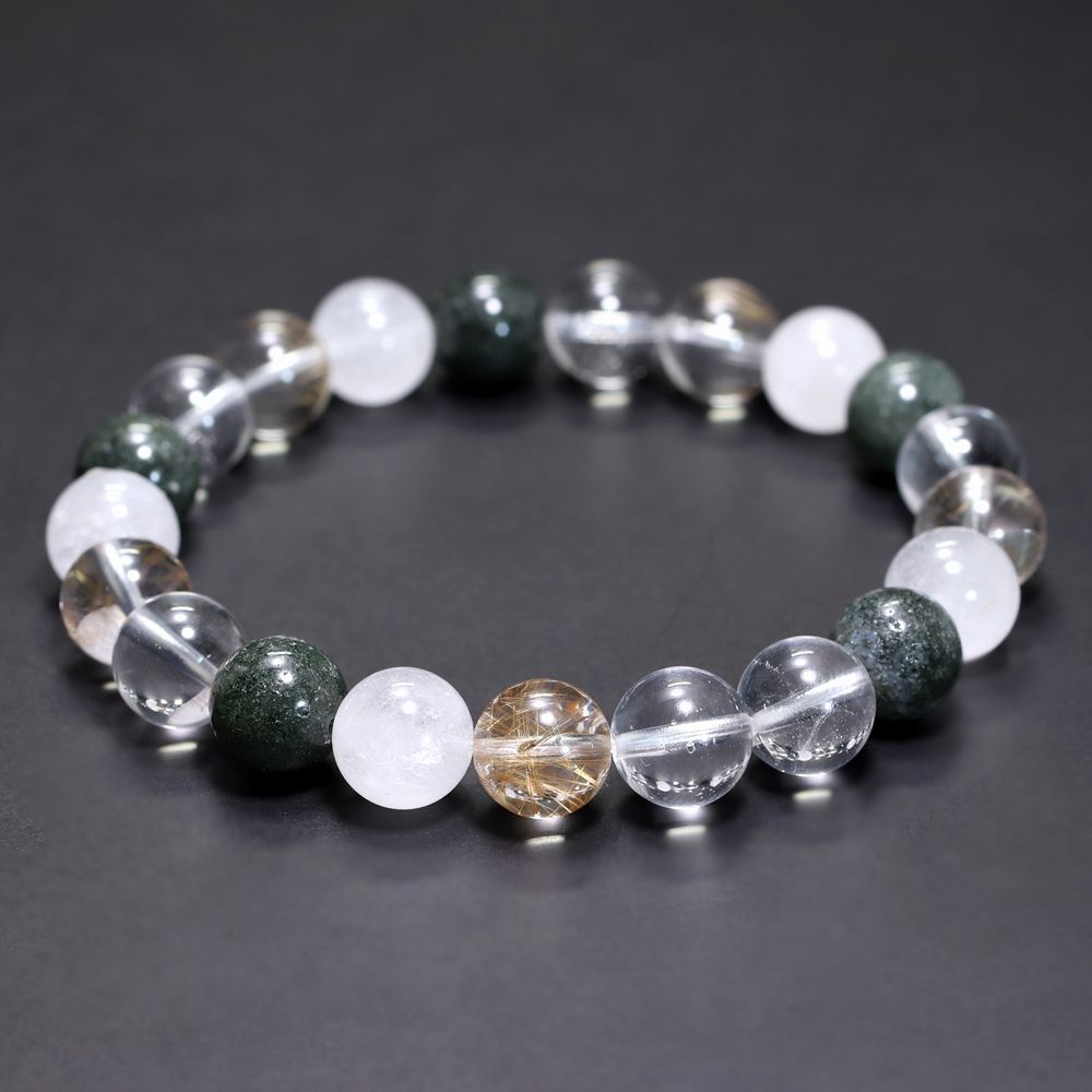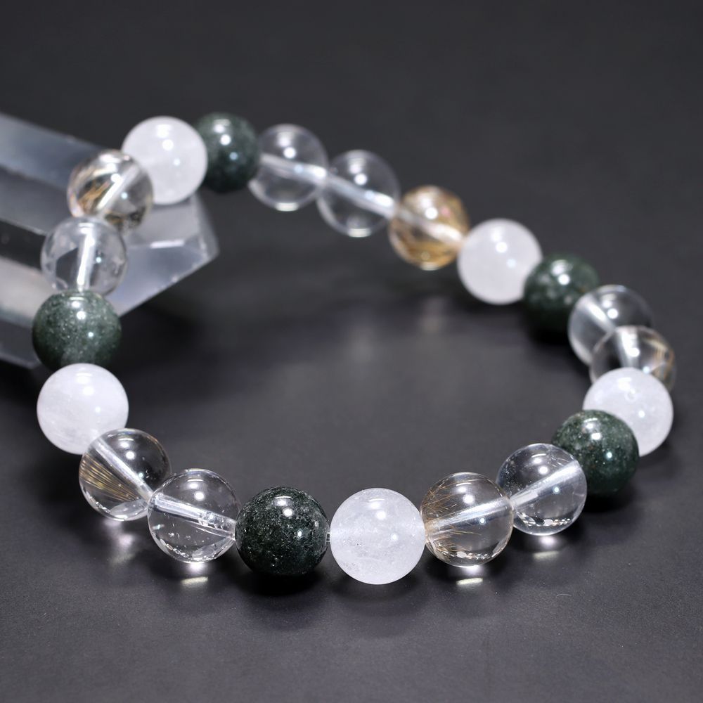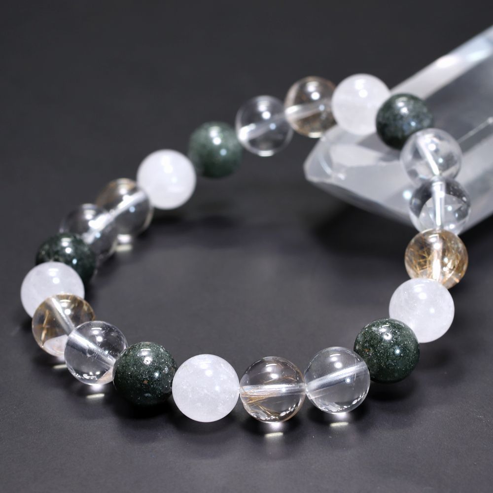 ご覧のお品は、緑色のクローライト、黄金色に輝くルチルクォーツ、そして澄み渡る透明感と柔らかな白を帯びたヒマラヤ水晶を、一連のブレスレットとして贅沢に組み上げた特選ミックスタイプでございます。