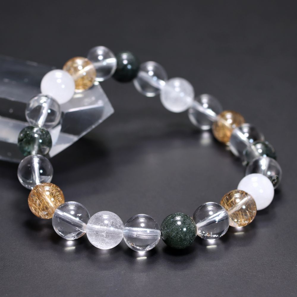 ご覧のお品は、緑色のクローライト、黄金色に輝くルチルクォーツ、そして澄み渡る透明感と柔らかな白を帯びたヒマラヤ水晶を、一連のブレスレットとして贅沢に組み上げた特選ミックスタイプでございます。