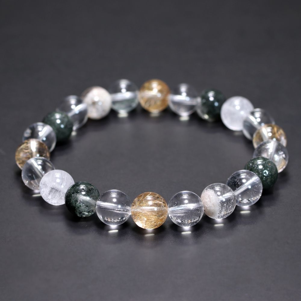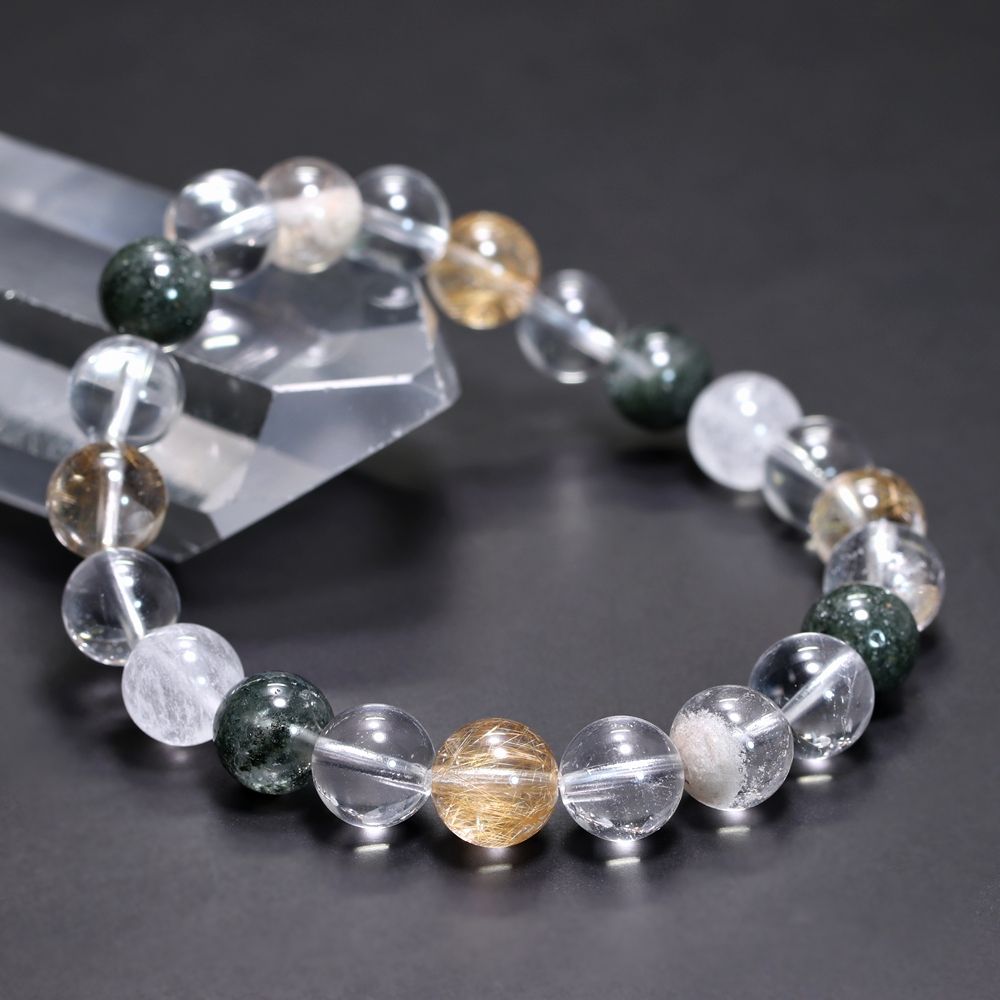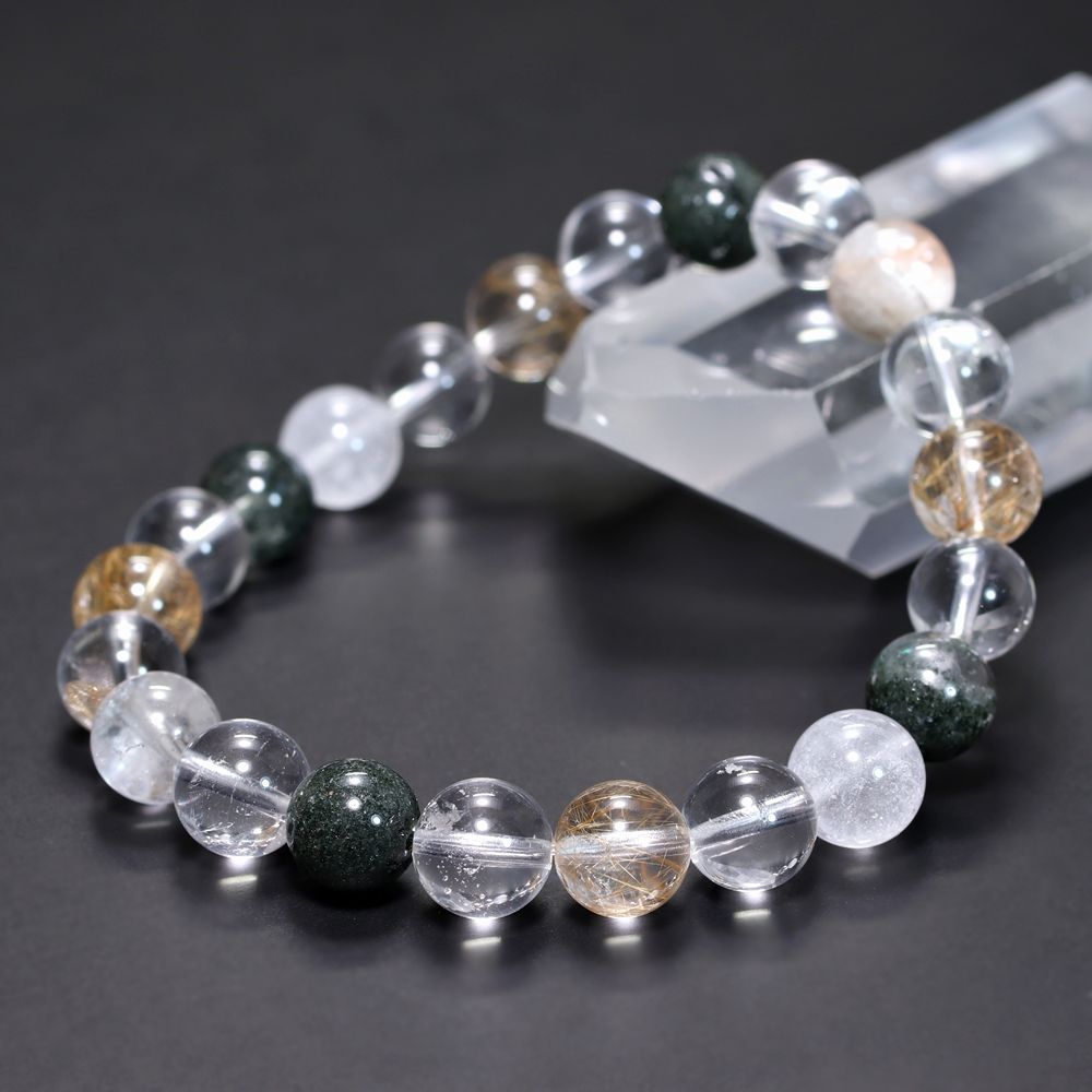 ご覧のお品は、緑色のクローライト、黄金色に輝くルチルクォーツ、そして澄み渡る透明感と柔らかな白を帯びたヒマラヤ水晶を、一連のブレスレットとして贅沢に組み上げた特選ミックスタイプでございます。