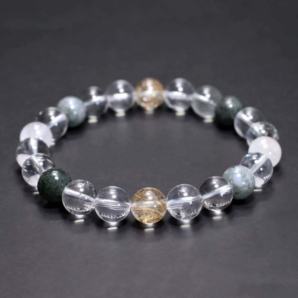 ご覧のお品は、緑色のクローライト、黄金色に輝くルチルクォーツ、そして澄み渡る透明感と柔らかな白を帯びたヒマラヤ水晶を、一連のブレスレットとして贅沢に組み上げた特選ミックスタイプでございます。