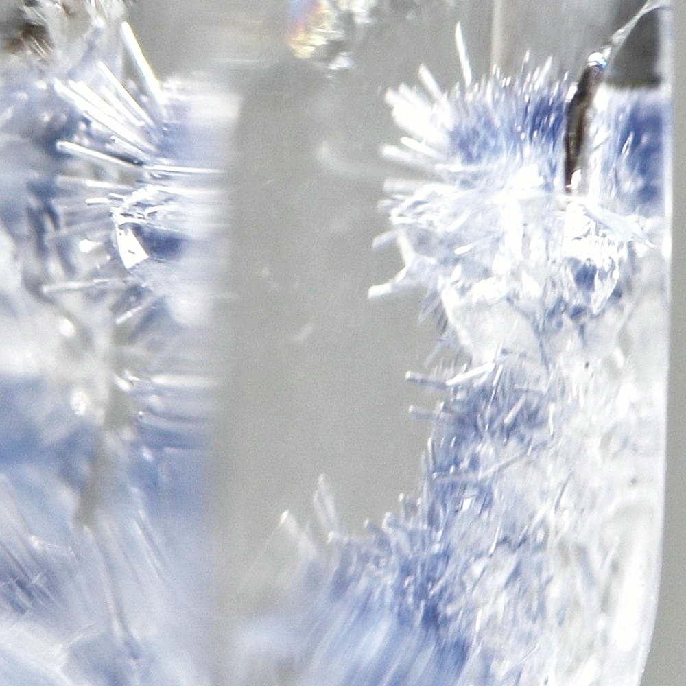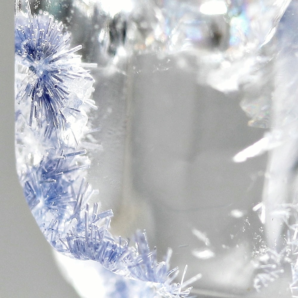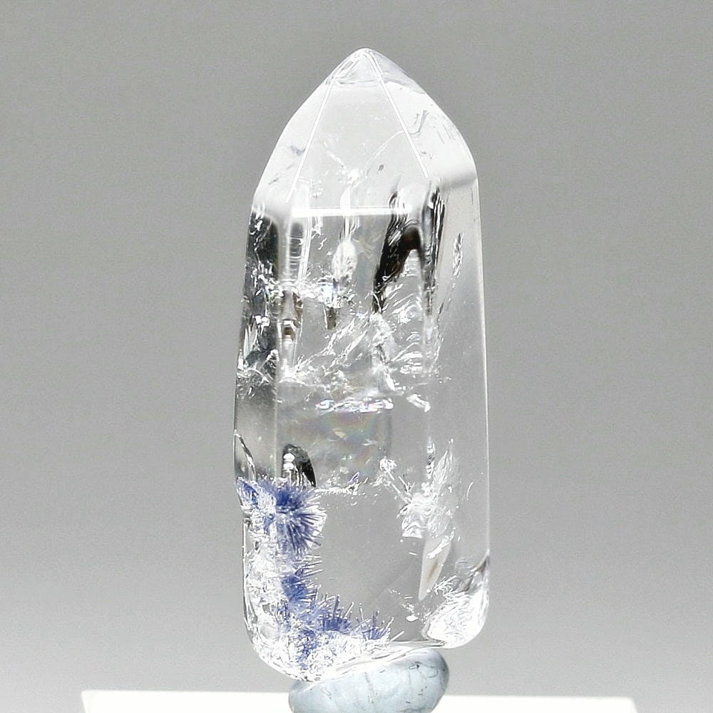 ご覧のお品は、クリアな水晶に鮮やかな青色の結晶が底部から内部へと見られ、特有の細やかな針状結晶の表情までも確認できる、見応えのある逸品です。美しい天然レインボーも見逃せません。