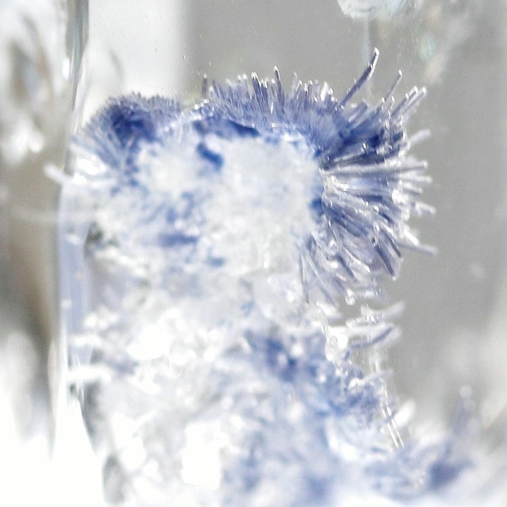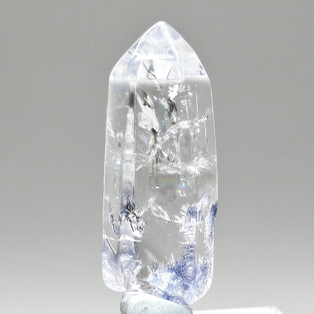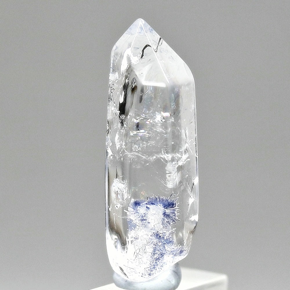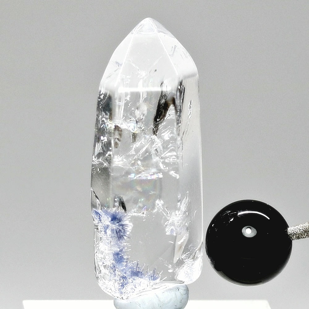 ご覧のお品は、クリアな水晶に鮮やかな青色の結晶が底部から内部へと見られ、特有の細やかな針状結晶の表情までも確認できる、見応えのある逸品です。美しい天然レインボーも見逃せません。