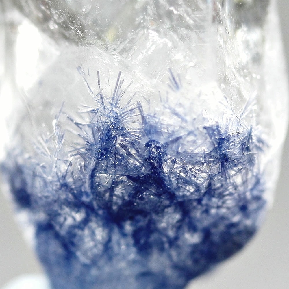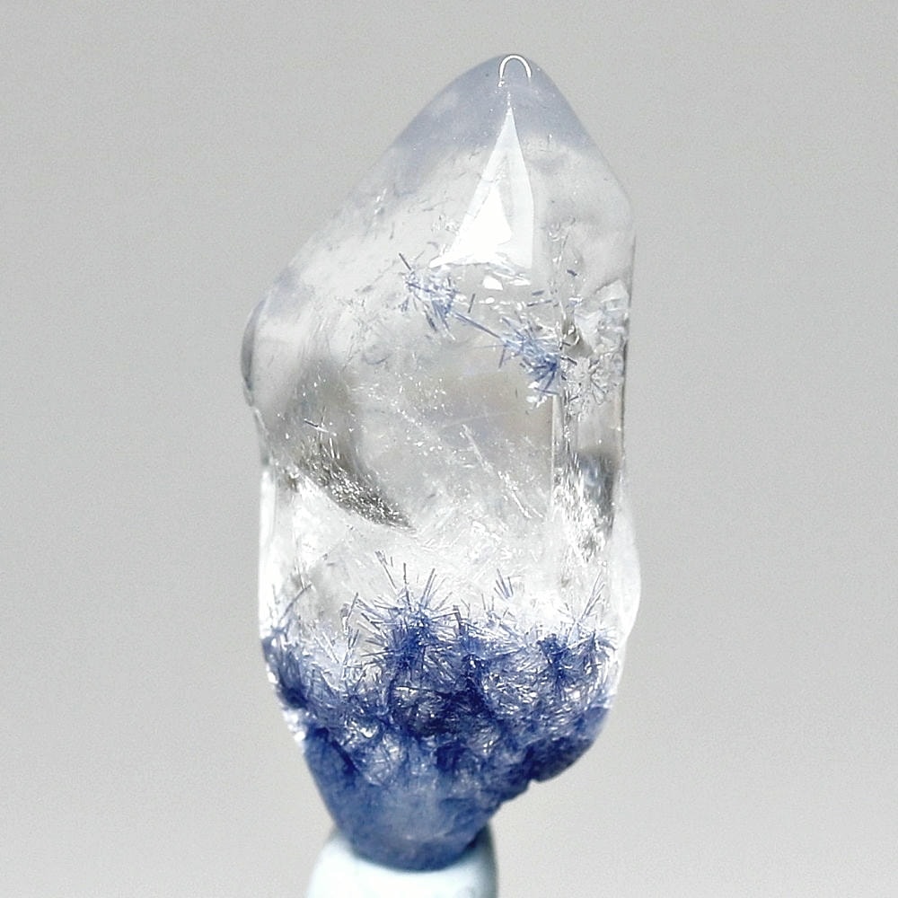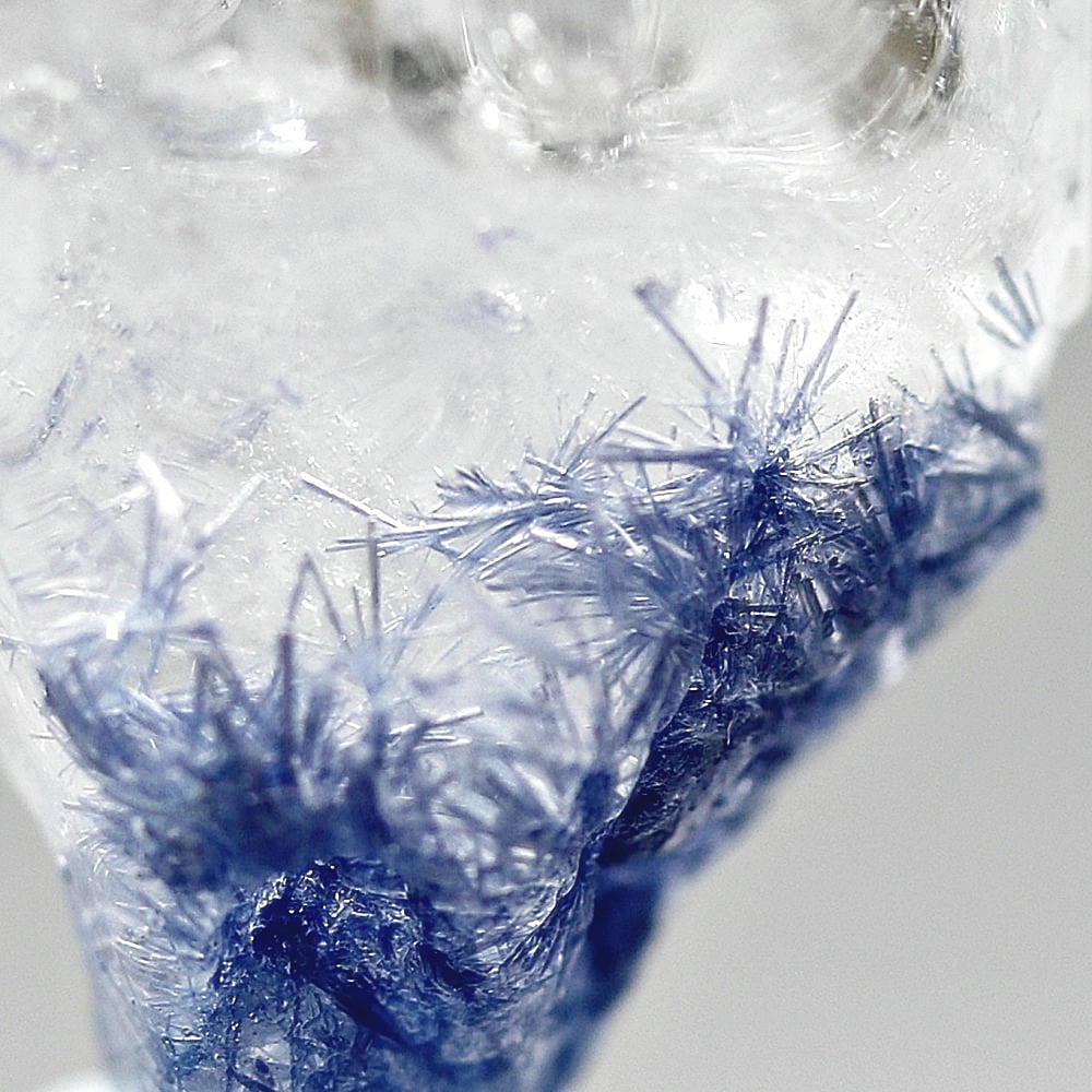 ご覧のお品は、クリアな水晶に鮮やかな青色の結晶が底部から内部へと見られ、特有の細やかな針状結晶の表情までも確認できる、見応えのある逸品です。