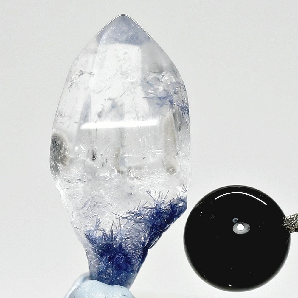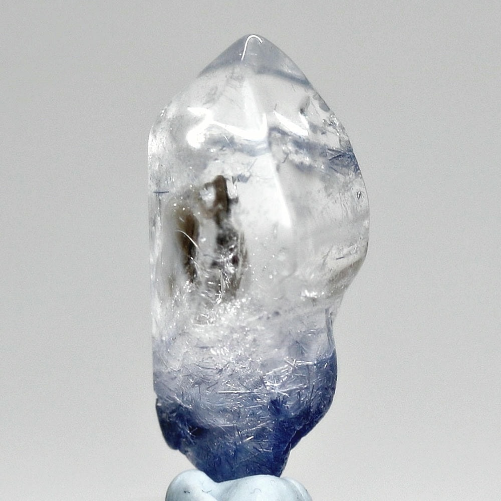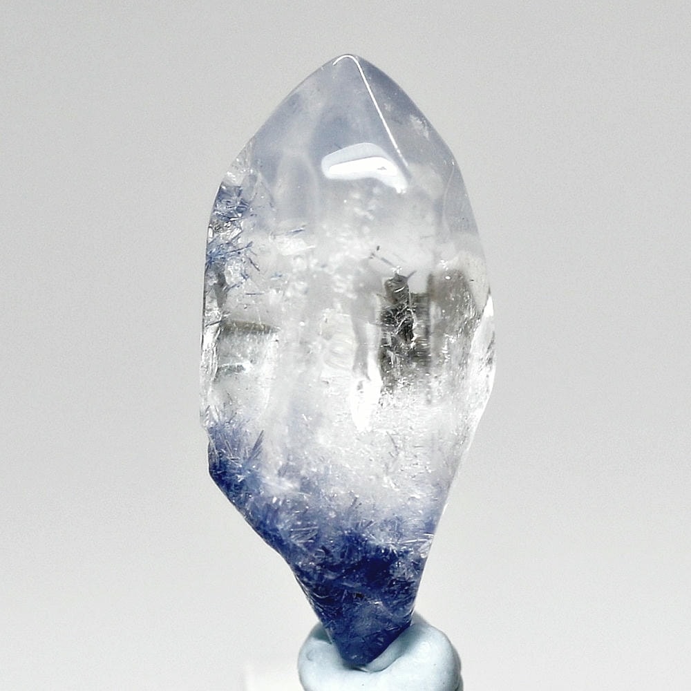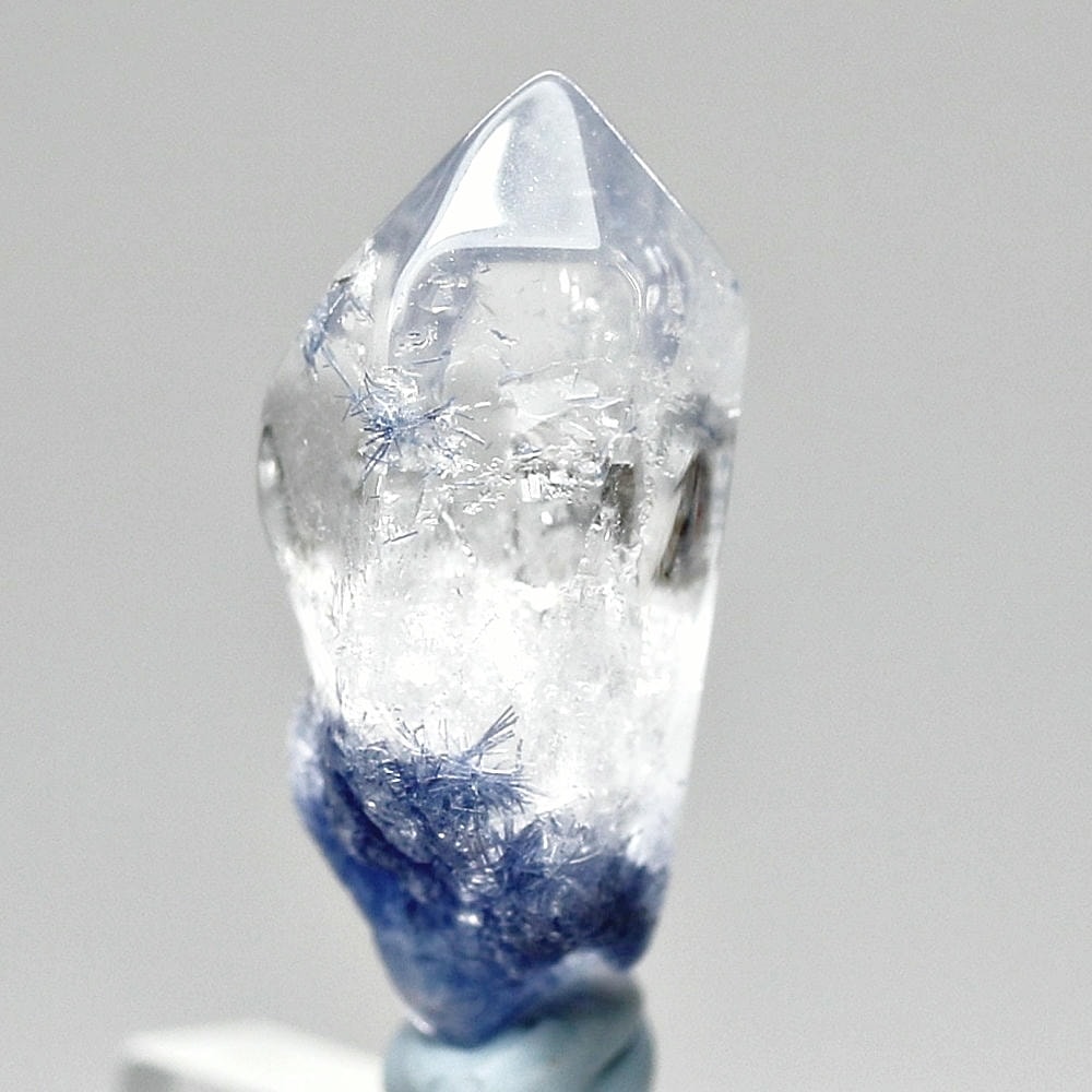 ご覧のお品は、クリアな水晶に鮮やかな青色の結晶が底部から内部へと見られ、特有の細やかな針状結晶の表情までも確認できる、見応えのある逸品です。