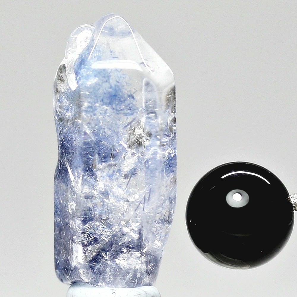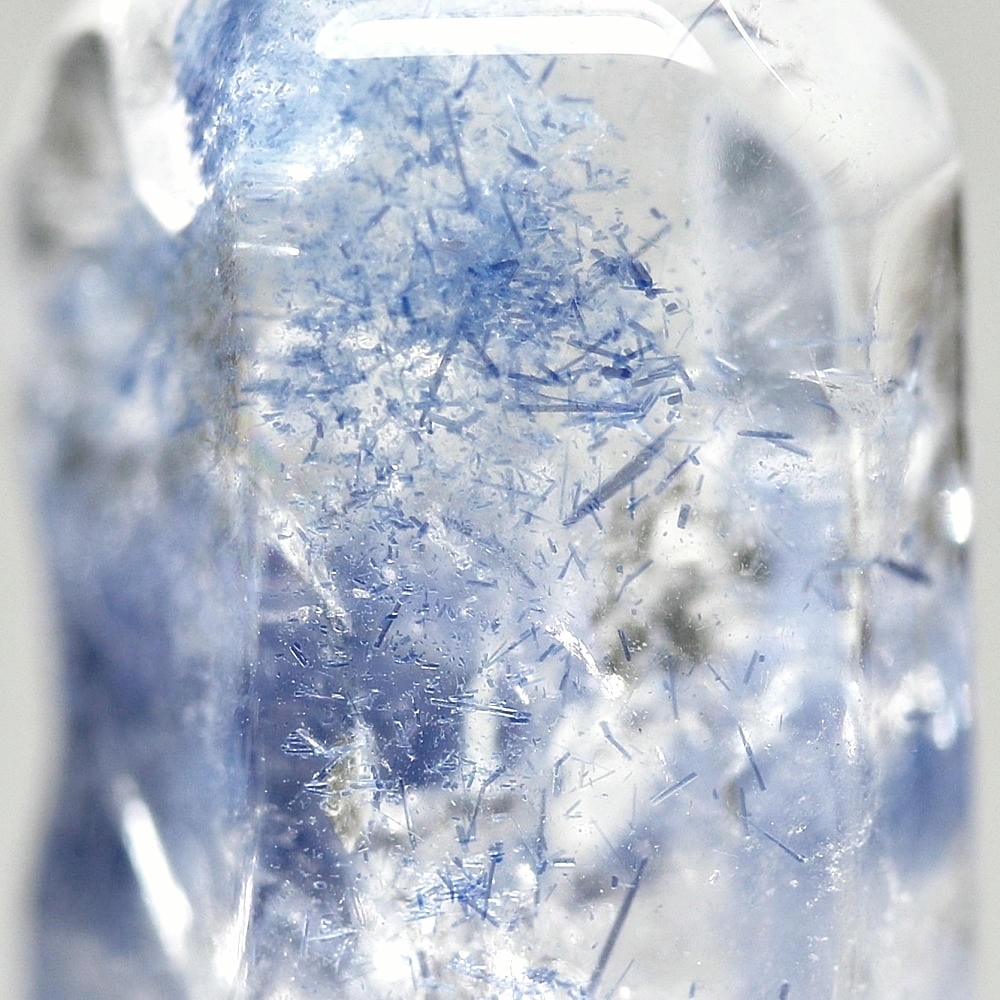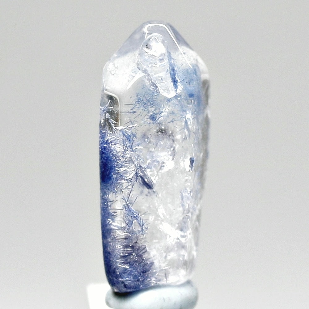 ご覧のお品は、クリアな水晶に鮮やかな青色の結晶が側面から内部へと見られ、特有の細やかな針状結晶の表情までも確認できる、見応えのある逸品です。天然レインボーも見逃せません。