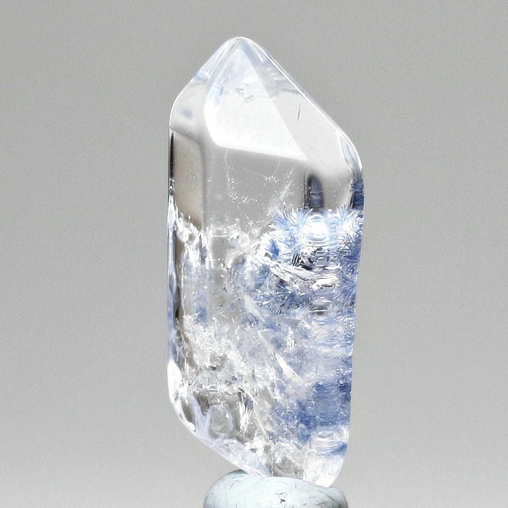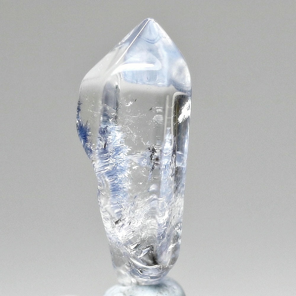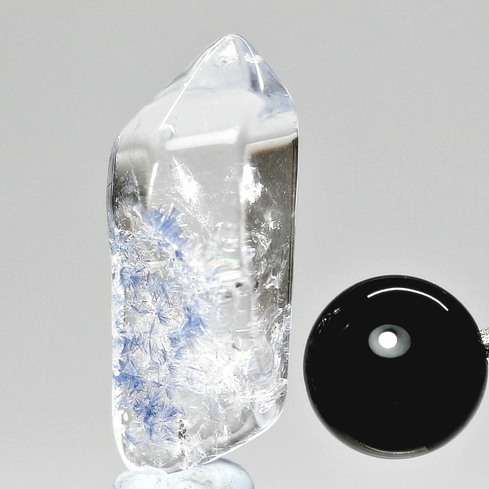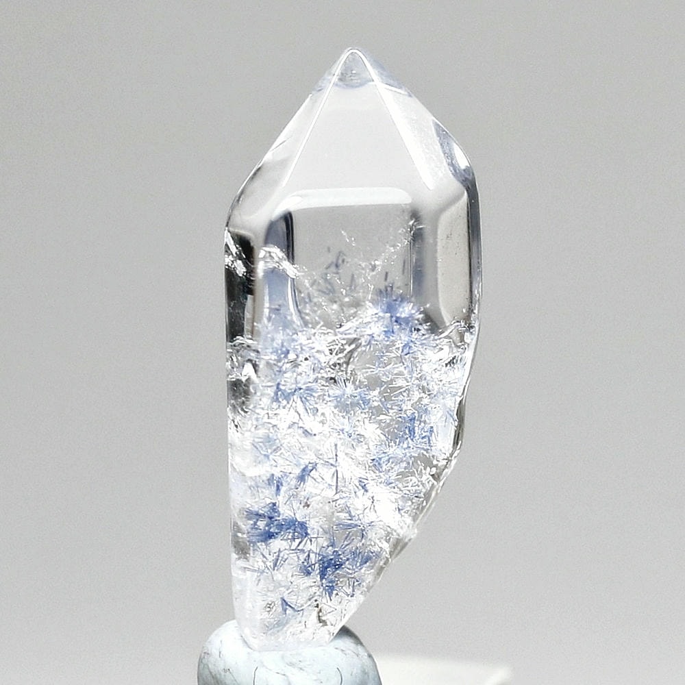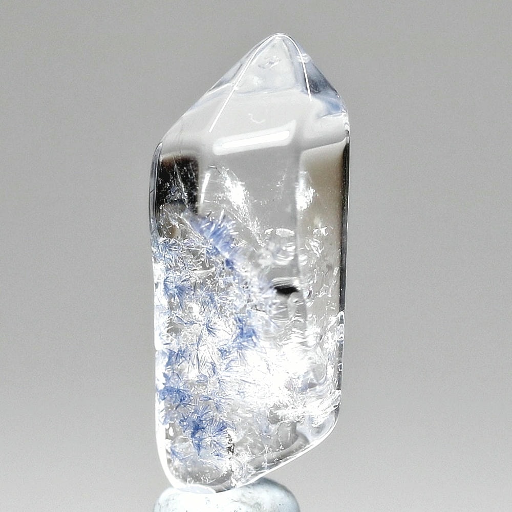 ご覧のお品は、クリアな水晶に鮮やかな青色の結晶が底部から内部へと見られ、特有の細やかな針状結晶の表情までも確認できる、見応えのある逸品です。