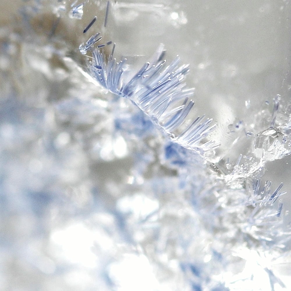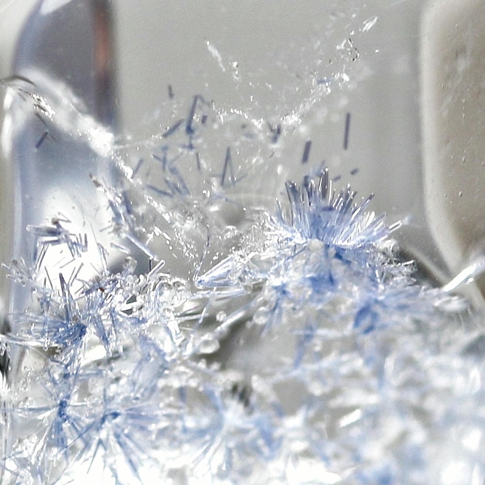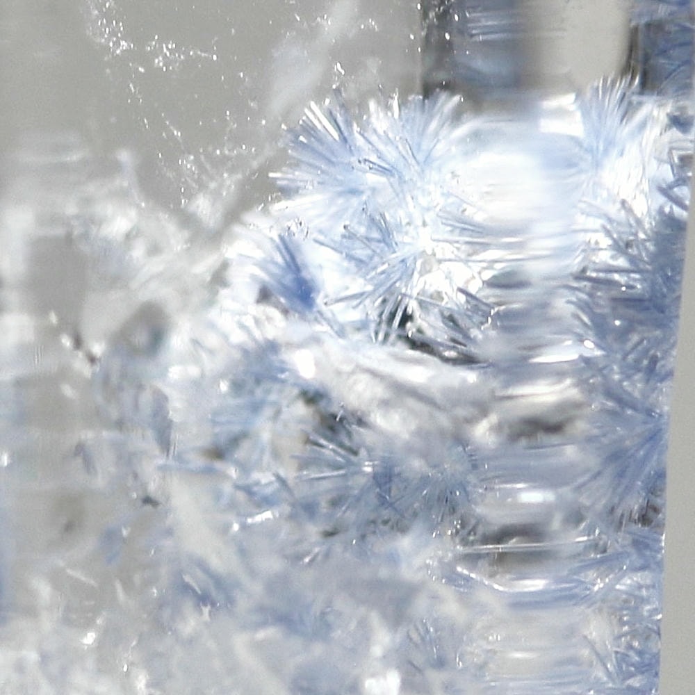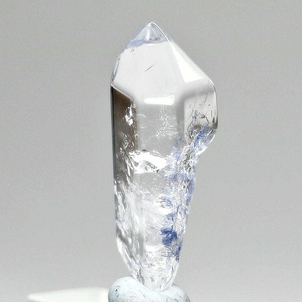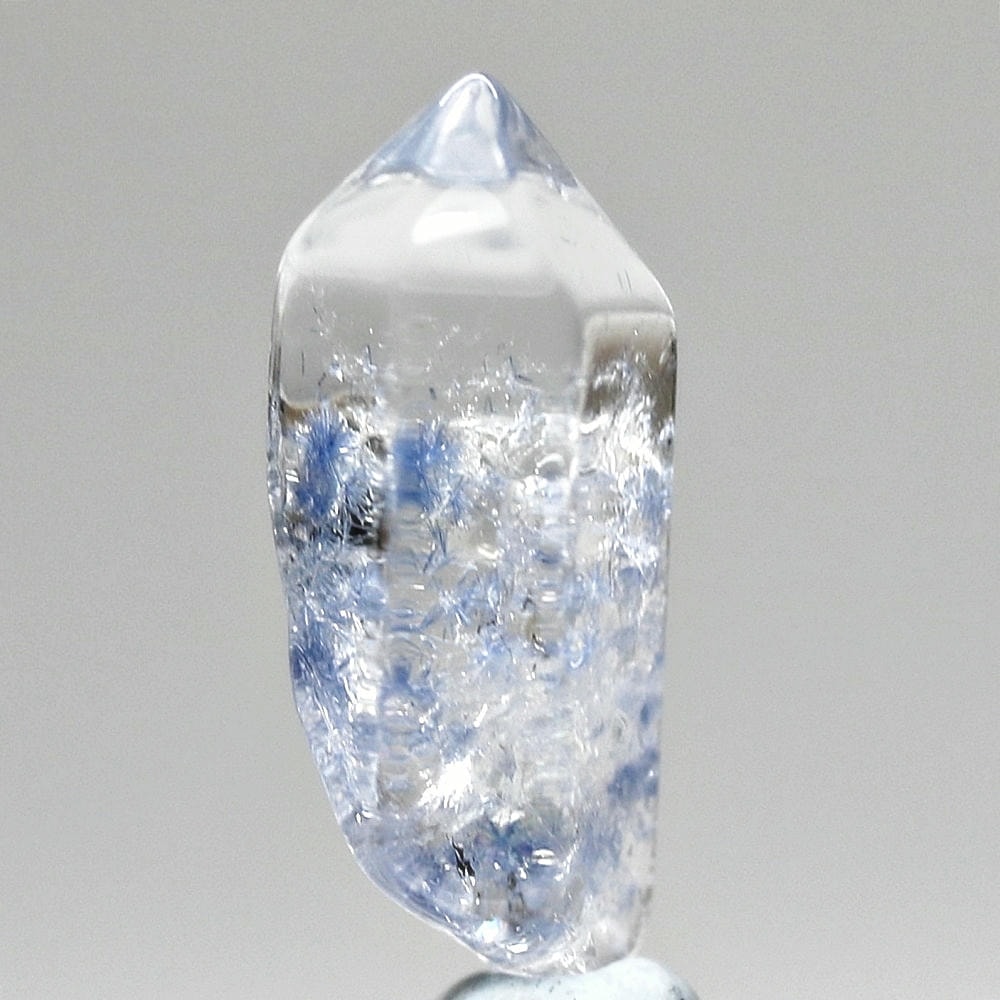 ご覧のお品は、クリアな水晶に鮮やかな青色の結晶が底部から内部へと見られ、特有の細やかな針状結晶の表情までも確認できる、見応えのある逸品です。