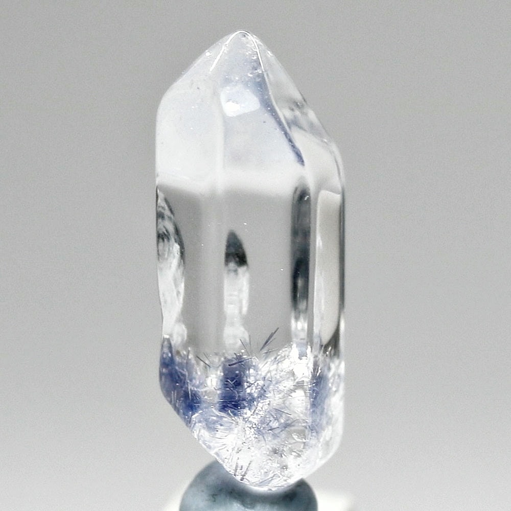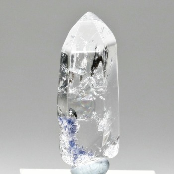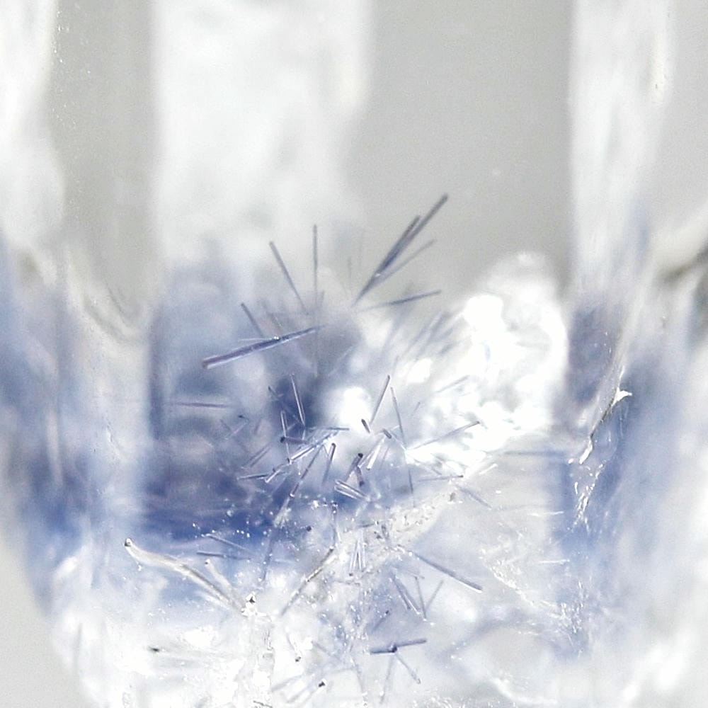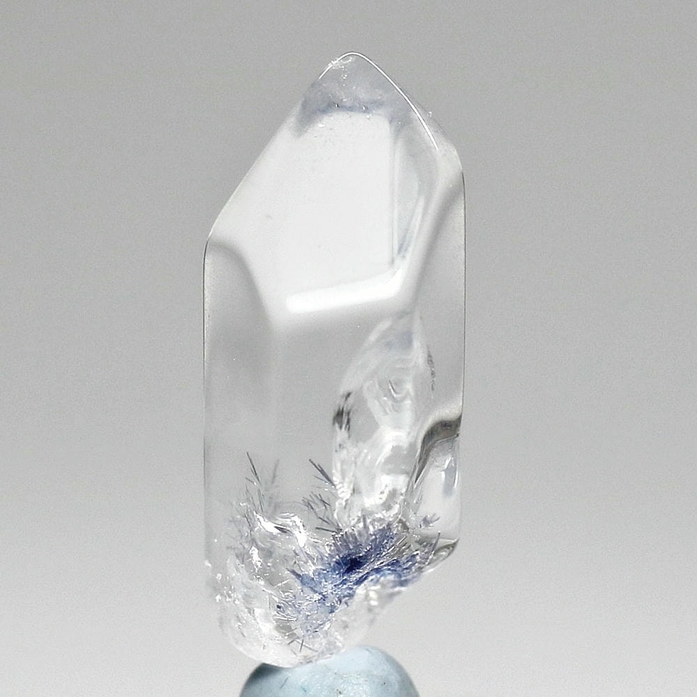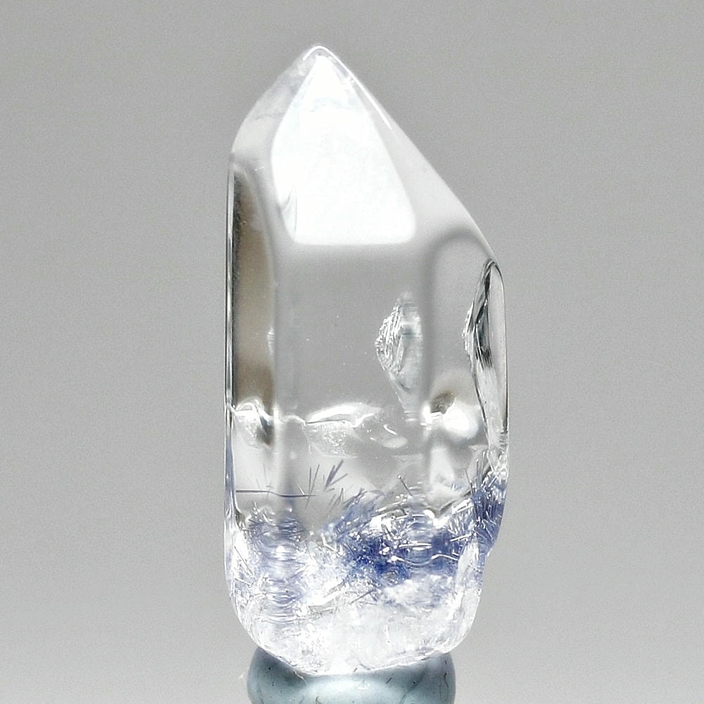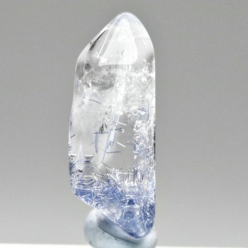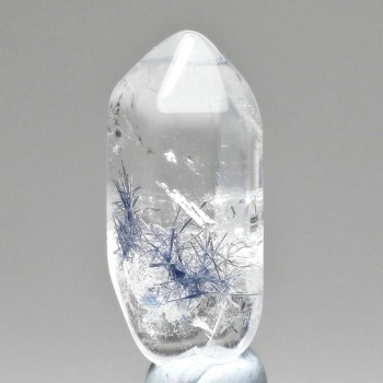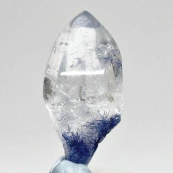 ご覧のお品は、クリアな水晶に鮮やかな青色の結晶が底部から内部へと見られ、特有の細やかな針状結晶の表情までも確認できる、見応えのある逸品です。
