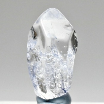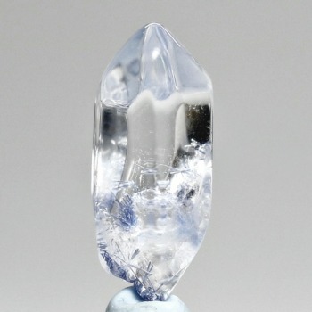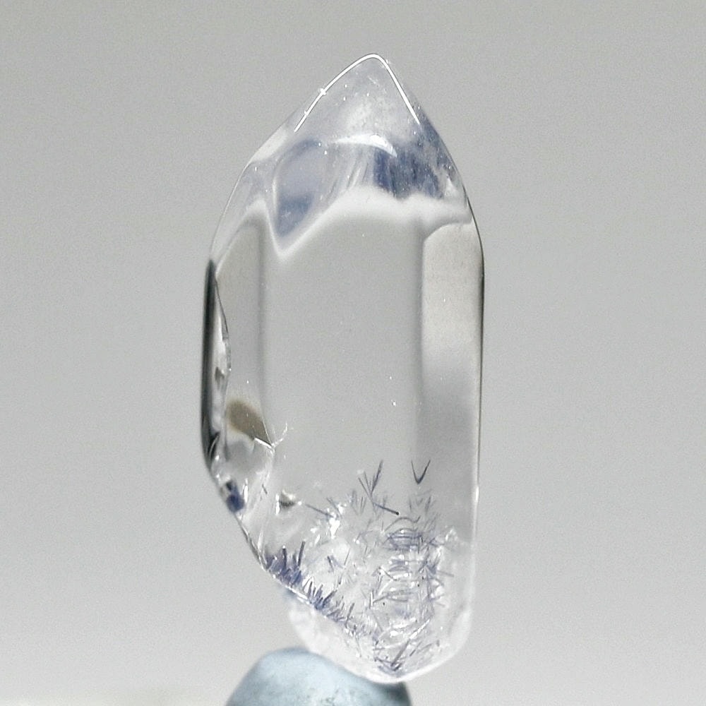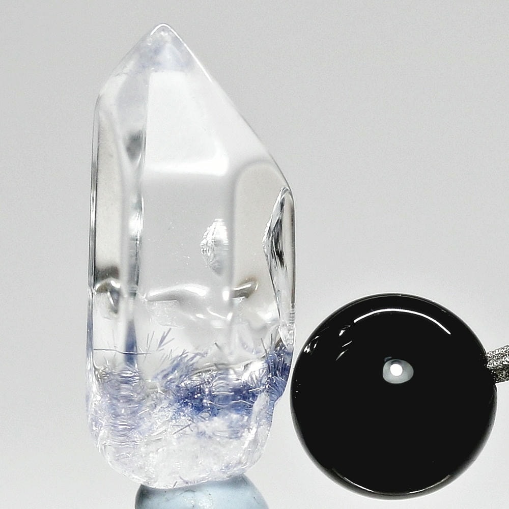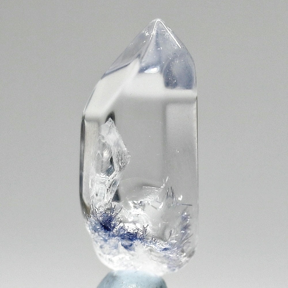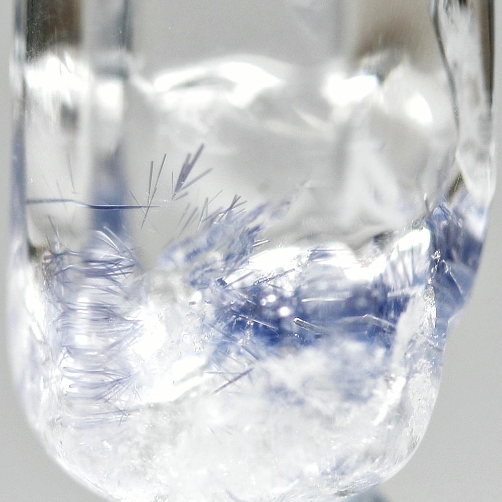 ご覧のお品は、クリアな水晶に鮮やかな青色の結晶が底部から内部へと見られ、特有の細やかな針状結晶の表情までも確認できる、見応えのある逸品です。